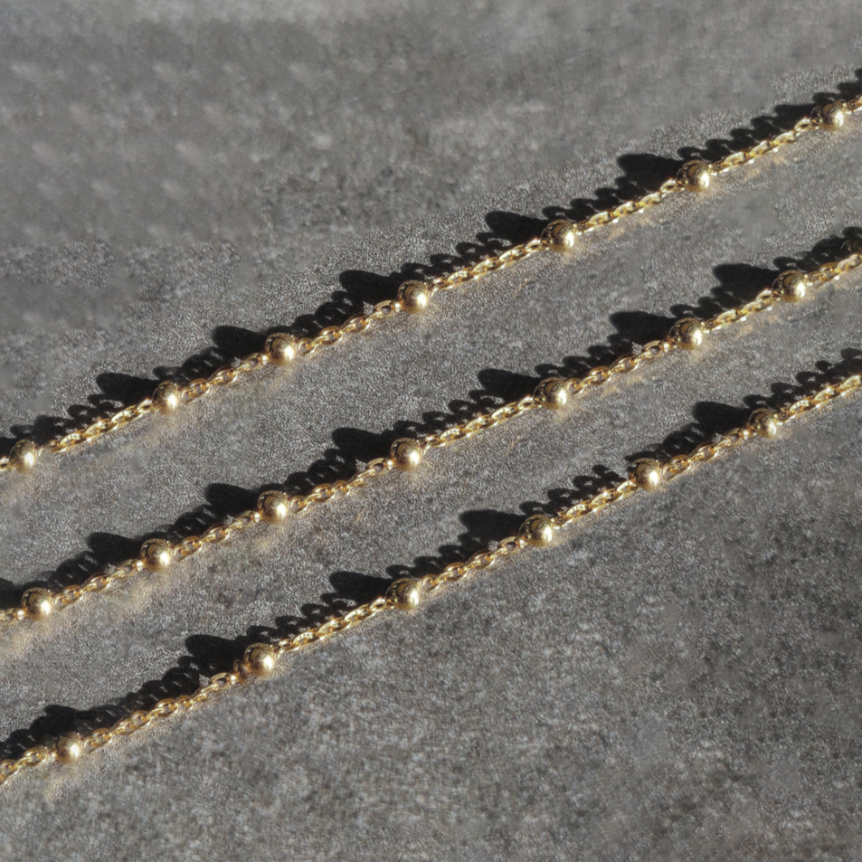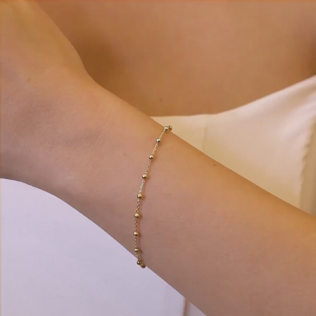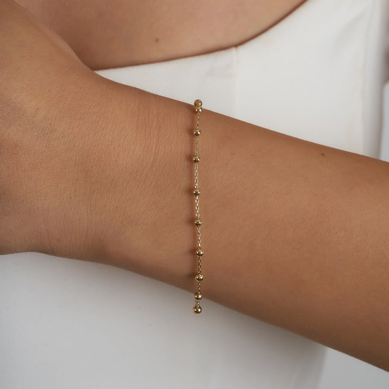 Crafted from high-quality 18K gold, this bracelet features gold balls that are spaced at regular intervals on a simple cable chain, creating a subtle yet eye-catching design. The lightweight construction makes it comfortable to wear all day long, while the timeless design ensures that it will remain a cherished piece for years to come.