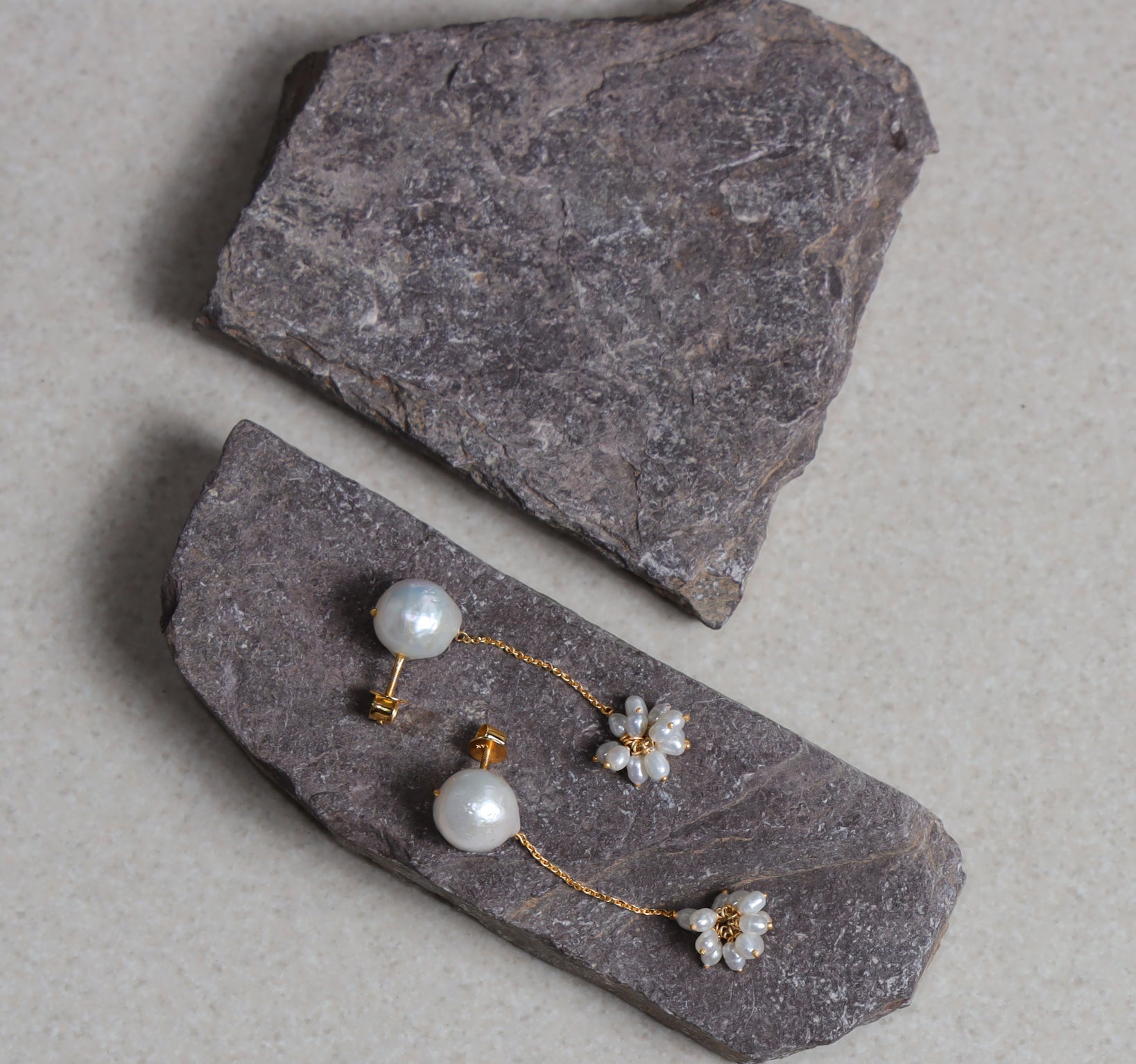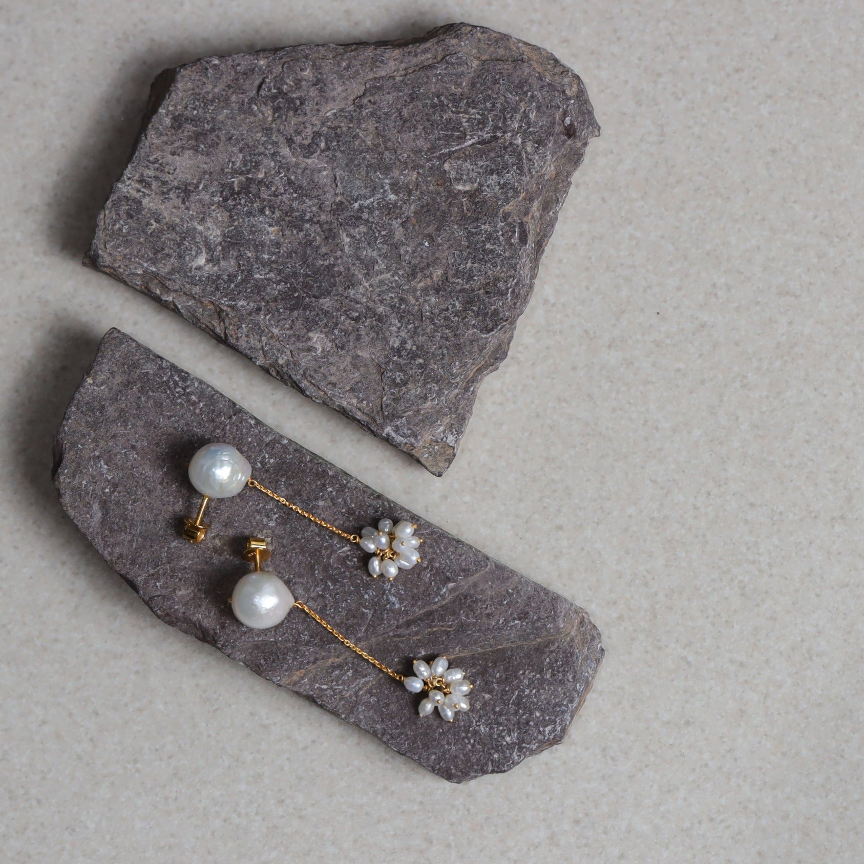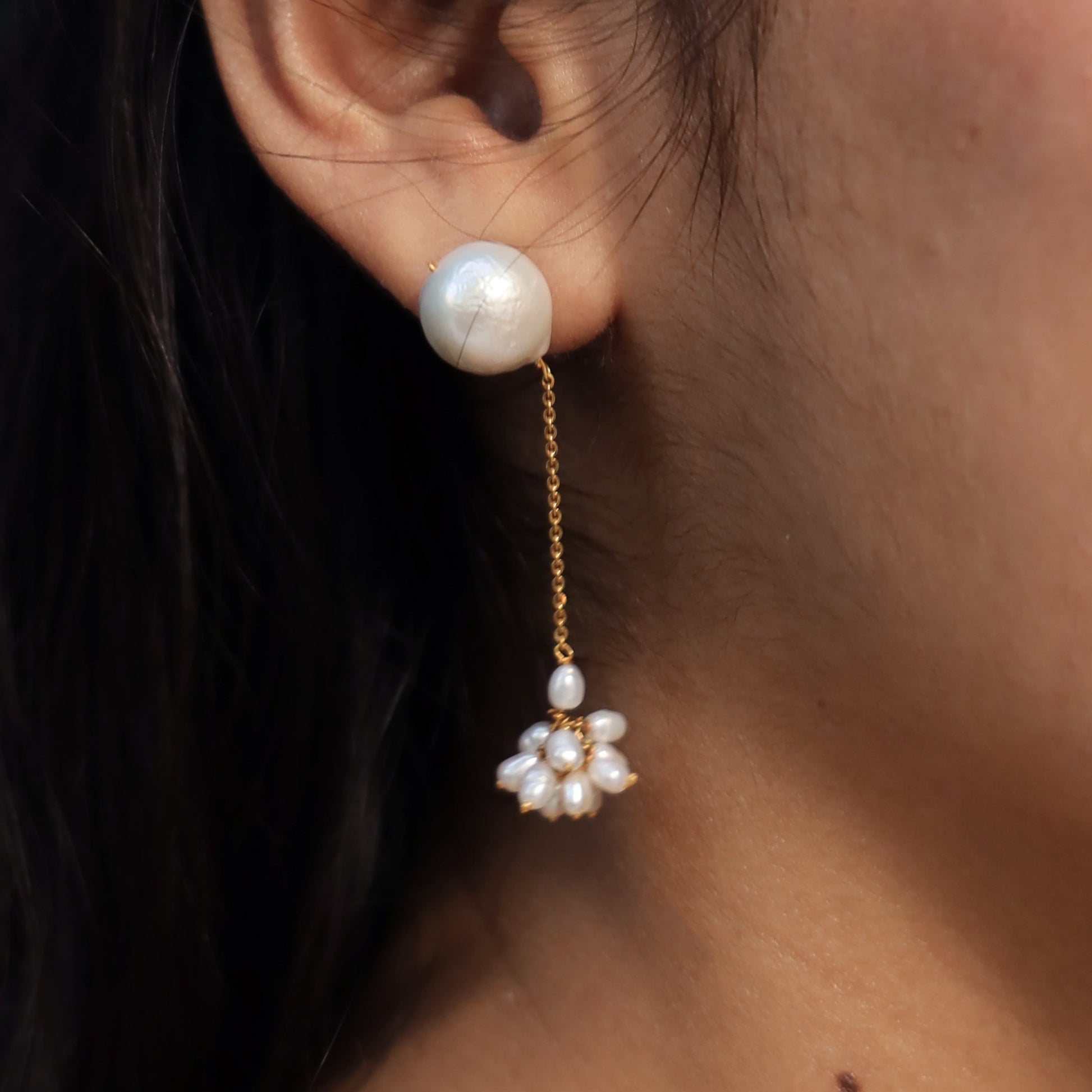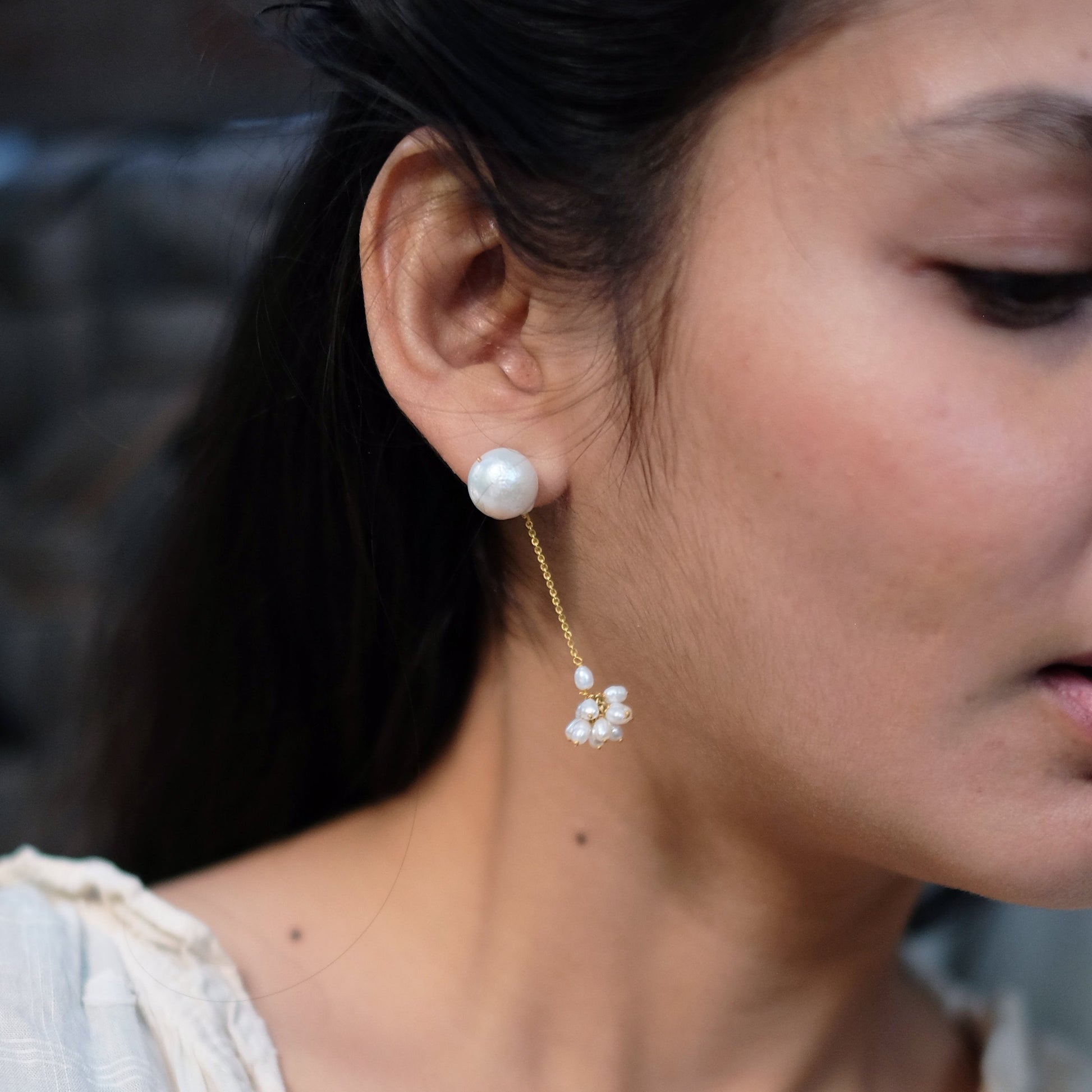 We love earrings with a little shimmy to them! Two delicate posy's of freshwater pearls are connected by a sparkling gold chain. A modern take on the classic pearl earring, inspired by Jasmines (Mogras); the Indian summer flowers, soaking up the summer sun. Available in 18kt solid gold.