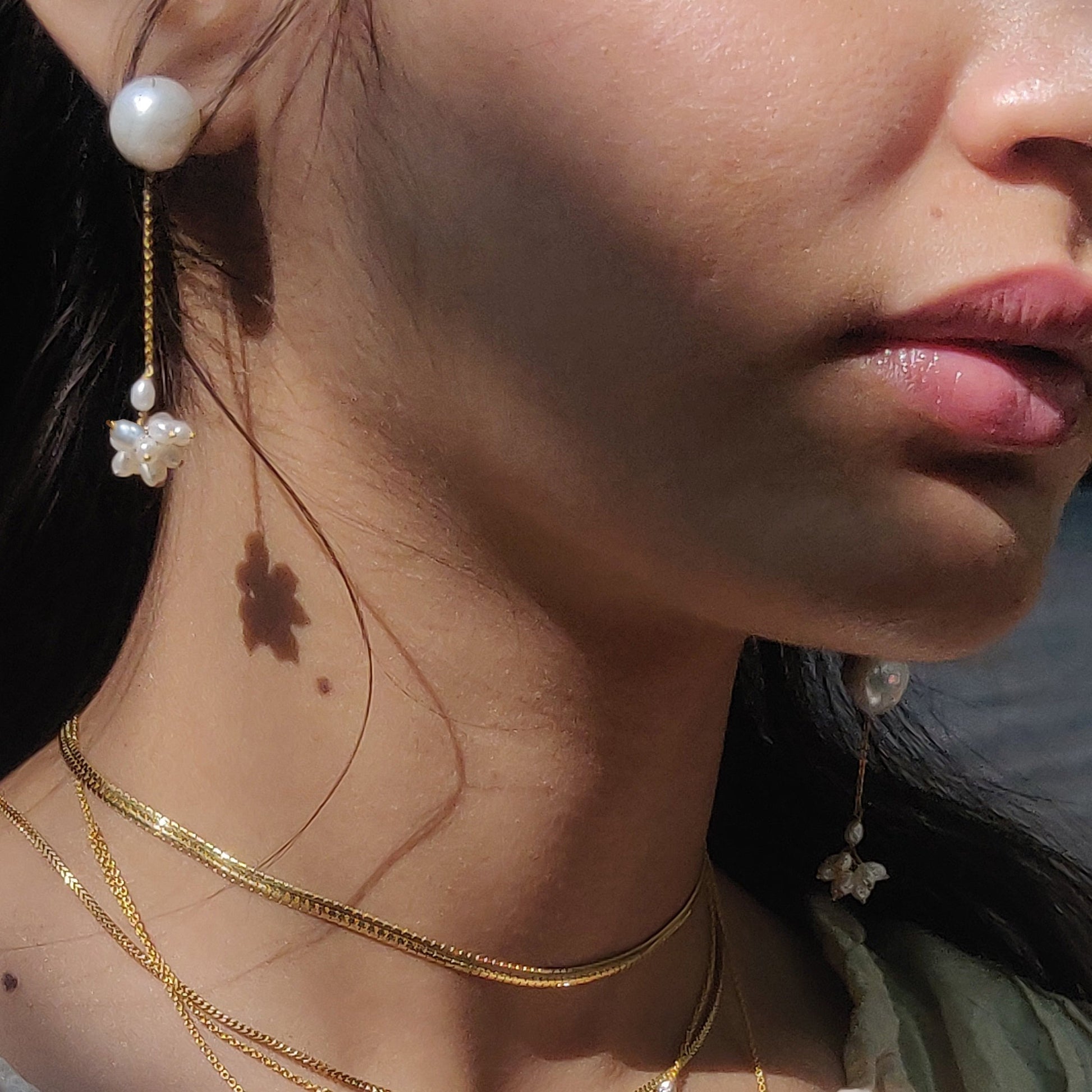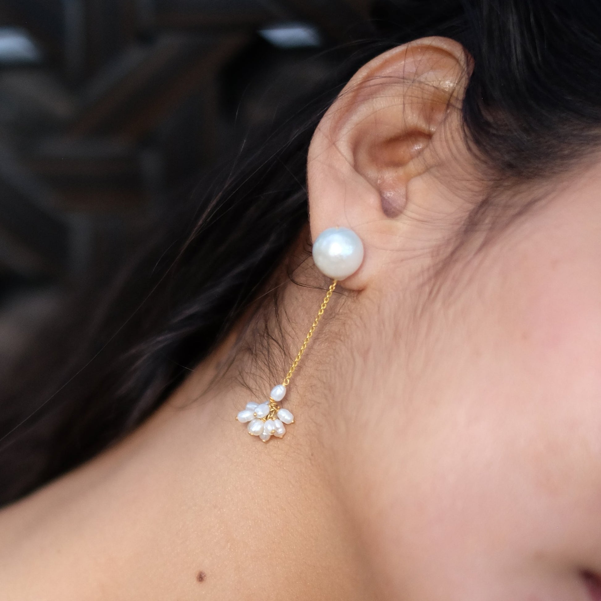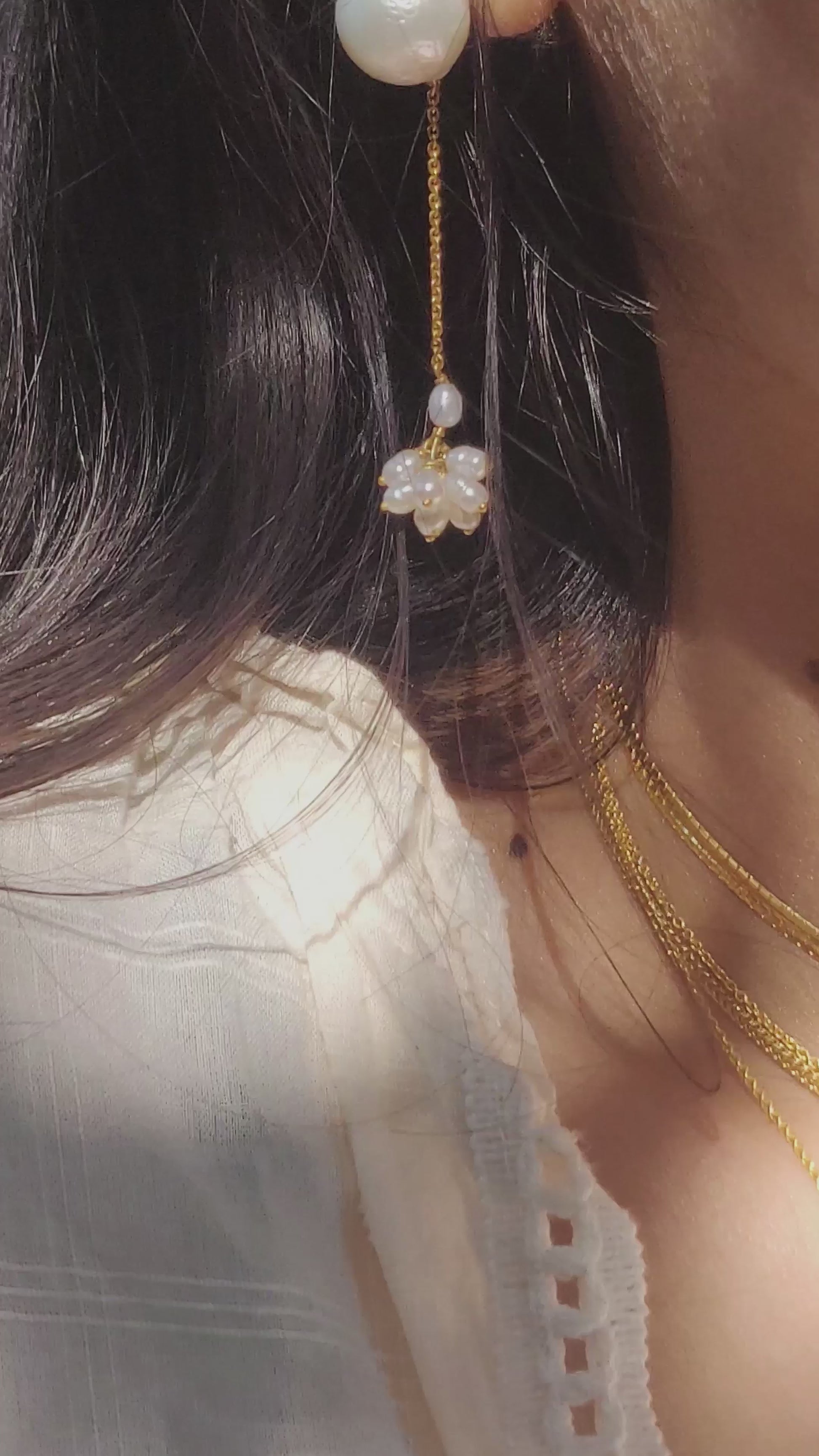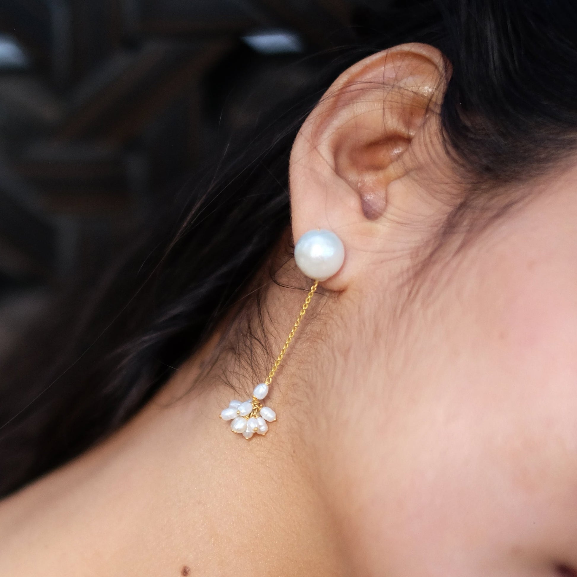 We love earrings with a little shimmy to them! Two delicate posy's of freshwater pearls are connected by a sparkling gold chain. A modern take on the classic pearl earring, inspired by Jasmines (Mogras); the Indian summer flowers, soaking up the summer sun. Available in 18kt solid gold.