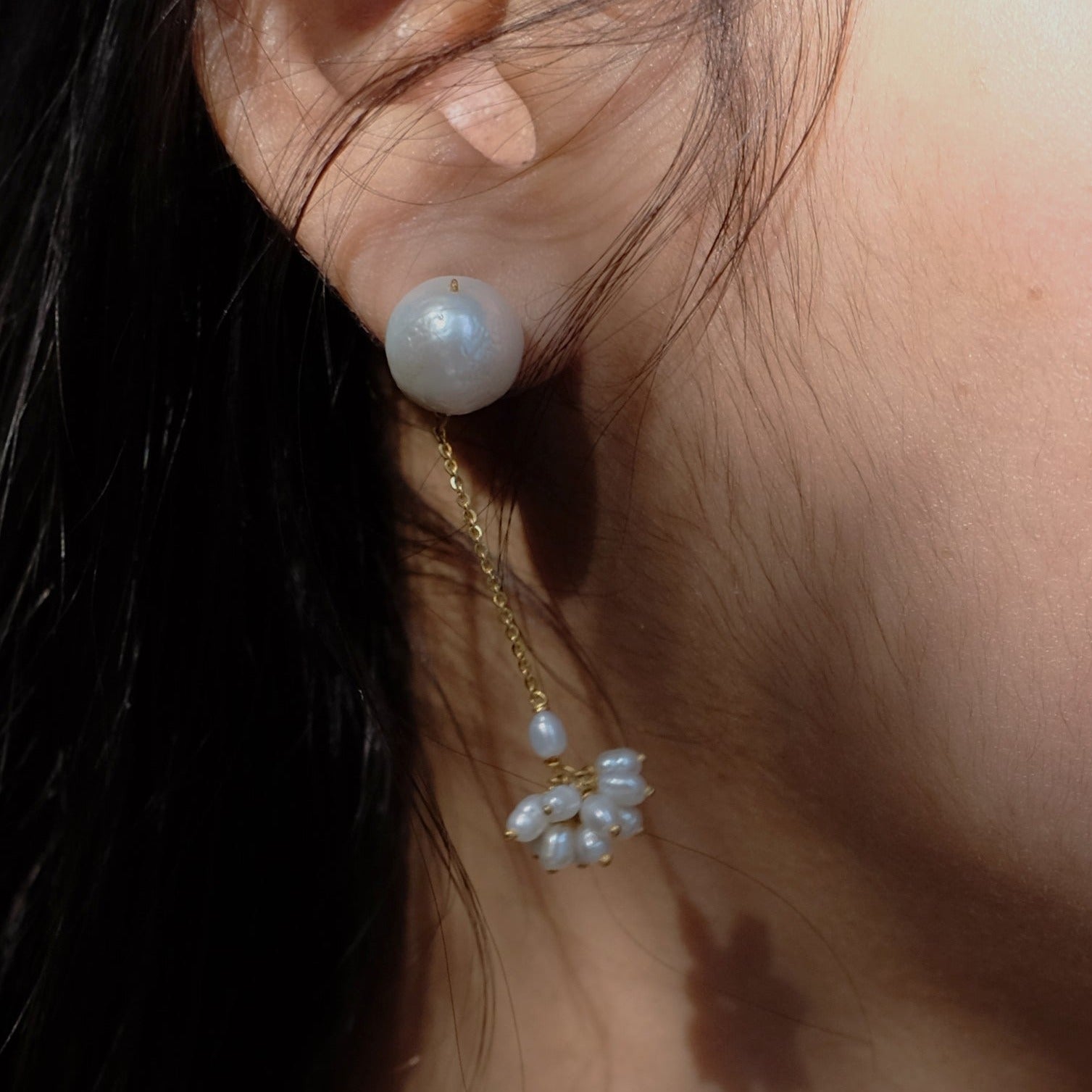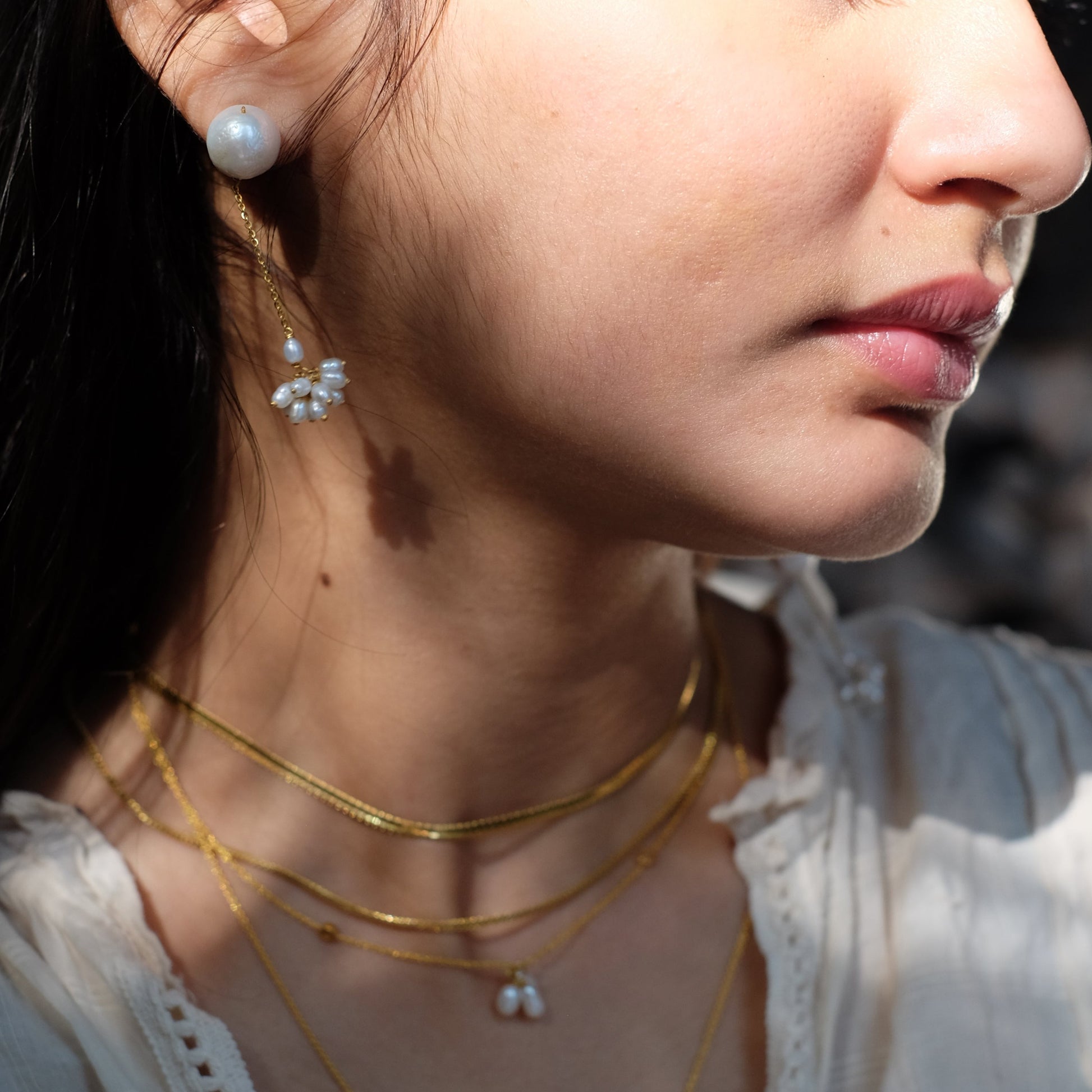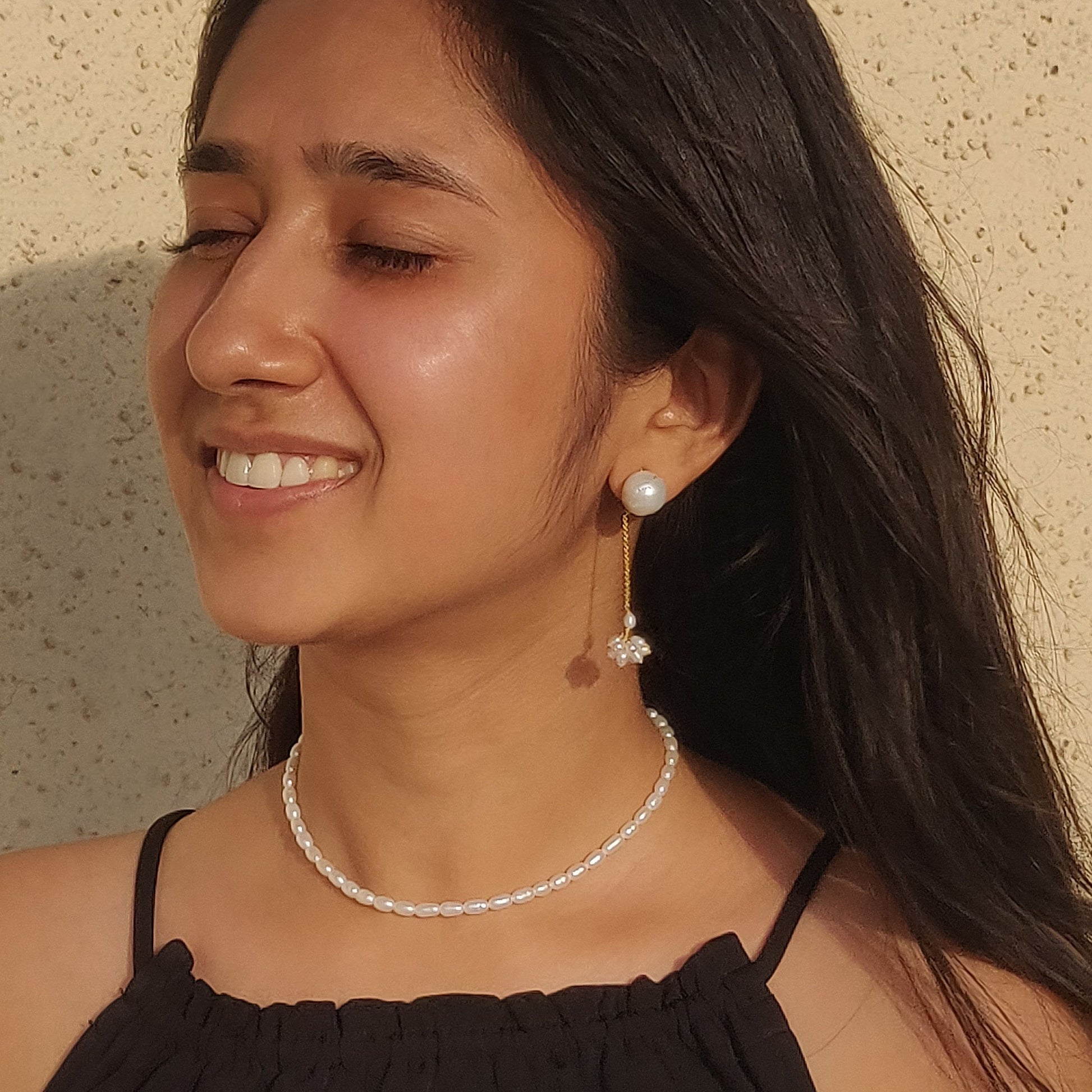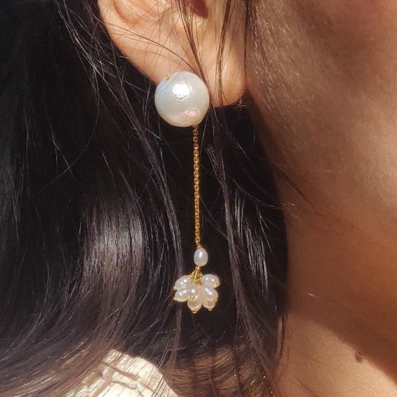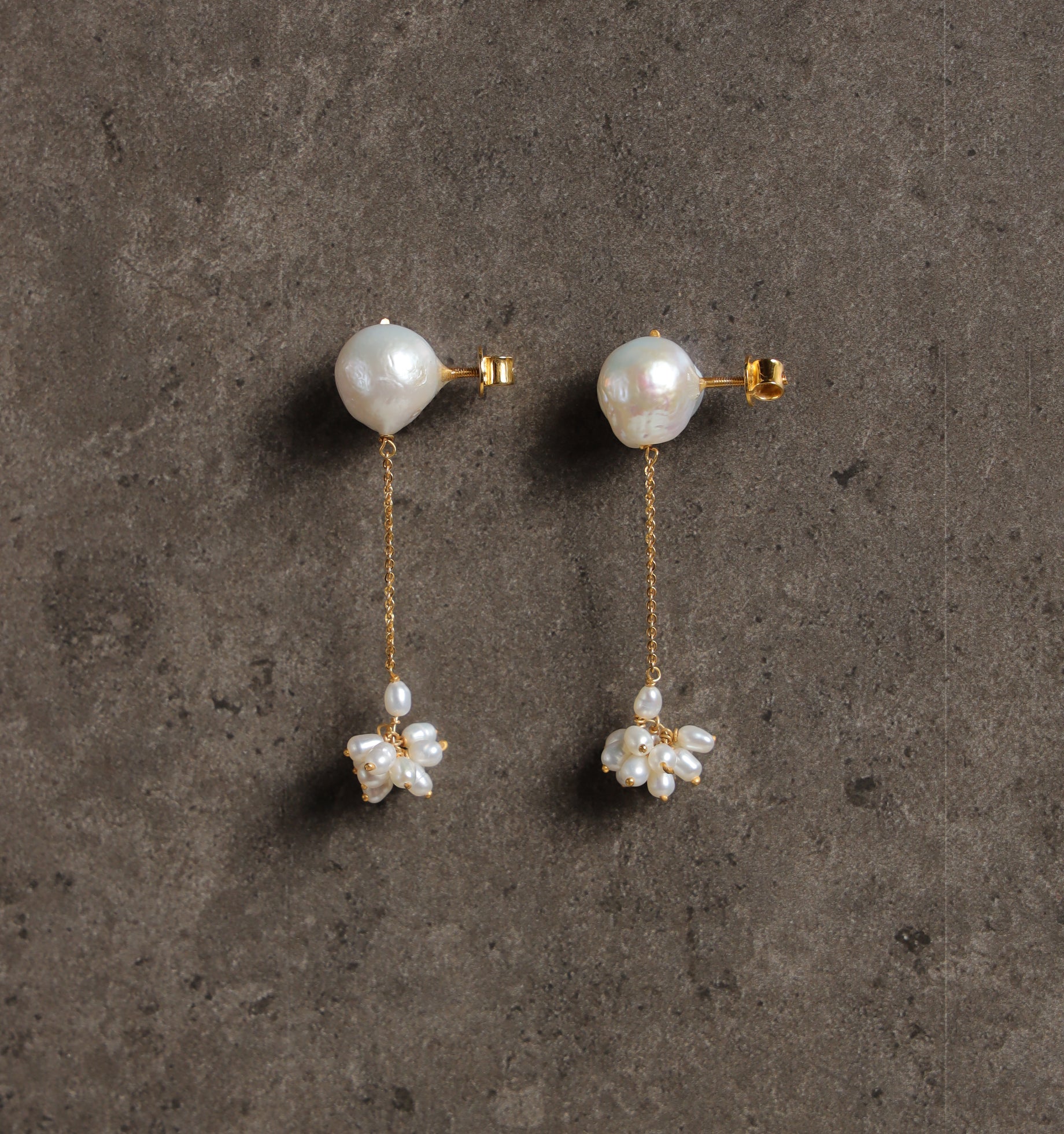 We love earrings with a little shimmy to them! Two delicate posy's of freshwater pearls are connected by a sparkling gold chain. A modern take on the classic pearl earring, inspired by Jasmines (Mogras); the Indian summer flowers, soaking up the summer sun. Available in 18kt solid gold.