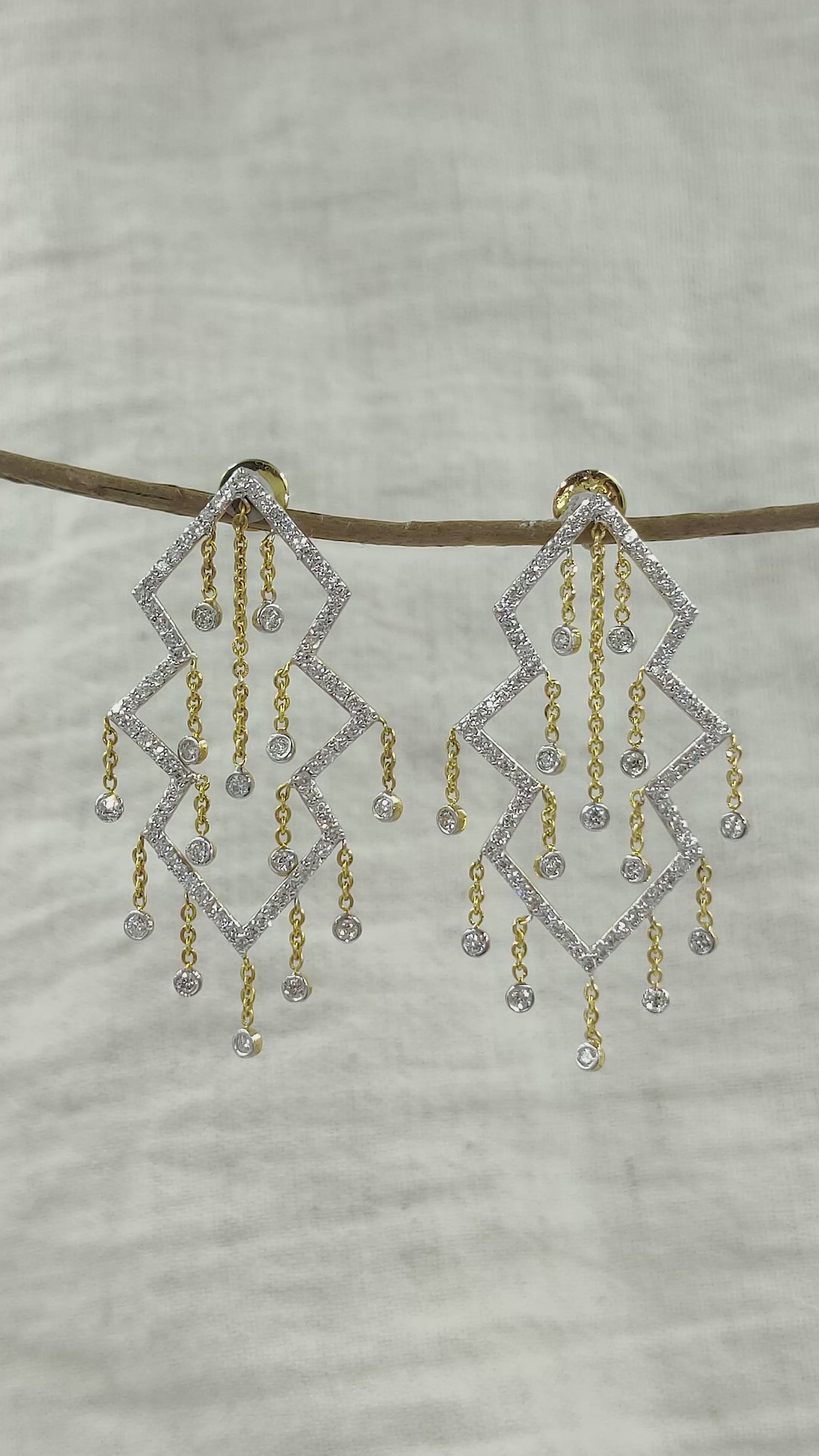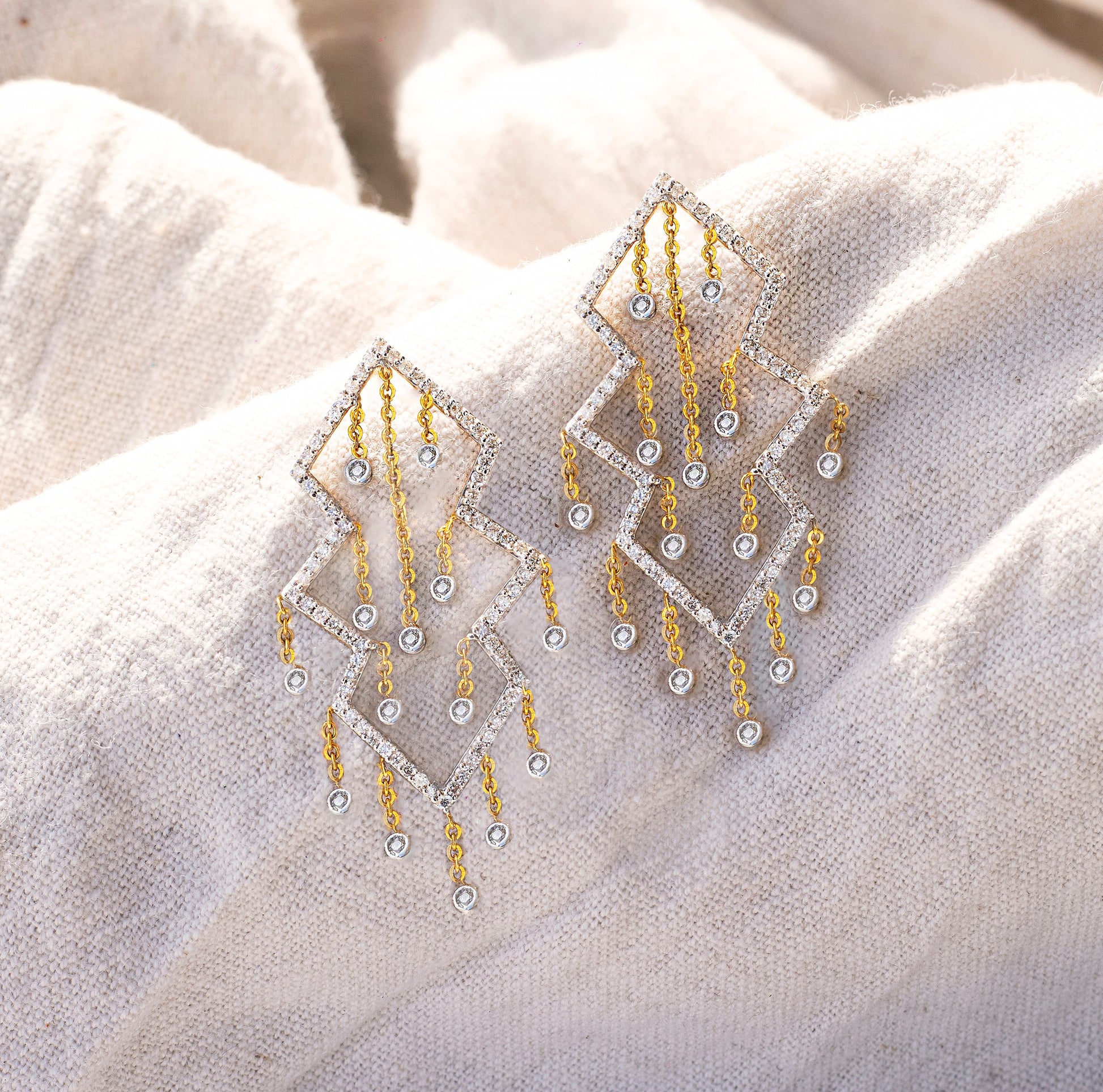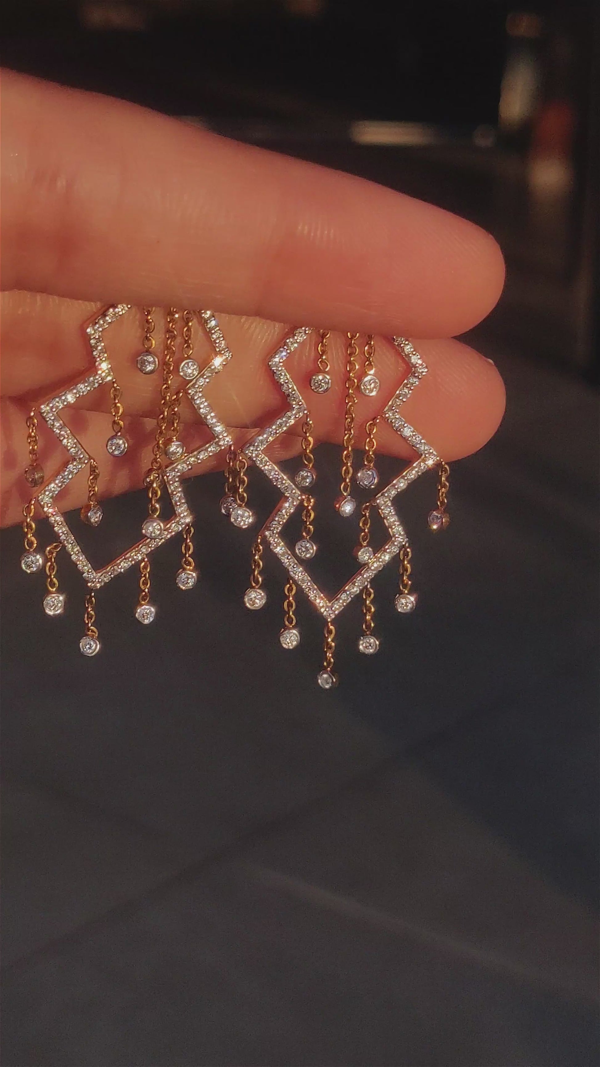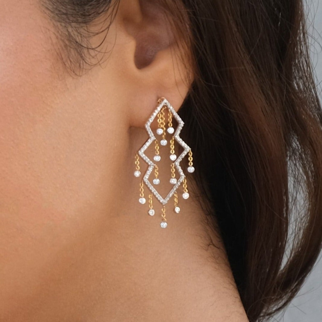 The Chandelier Diamond Earrings are our most elegant, celestial-inspired earrings featuring 172 sparkling diamonds totaling over 1 carat. Symbolizing falling stars that are caught cradled in a gorgeous crescent moon silhouette, the diamonds sway like a chandelier emitting an unreal sparkle. They are the perfect statement piece and bring any outfit to life through their unique design and added sparkle.