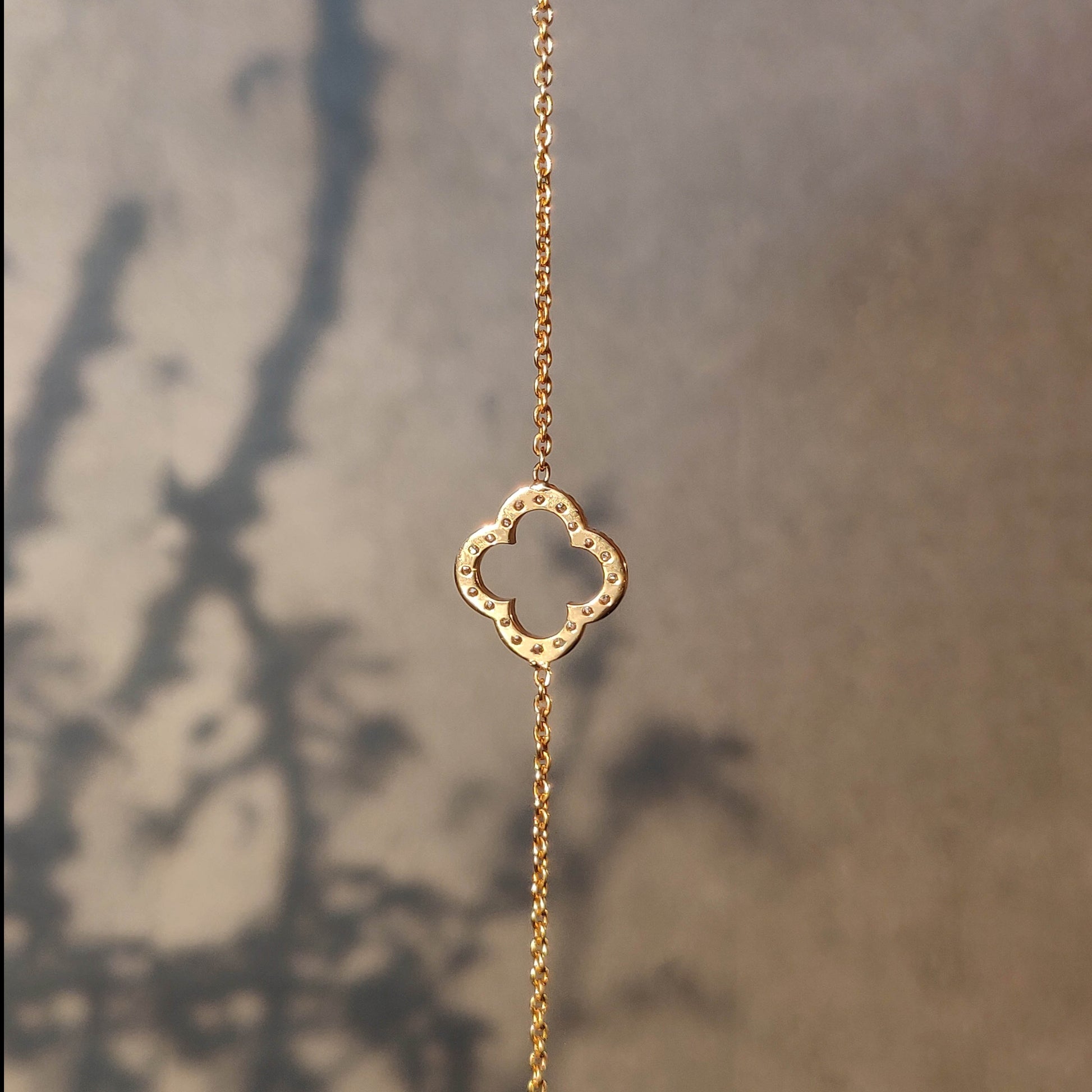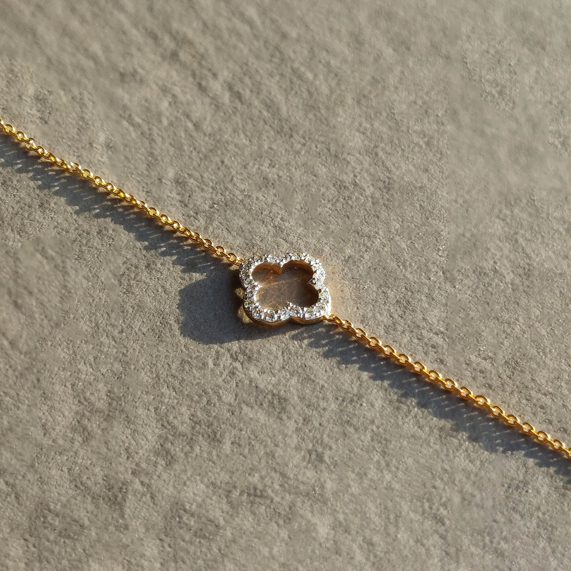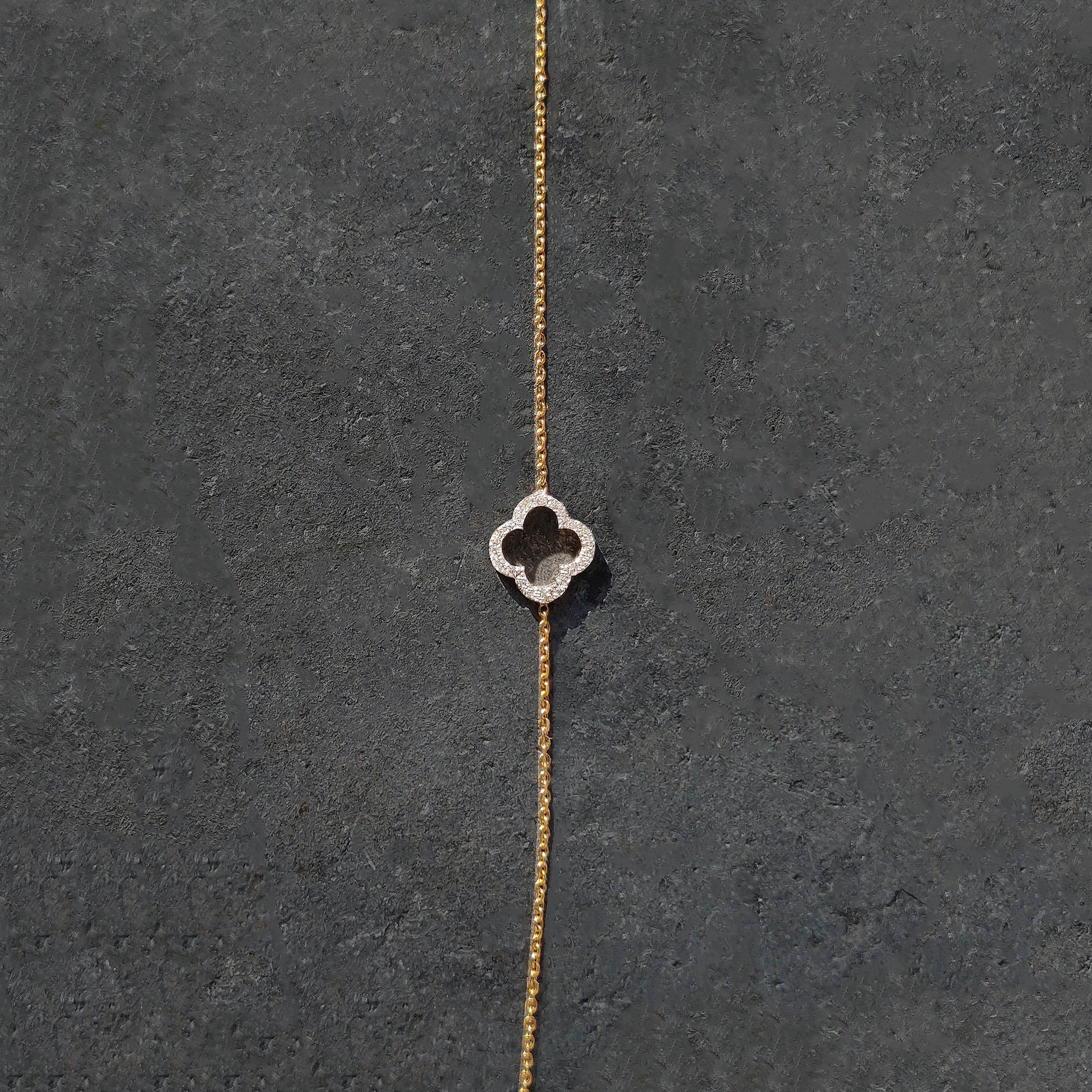 Behold the luckiest charm you'll ever wear on your wrist - the Clover Diamond Bracelet. Crafted with love and precision from 18k solid gold, this gorgeous piece features a delicate clover charm that sparkles with a cluster of brilliant diamonds.
