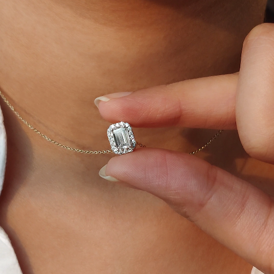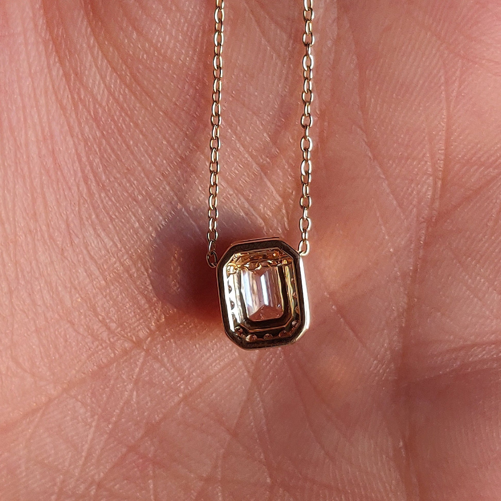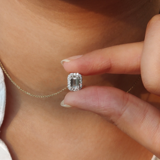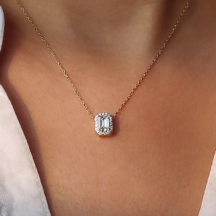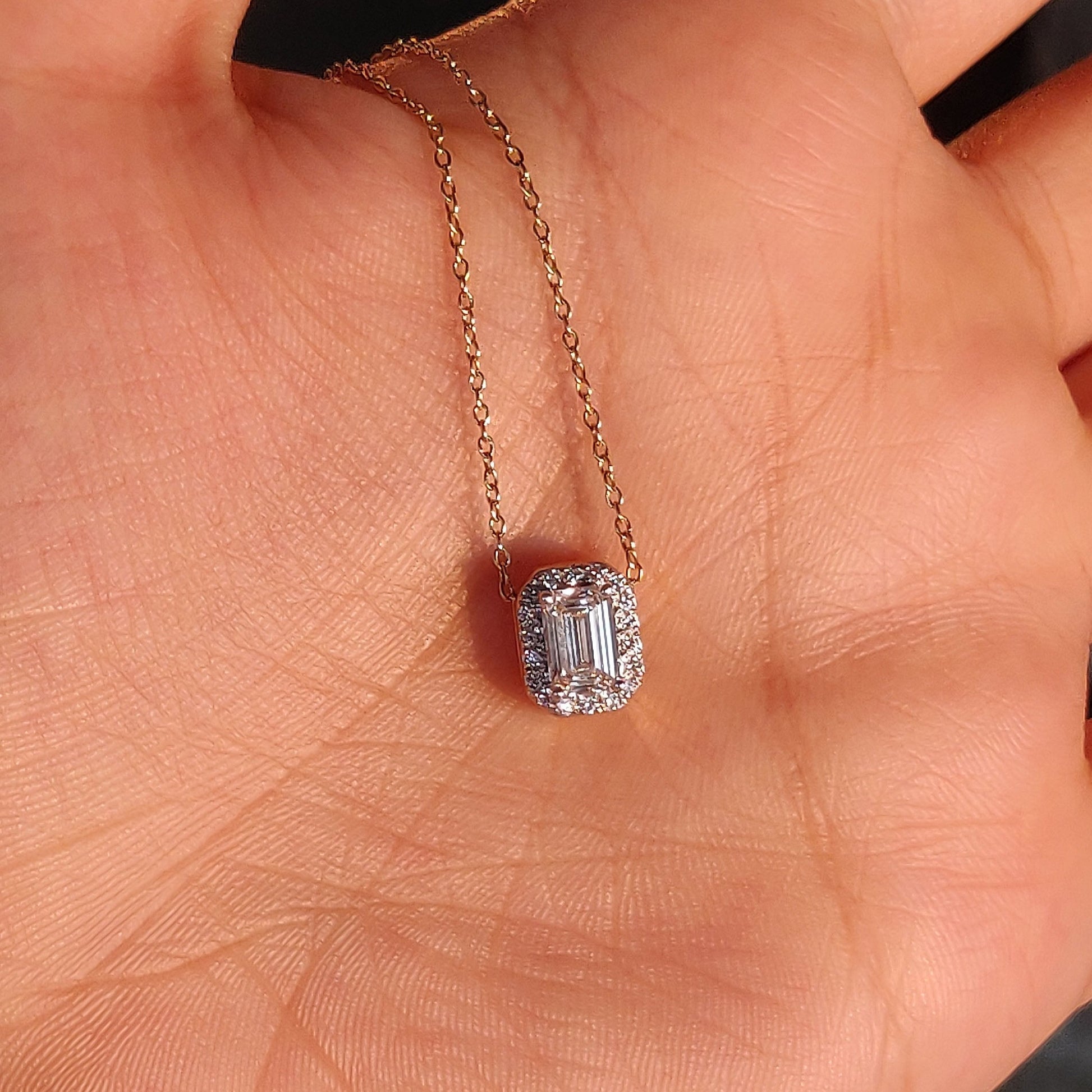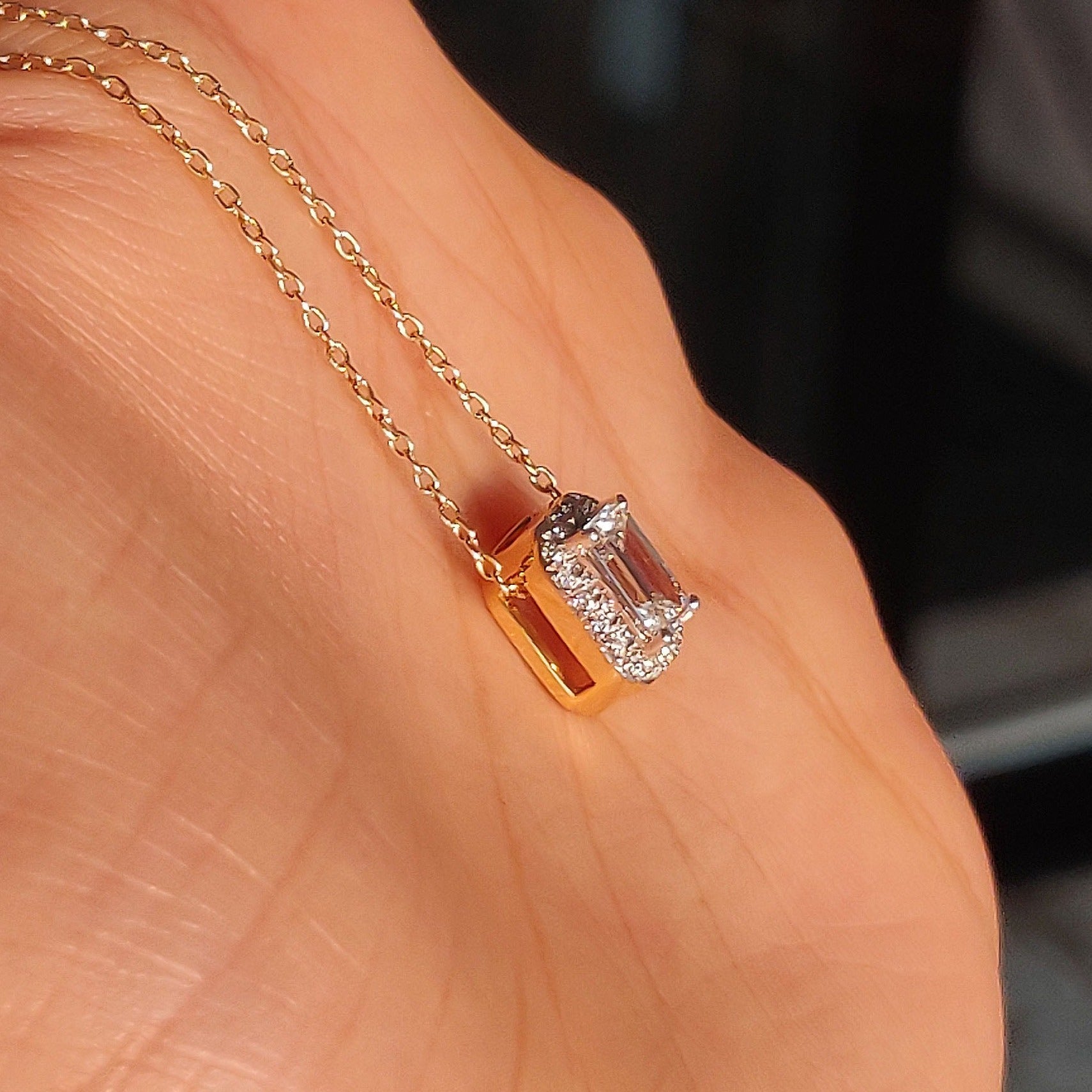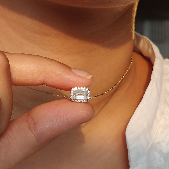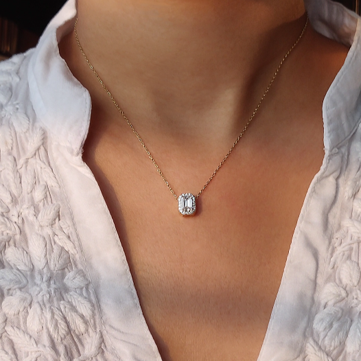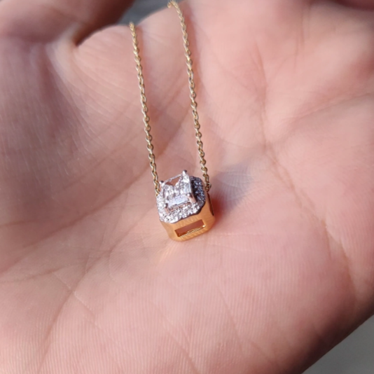 This pendant features stunning 0.64 carats of certified white diamonds, flawlessly set in 18k gold weighing approximately 1.4 grams. What makes this piece truly exceptional is its versatility. Wear it horizontally for a classic look or vertically for a contemporary twist - the choice is yours. The illusion set design of the diamonds creates a seamless appearance, giving the impression of a single, magnificent diamond. Choose from our luxurious options of yellow, white, or rose gold to match your personal style.