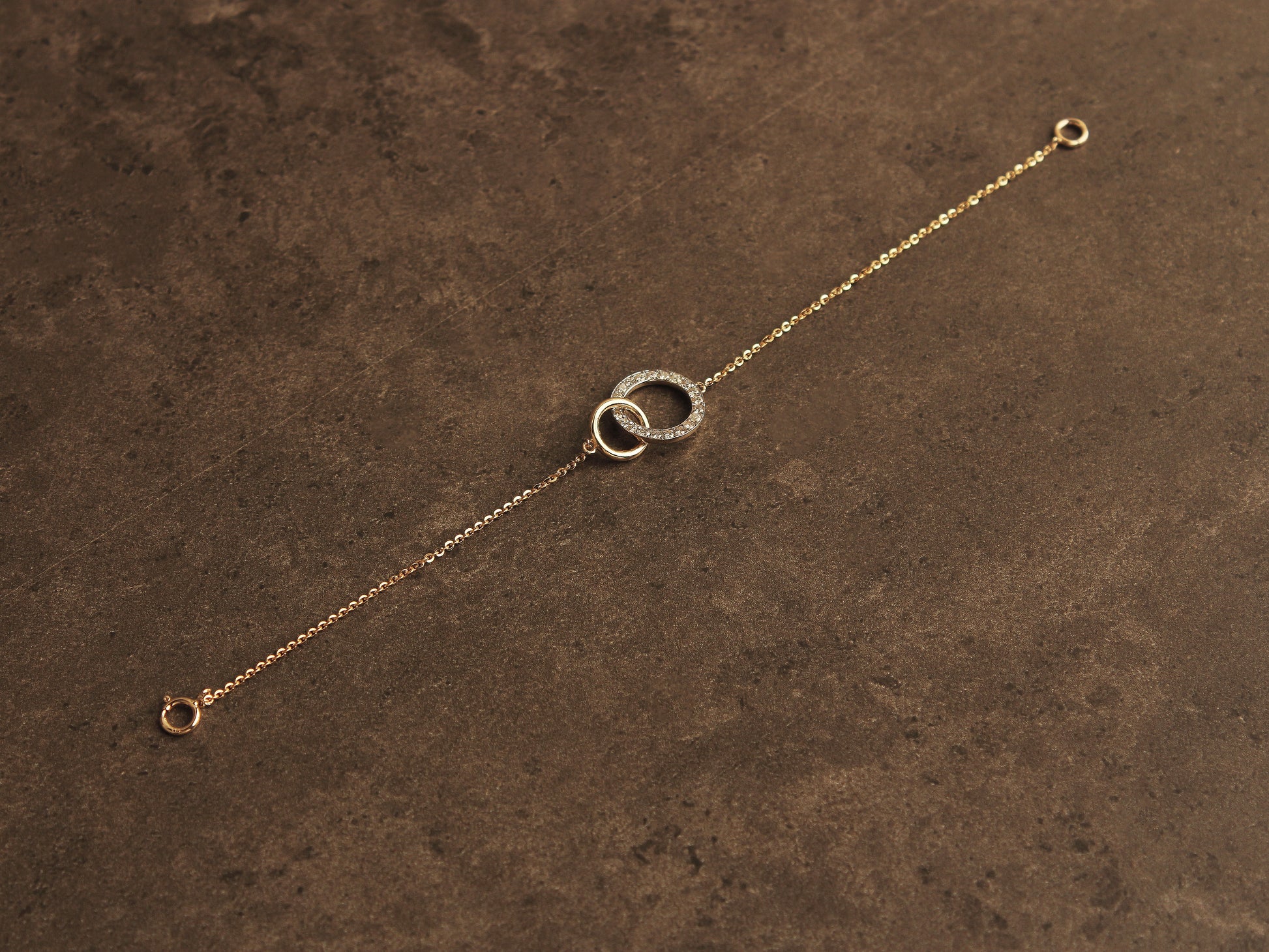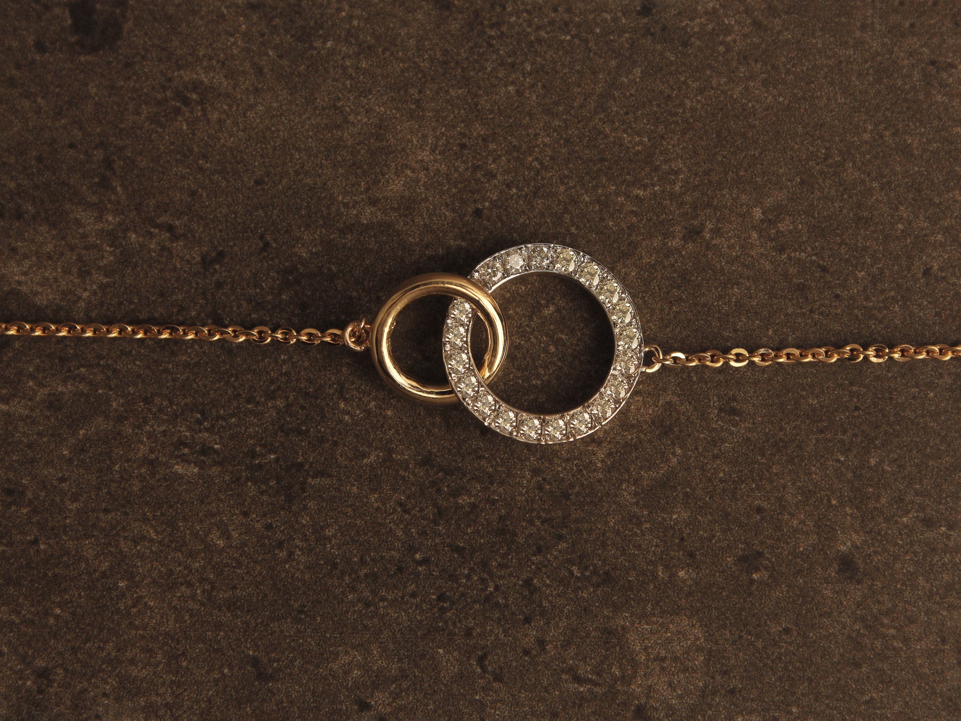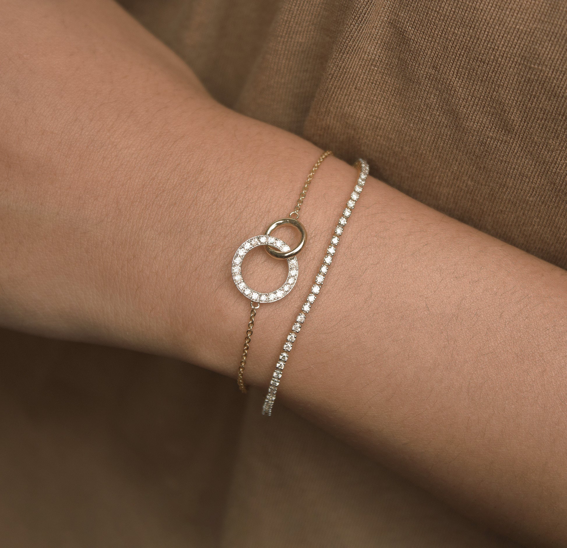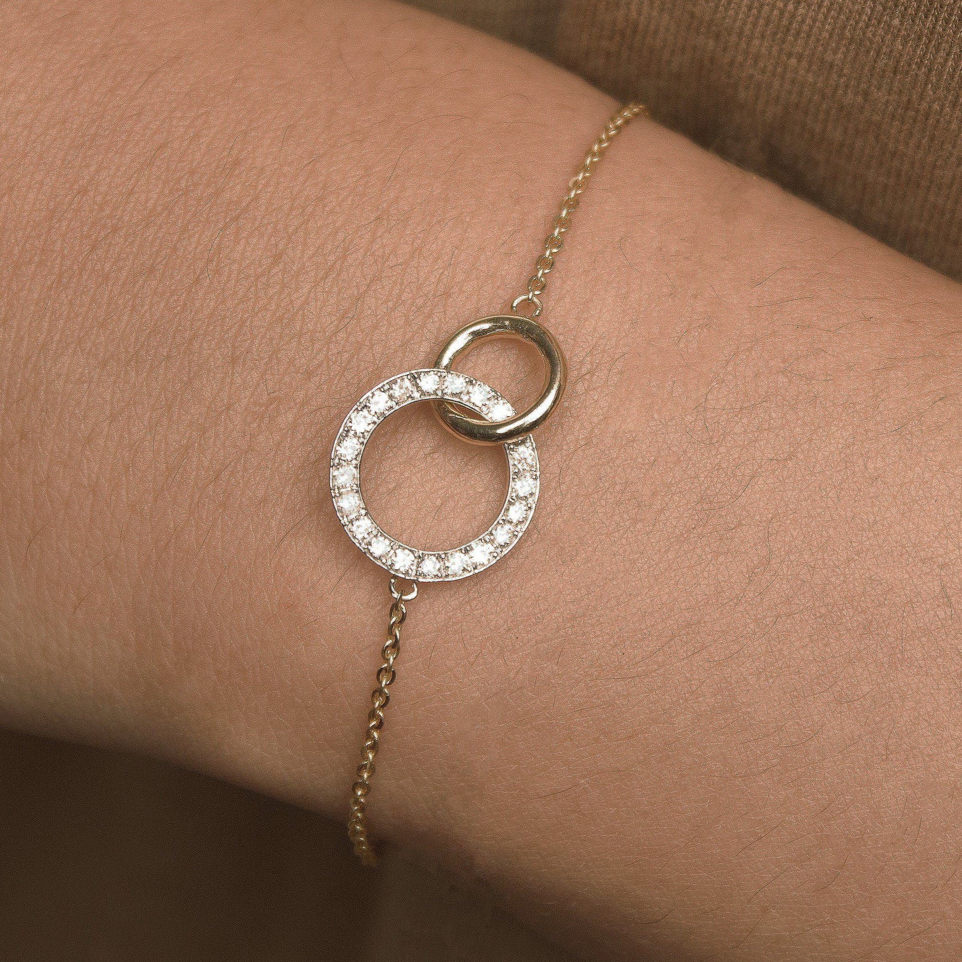 This bracelet features two interlocking circles: one with plain gold, the other brought beautifully to life with sparkling diamonds, designed to shimmer with every move of the wrist. Created in 18kt yellow gold, this interlocking bracelet will elevate any look from ordinary to the extraordinary. Immaculate, contemporary and classic.
