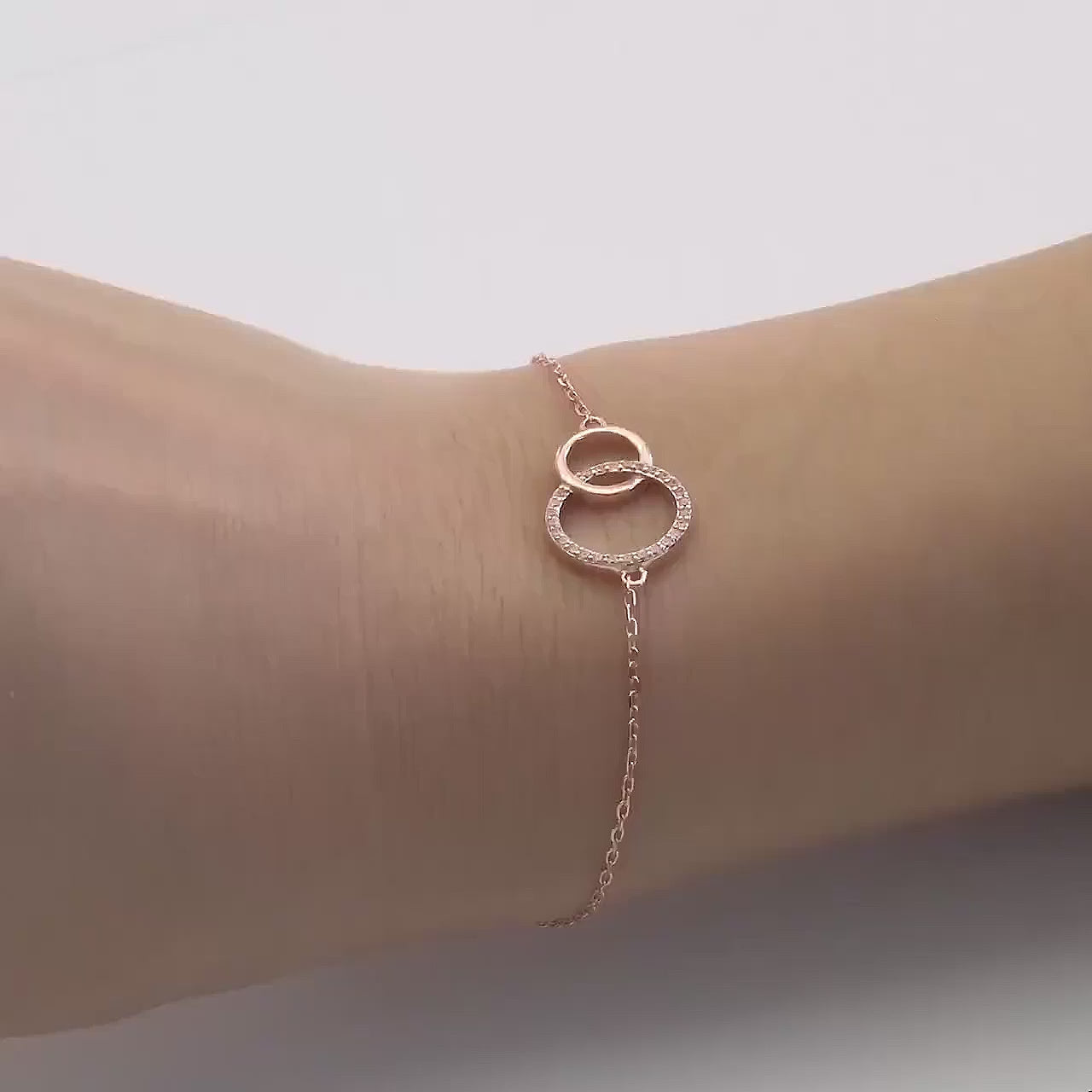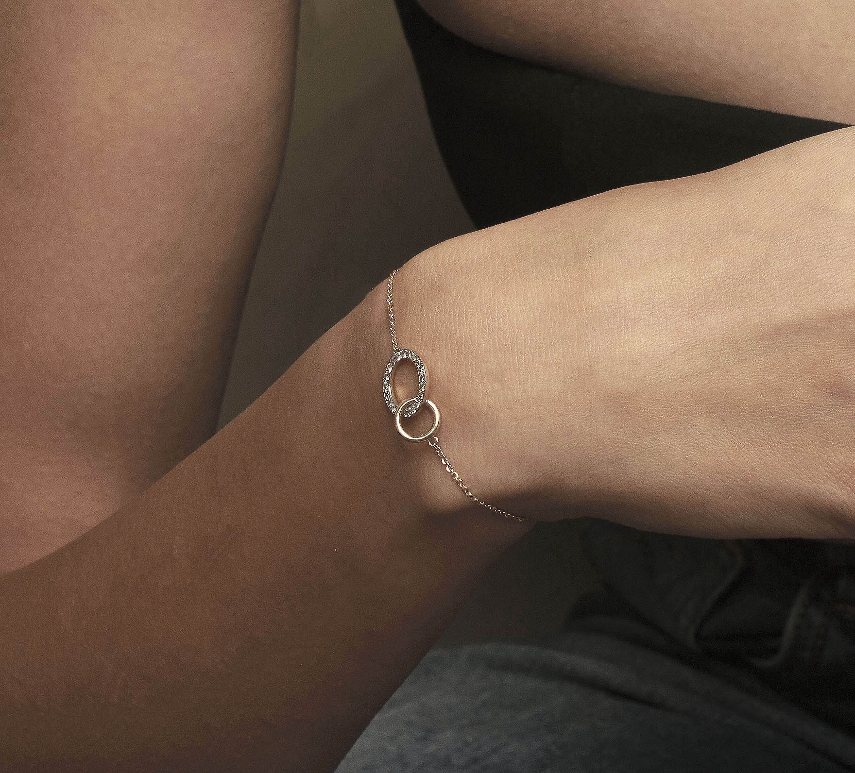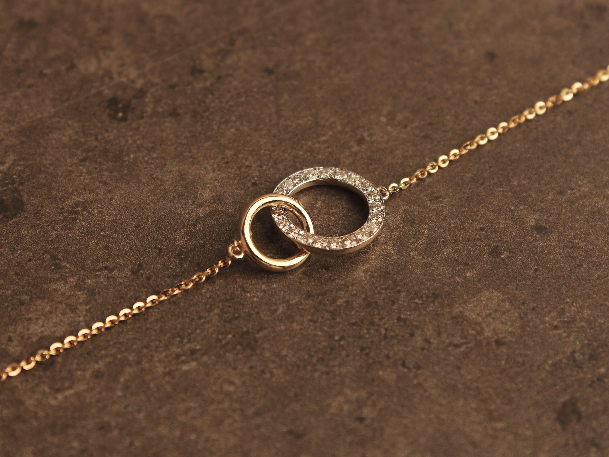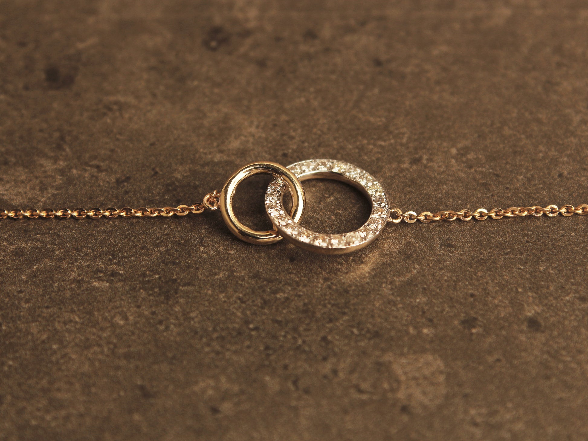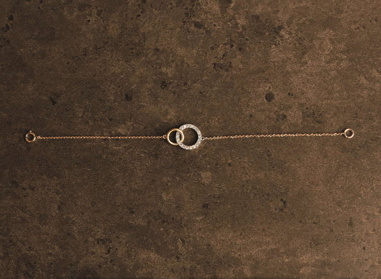 This bracelet features two interlocking circles: one with plain gold, the other brought beautifully to life with sparkling diamonds, designed to shimmer with every move of the wrist. Created in 18kt yellow gold, this interlocking bracelet will elevate any look from ordinary to the extraordinary. Immaculate, contemporary and classic.
