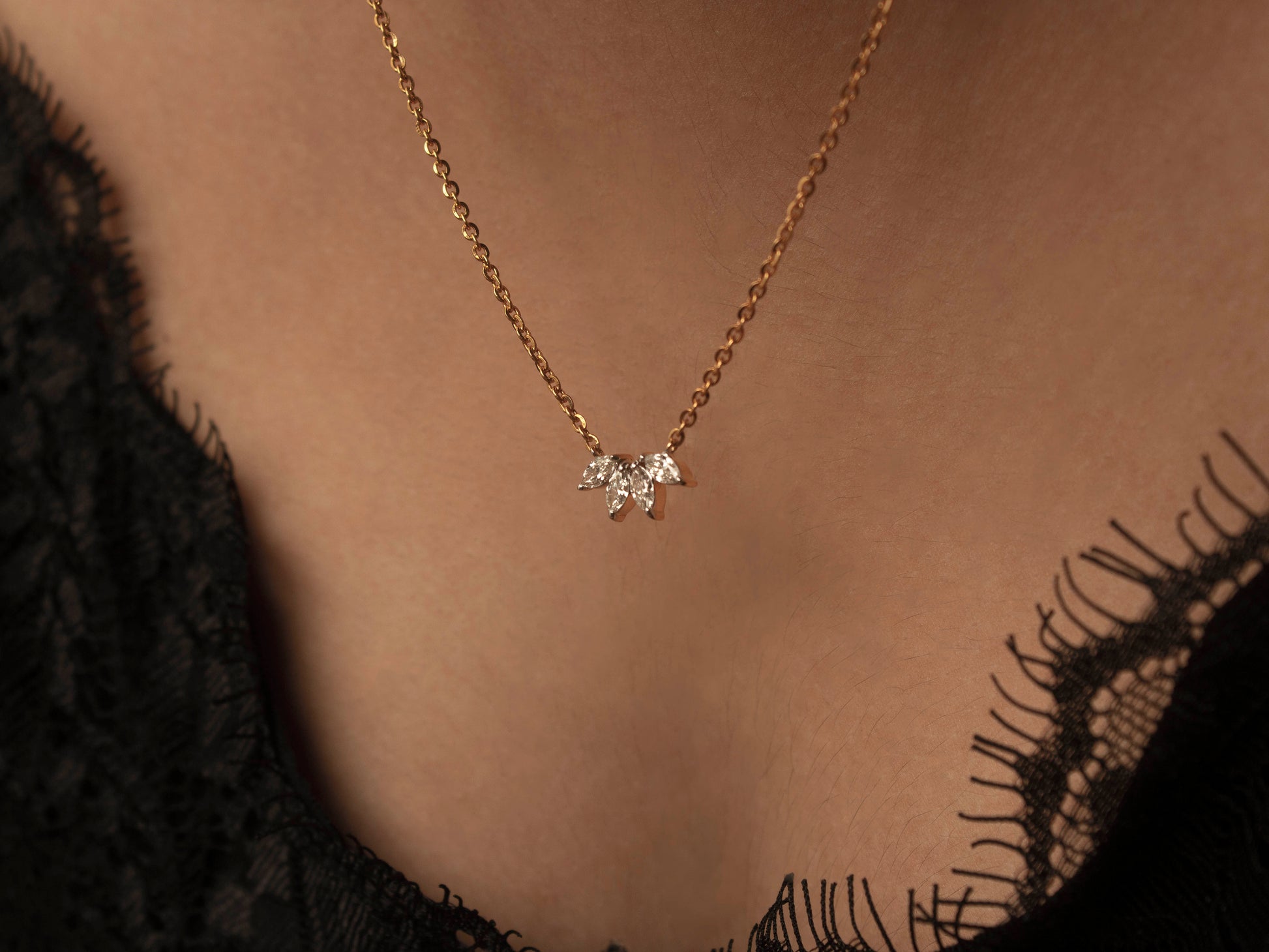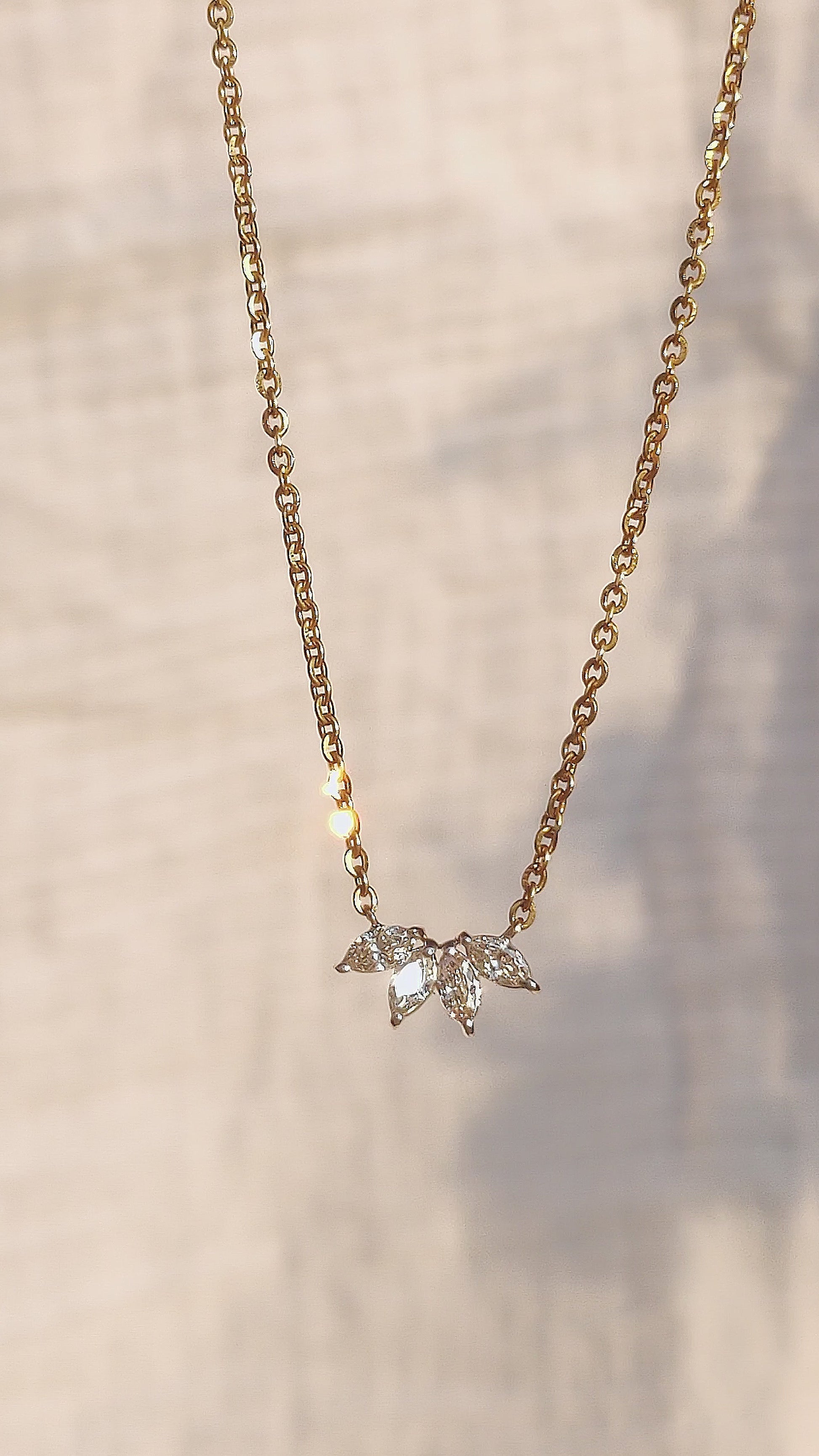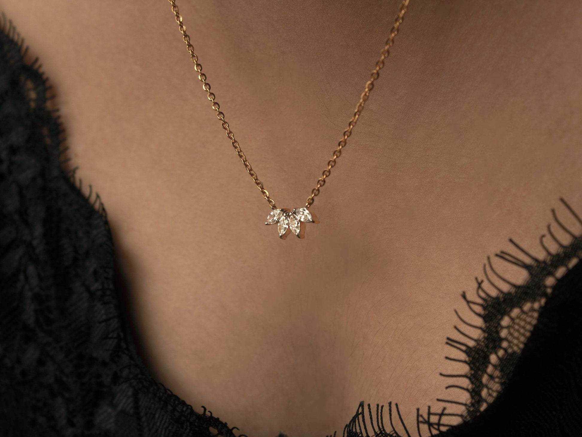 The eye-catching triple marquise pendant gold necklace is inspired by the lotus flower which blossoms through thick mud, a representation of inner strength and beauty. Available in 18k Solid Gol.d