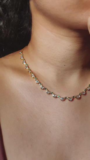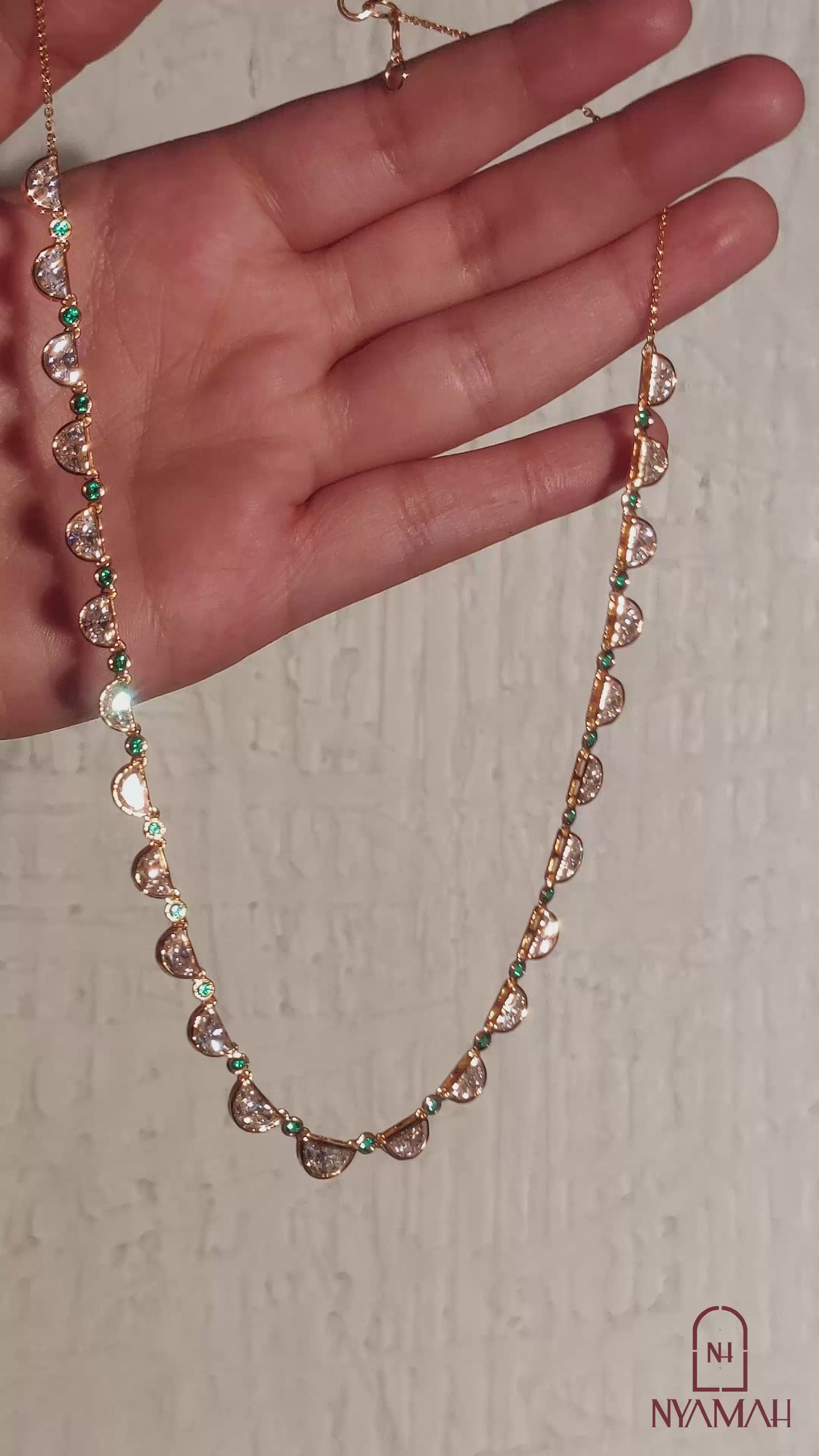 Why reach for the moon when you can wear it? The Lunara Necklace strings together diamond half-moons, each one catching light like a secret smile from the night sky. Tiny emeralds slip in between - bold, green sparks that make the stars jealous. Handcrafted for the ones who don’t just shine, but eclipse.