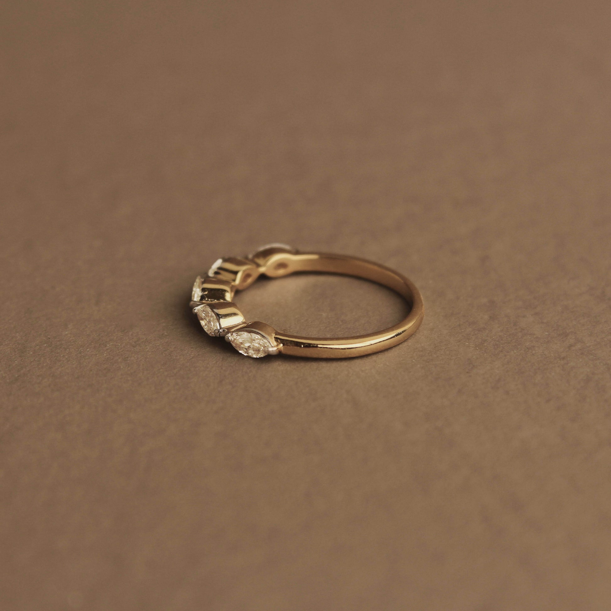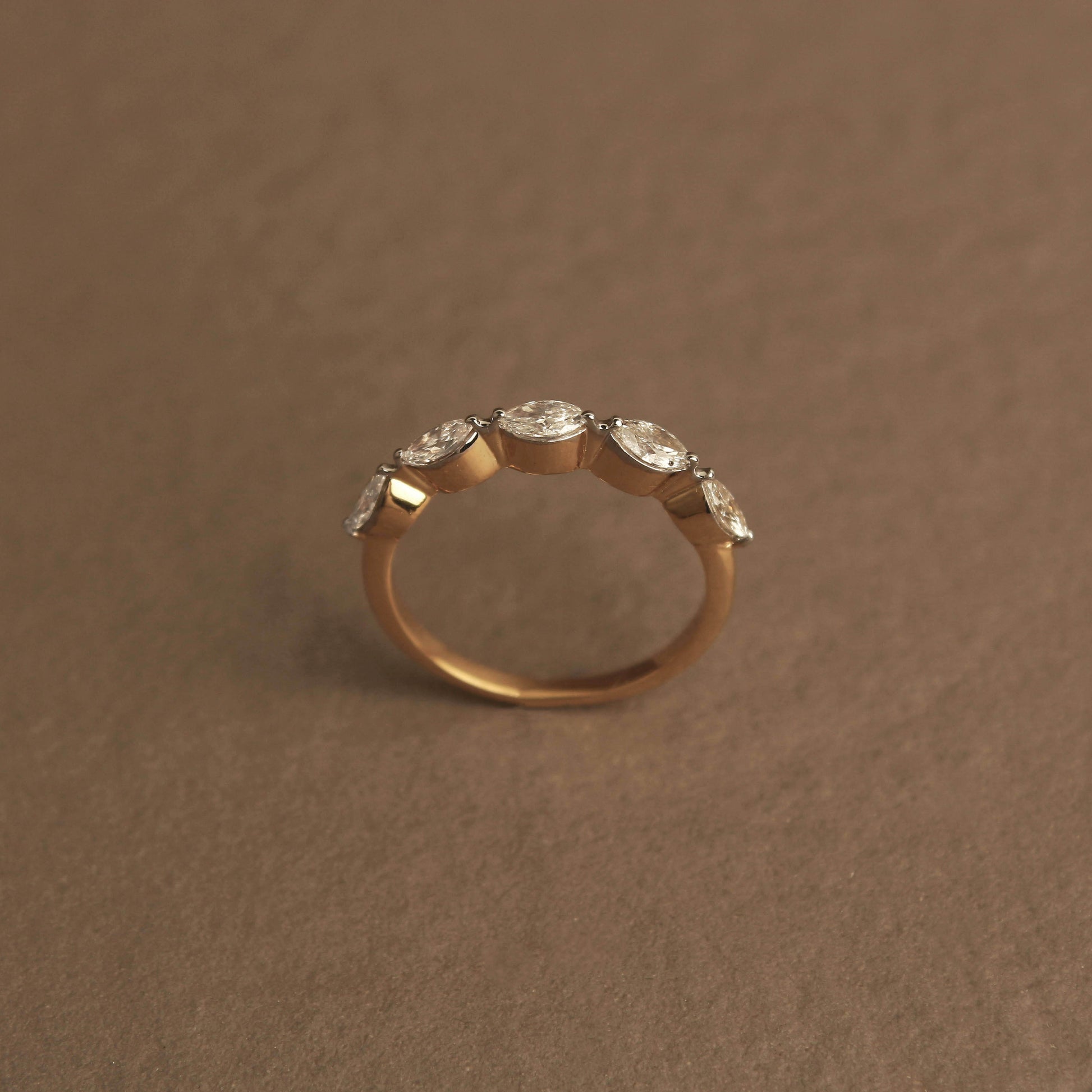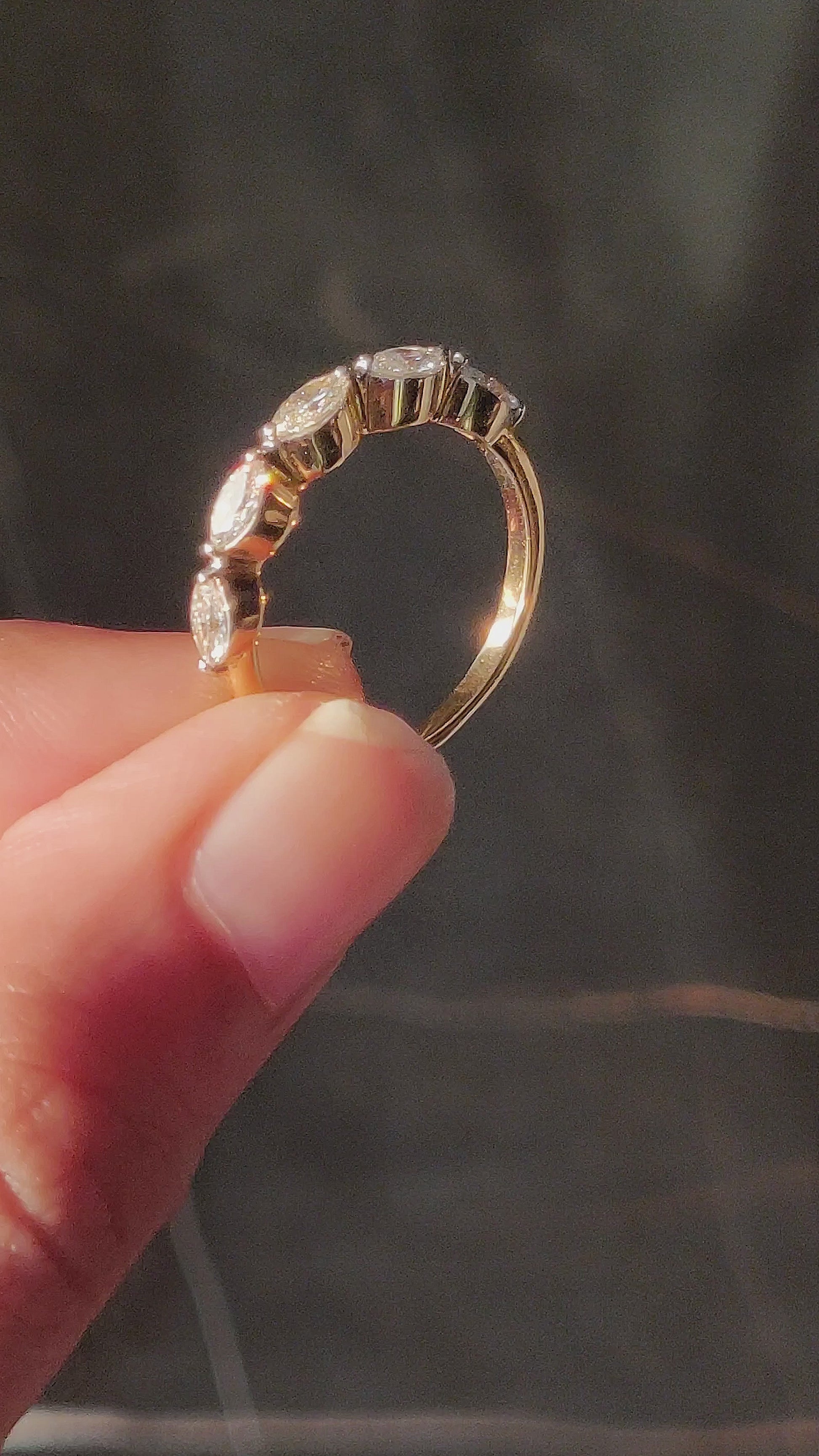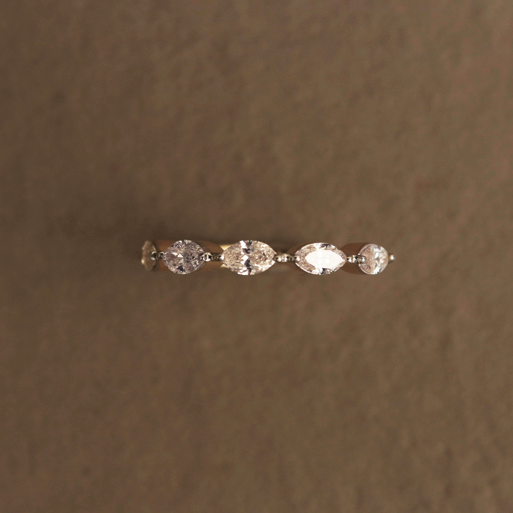 A fine series of spectacular marquise cut diamonds mesmerize you with flawless sparkle arranged elegantly in a basket prong setting. Wear our Diamond Marquise Half-Eternity band solo, stack with others or add a stylish and graceful edge to your wedding band. Available in 18k Solid Gold. Full eternity options can be custom-made.