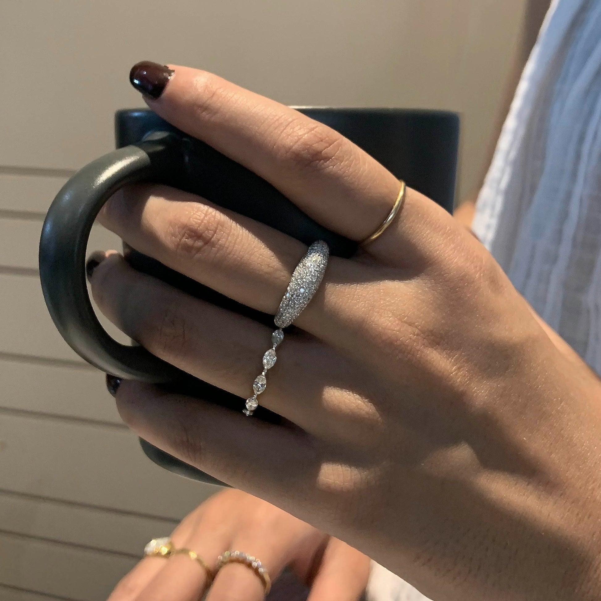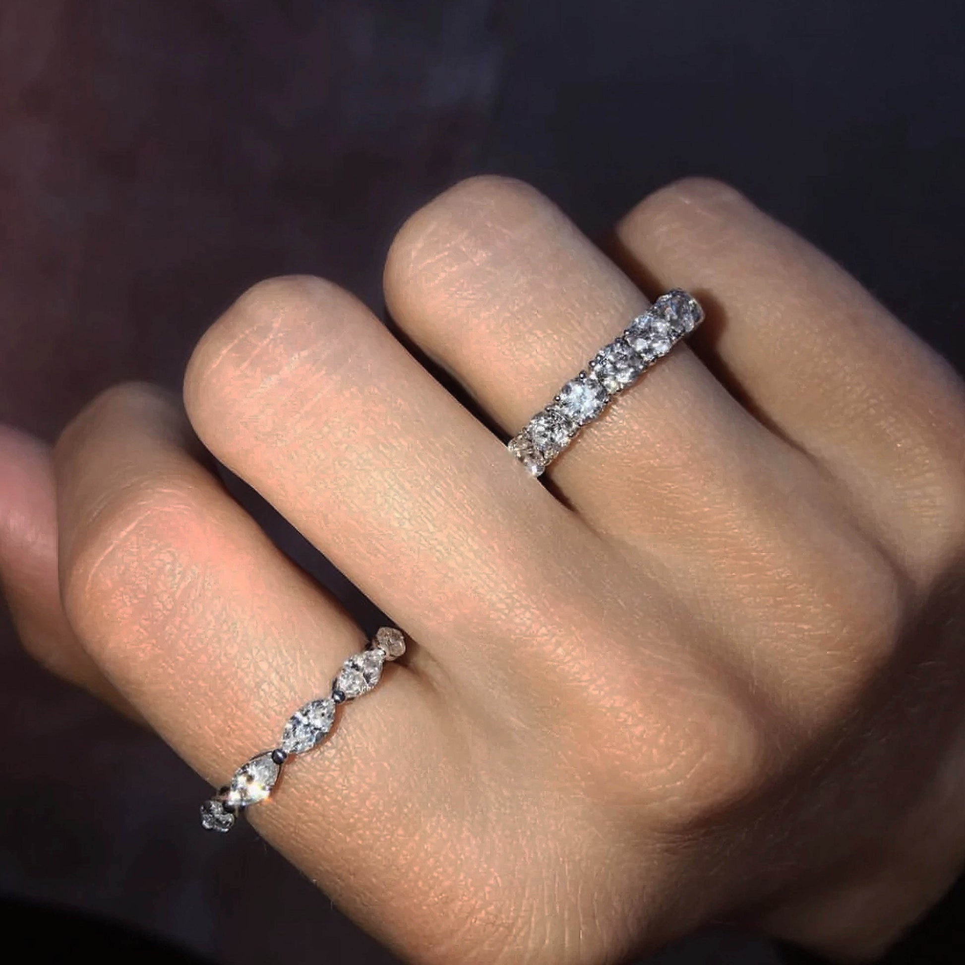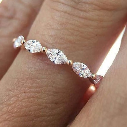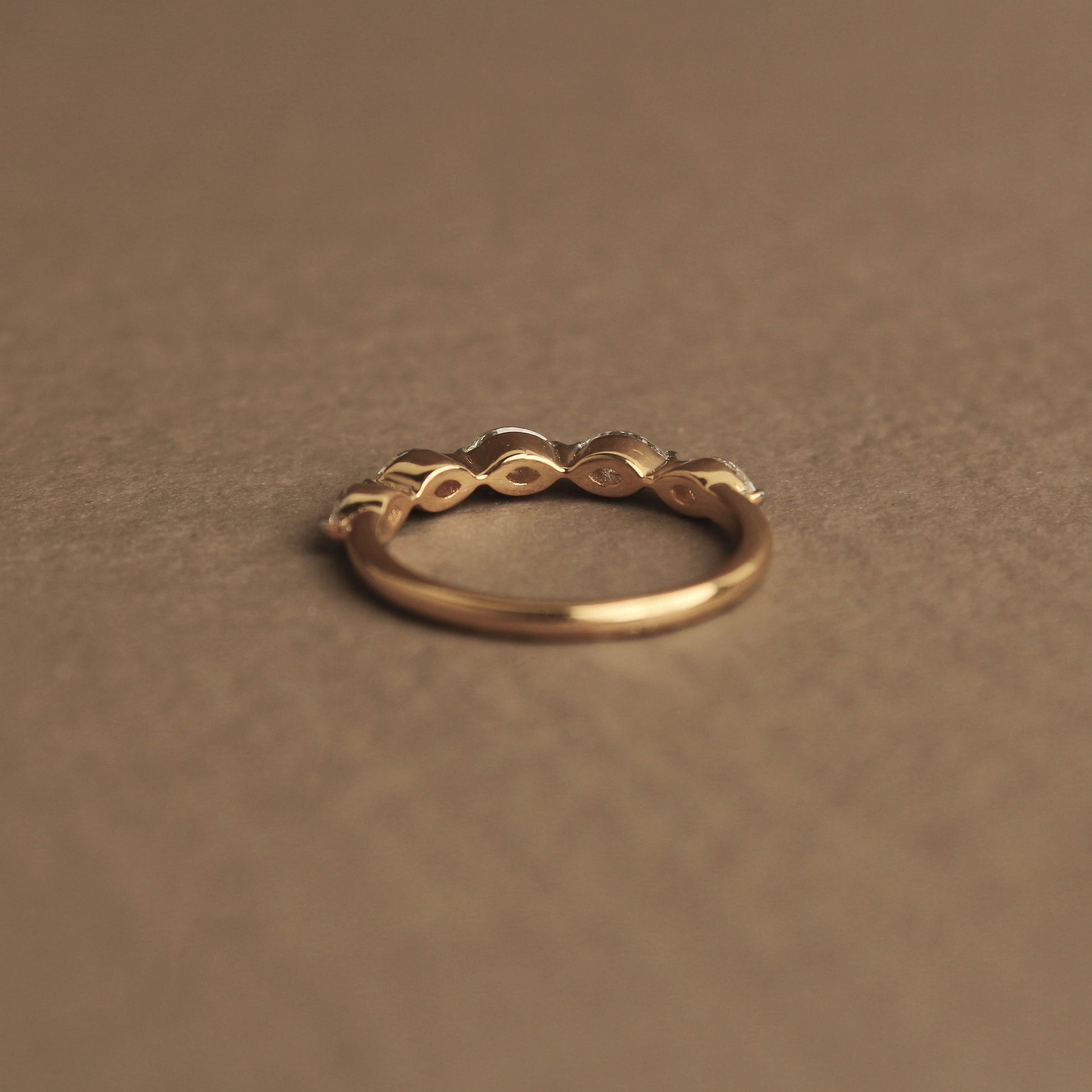 A fine series of spectacular marquise cut diamonds mesmerize you with flawless sparkle arranged elegantly in a basket prong setting. Wear our Diamond Marquise Half-Eternity band solo, stack with others or add a stylish and graceful edge to your wedding band. Available in 18k Solid Gold. Full eternity options can be custom-made.
