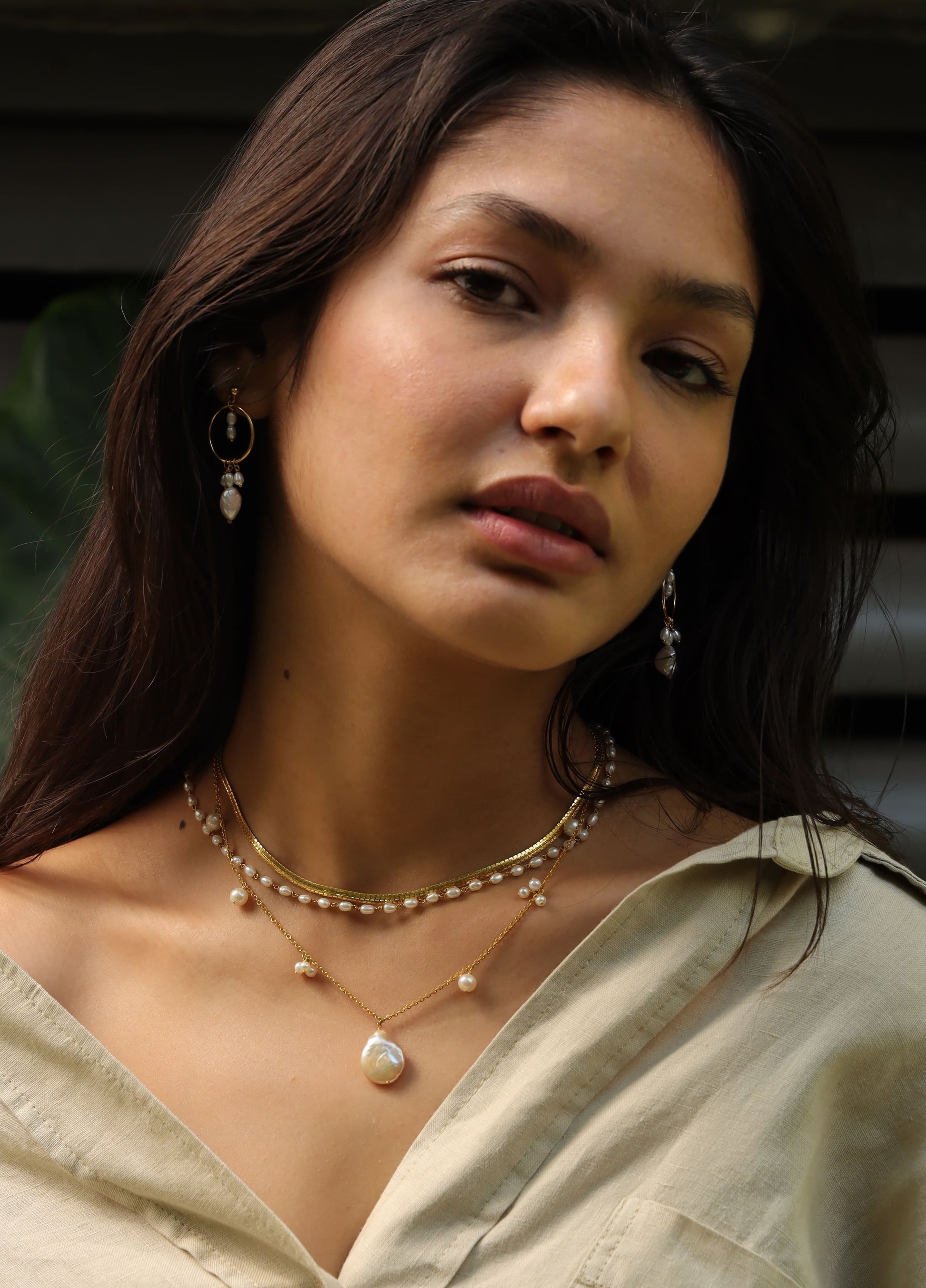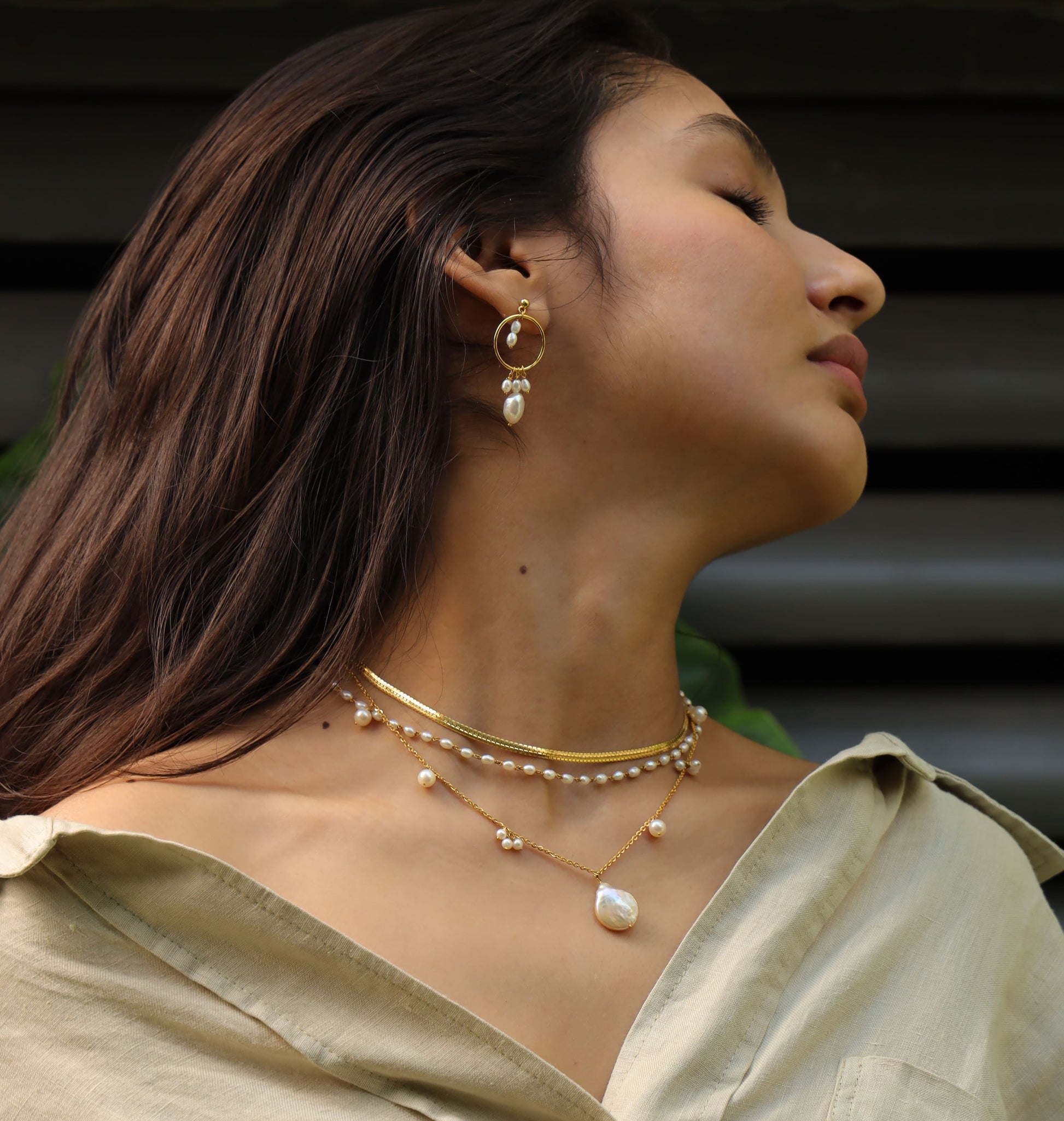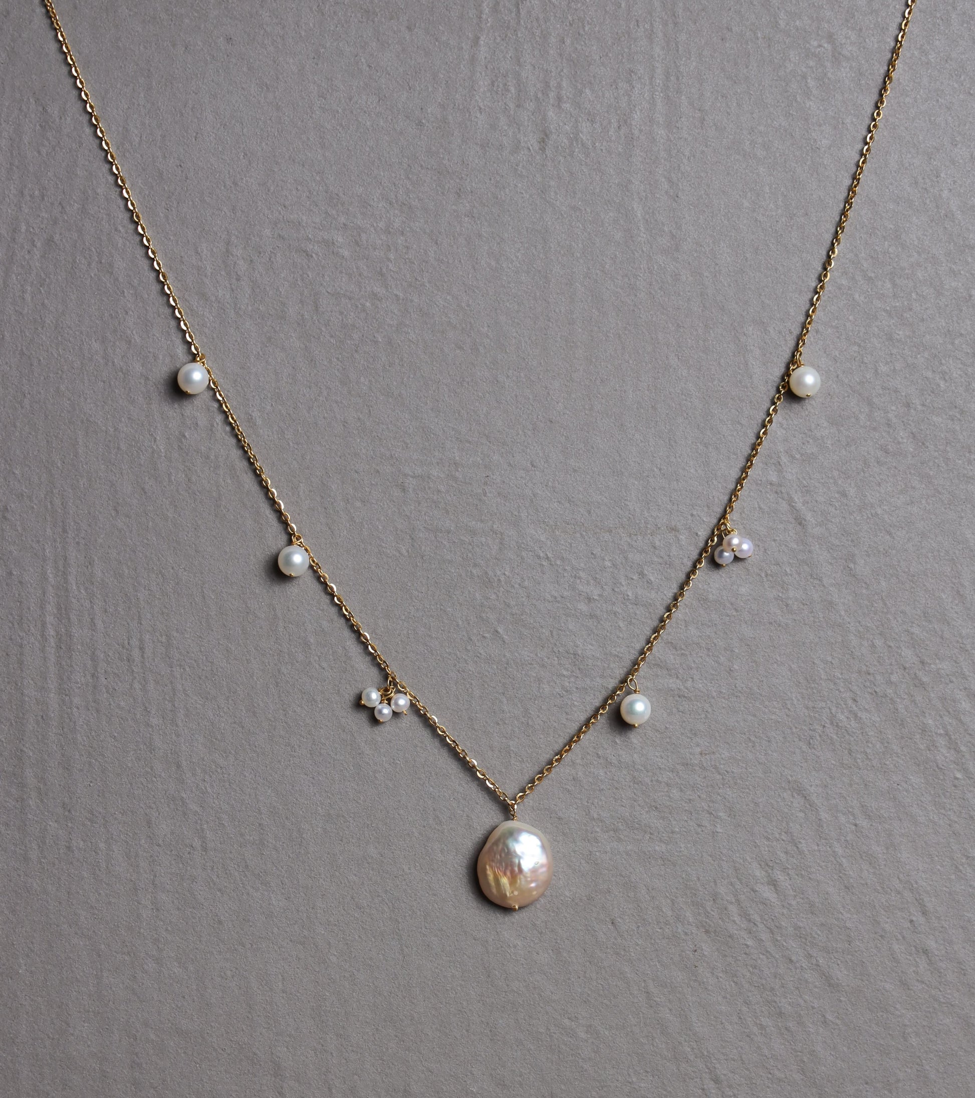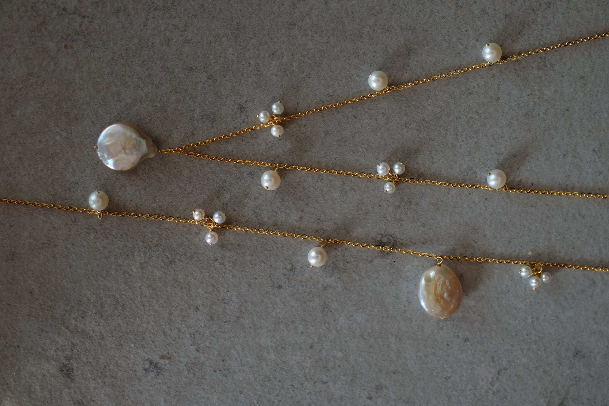 A merger of a bunch of unique and luminous freshwater pearls in various sizes shapes woven in 18k solid gold with a gold fill spring clasp. Our love for unusual and unexpected pearls aligns beautifully with the Japanese concept and belief of Wabi-Sabi.