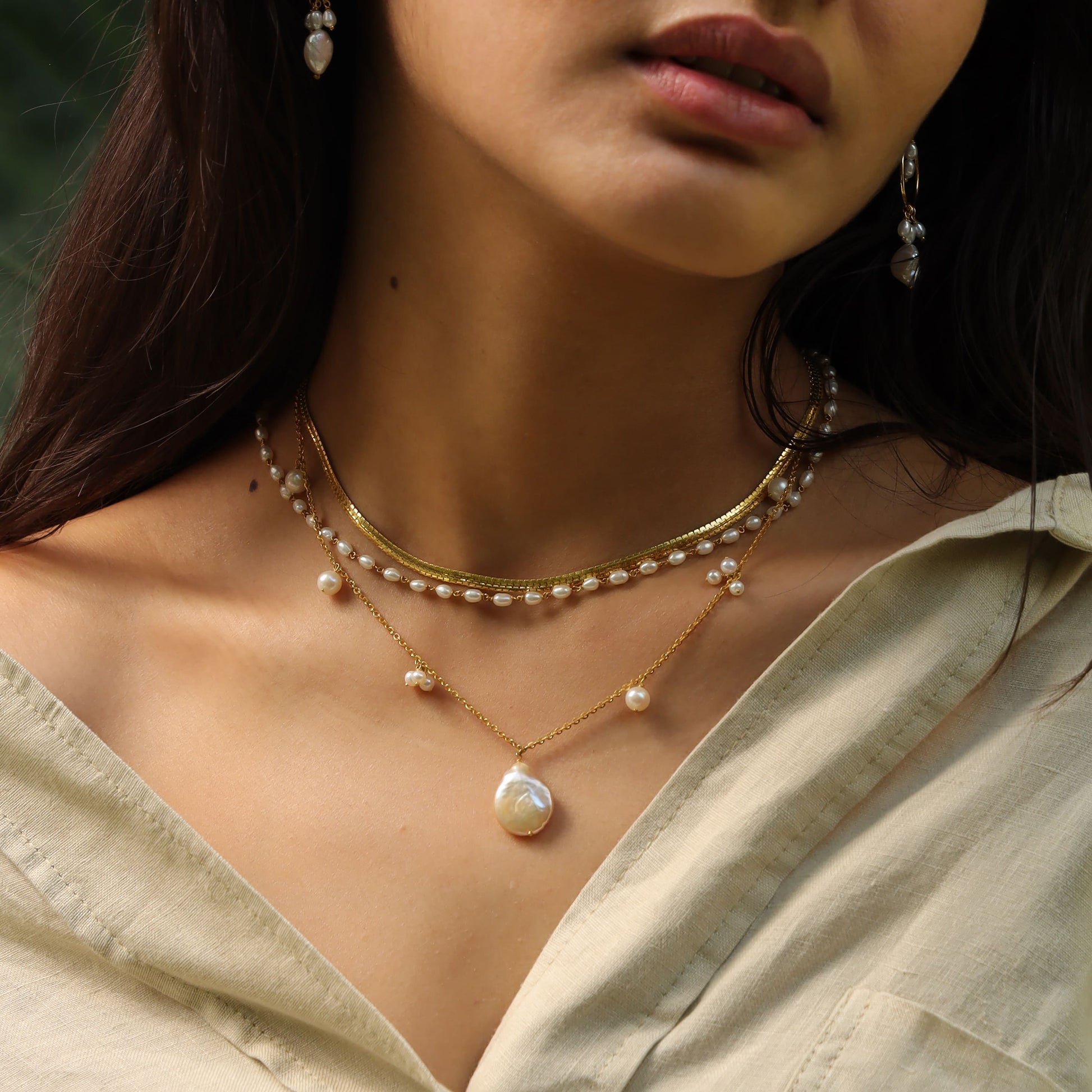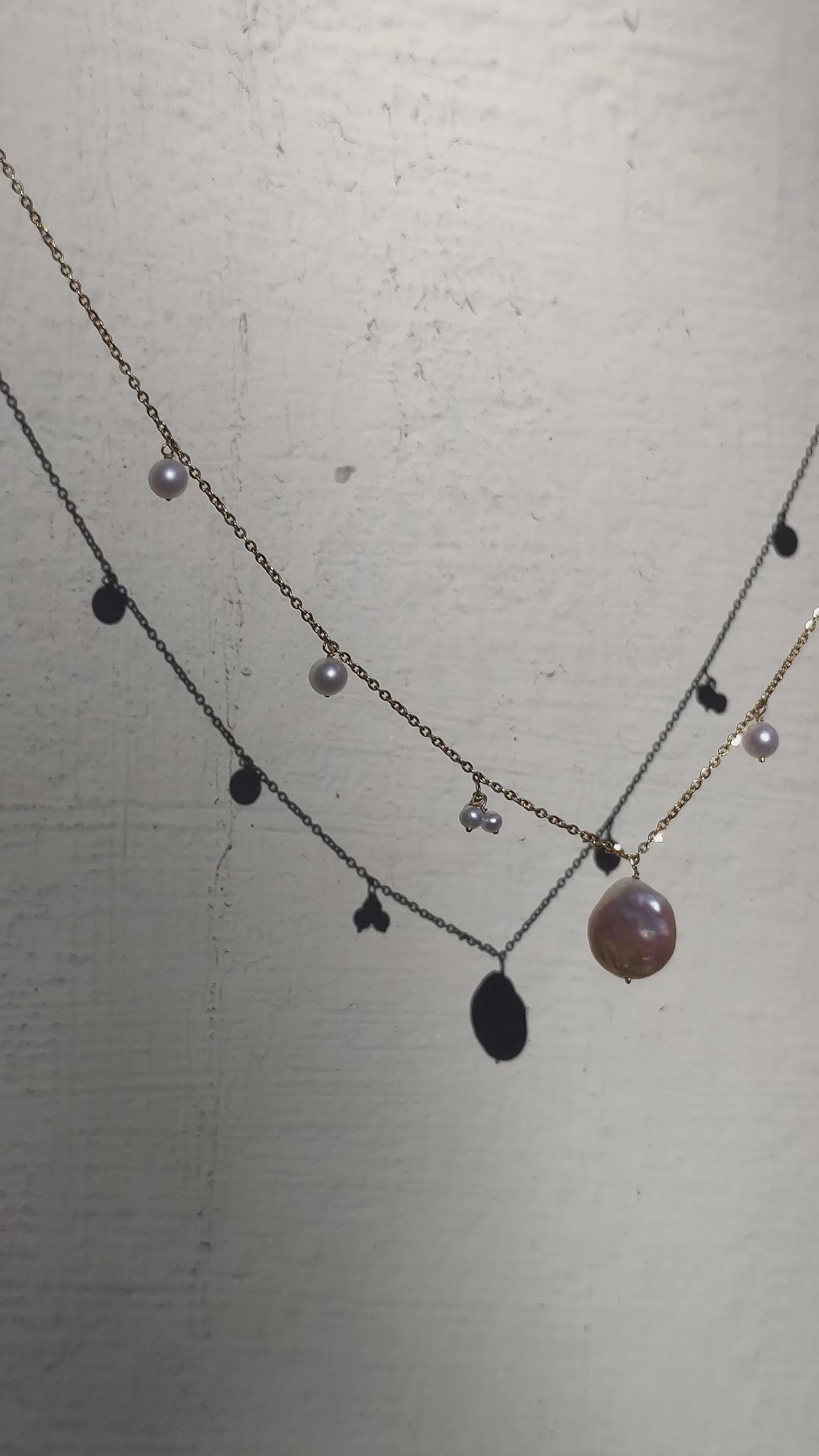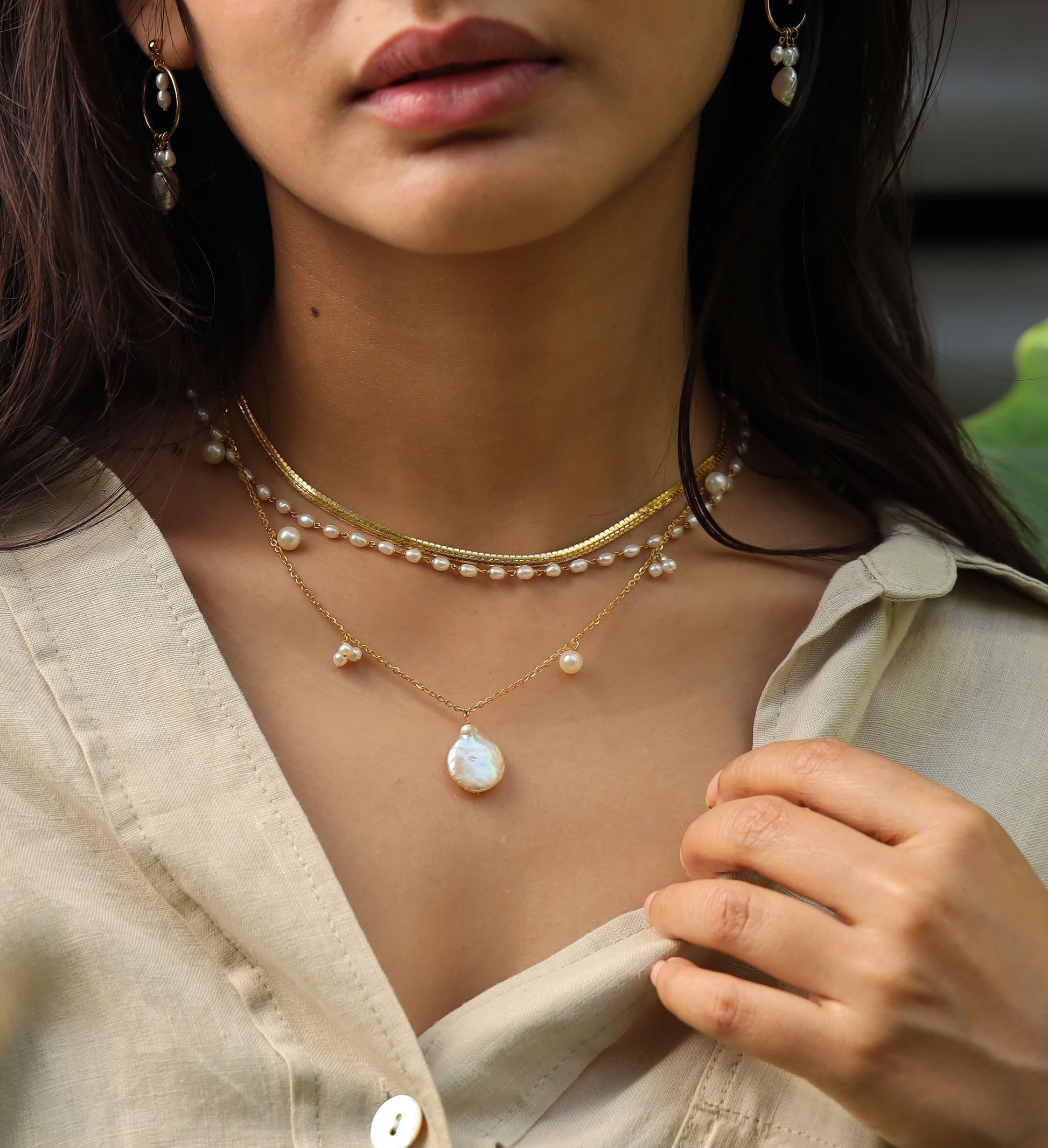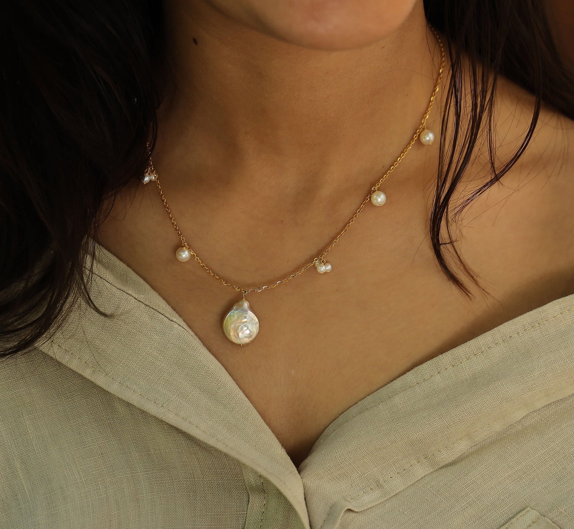 A merger of a bunch of unique and luminous freshwater pearls in various sizes shapes woven in 18k solid gold with a gold fill spring clasp. Our love for unusual and unexpected pearls aligns beautifully with the Japanese concept and belief of Wabi-Sabi.