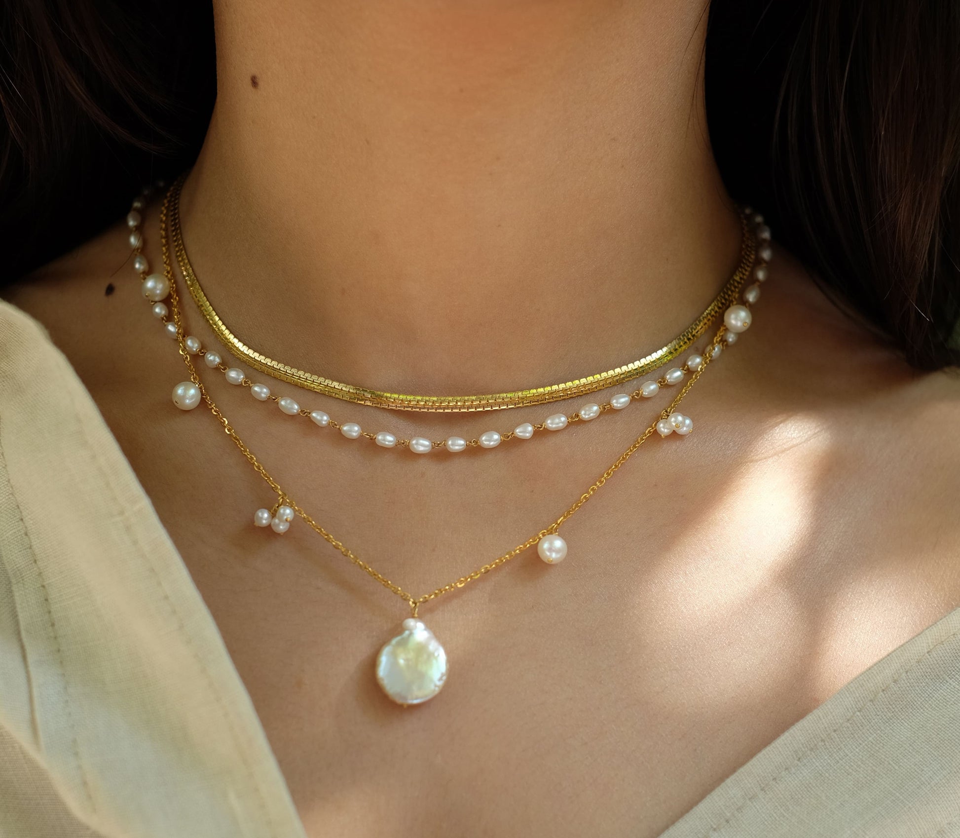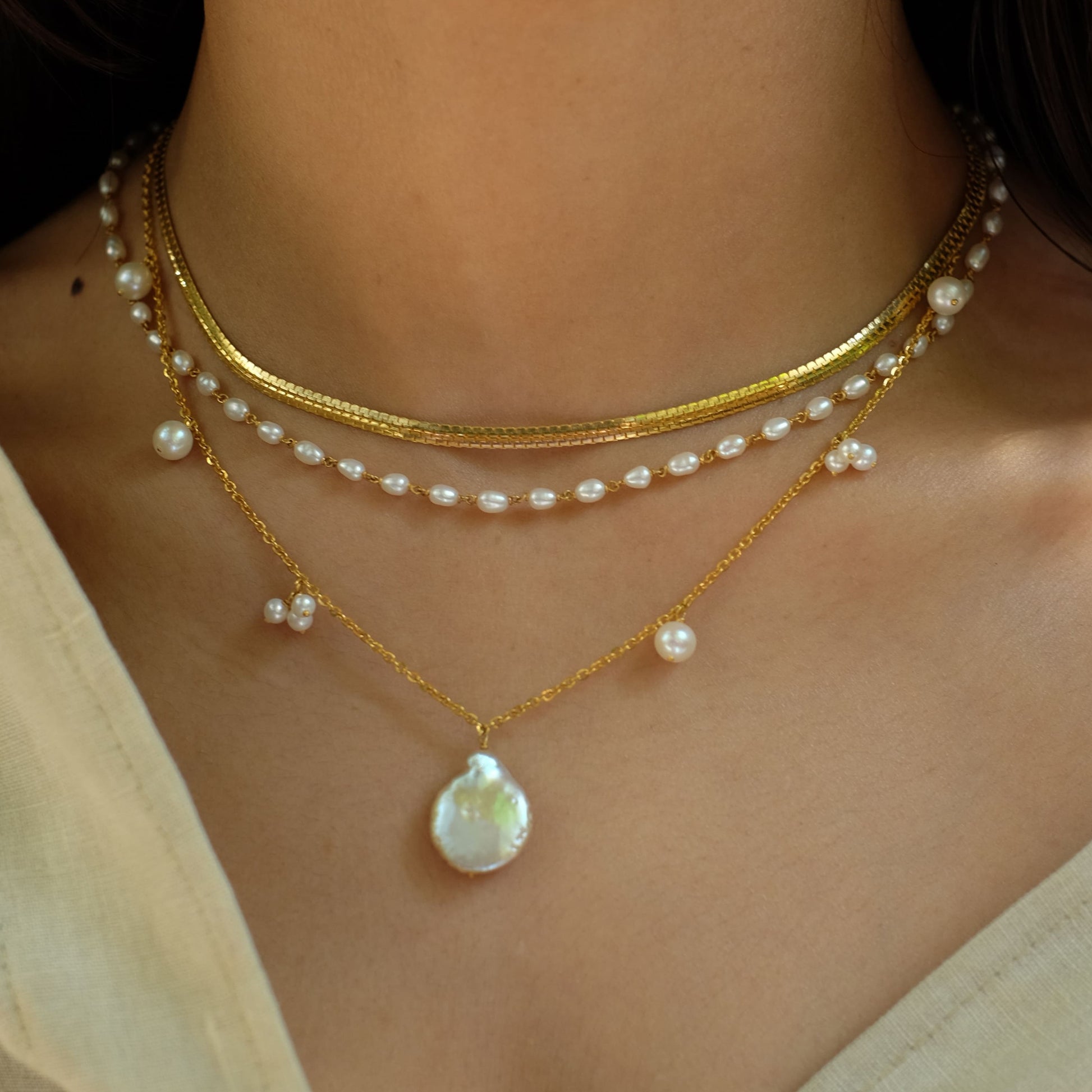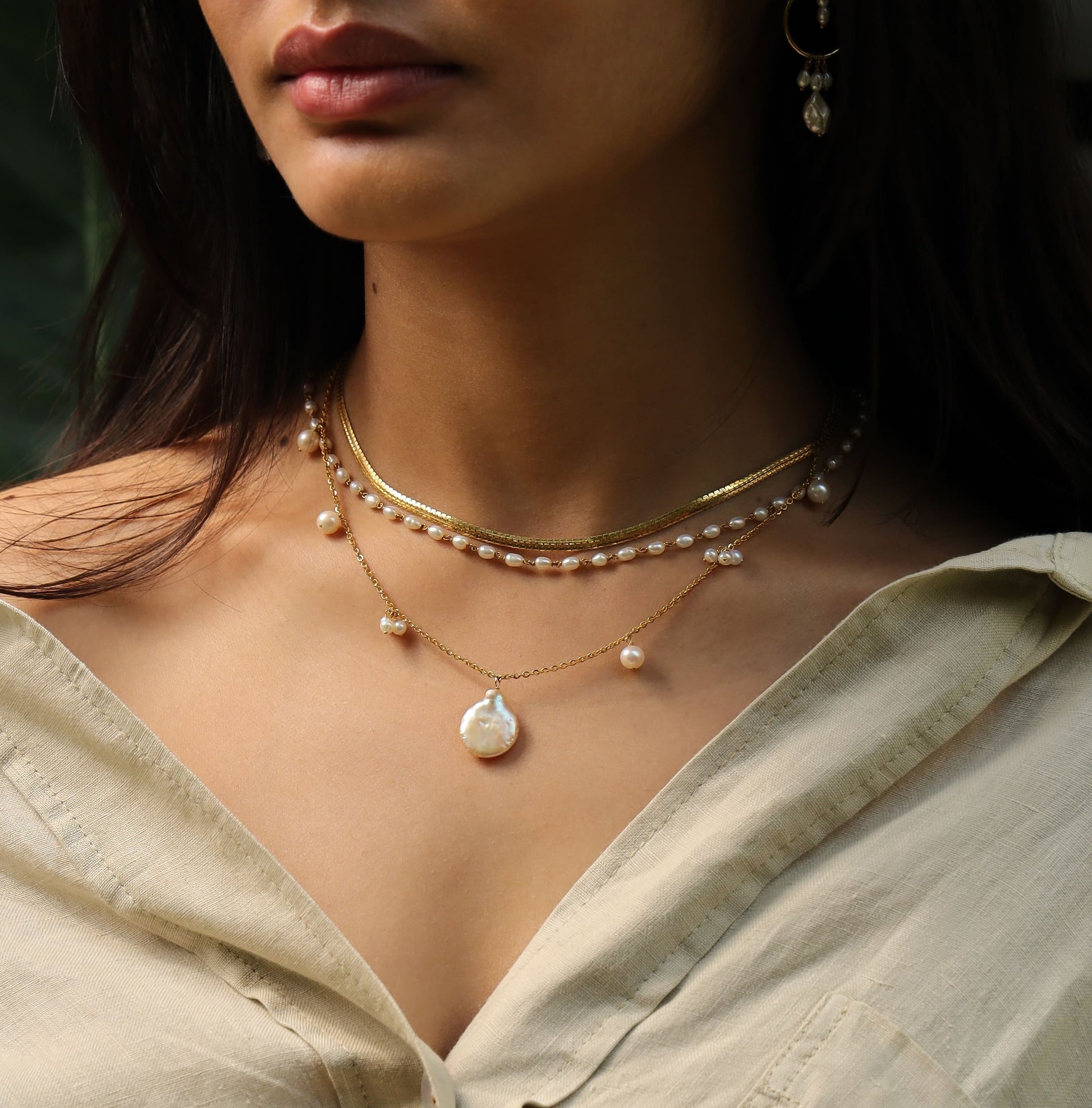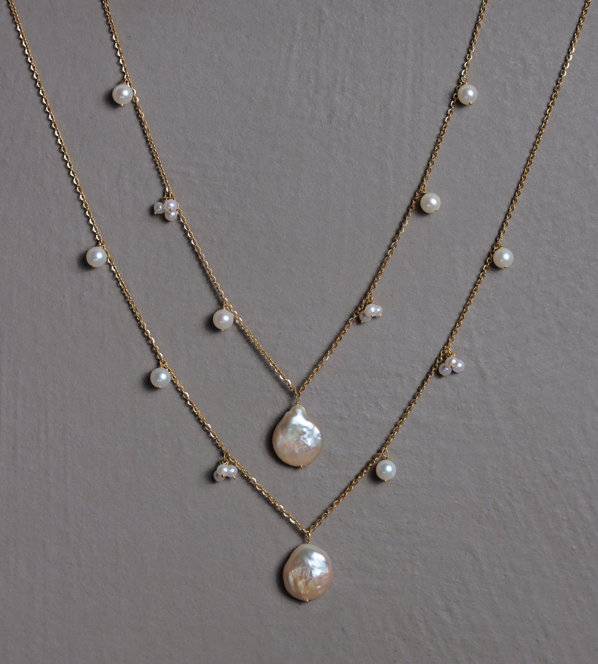 A merger of a bunch of unique and luminous freshwater pearls in various sizes shapes woven in 18k solid gold with a gold fill spring clasp. Our love for unusual and unexpected pearls aligns beautifully with the Japanese concept and belief of Wabi-Sabi.