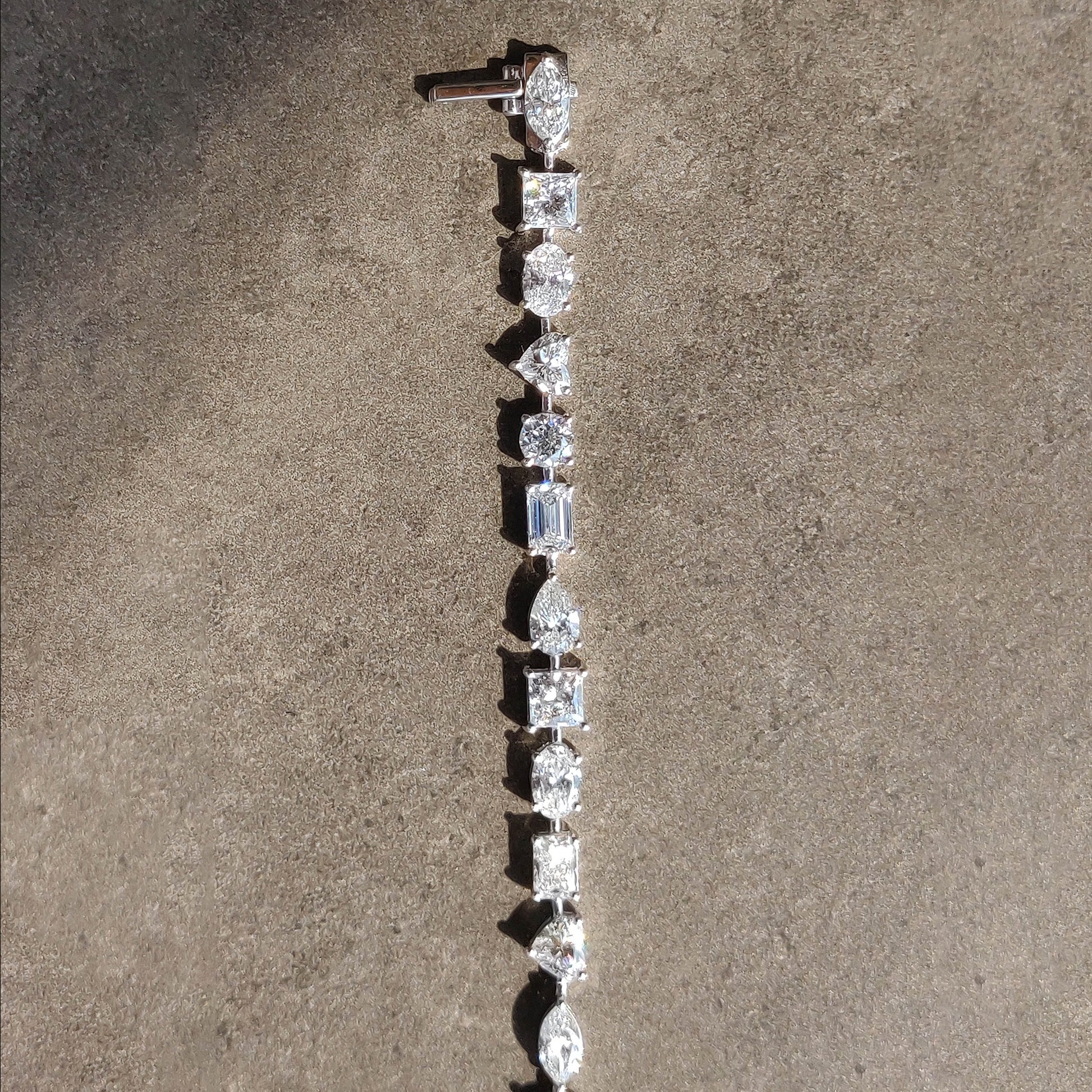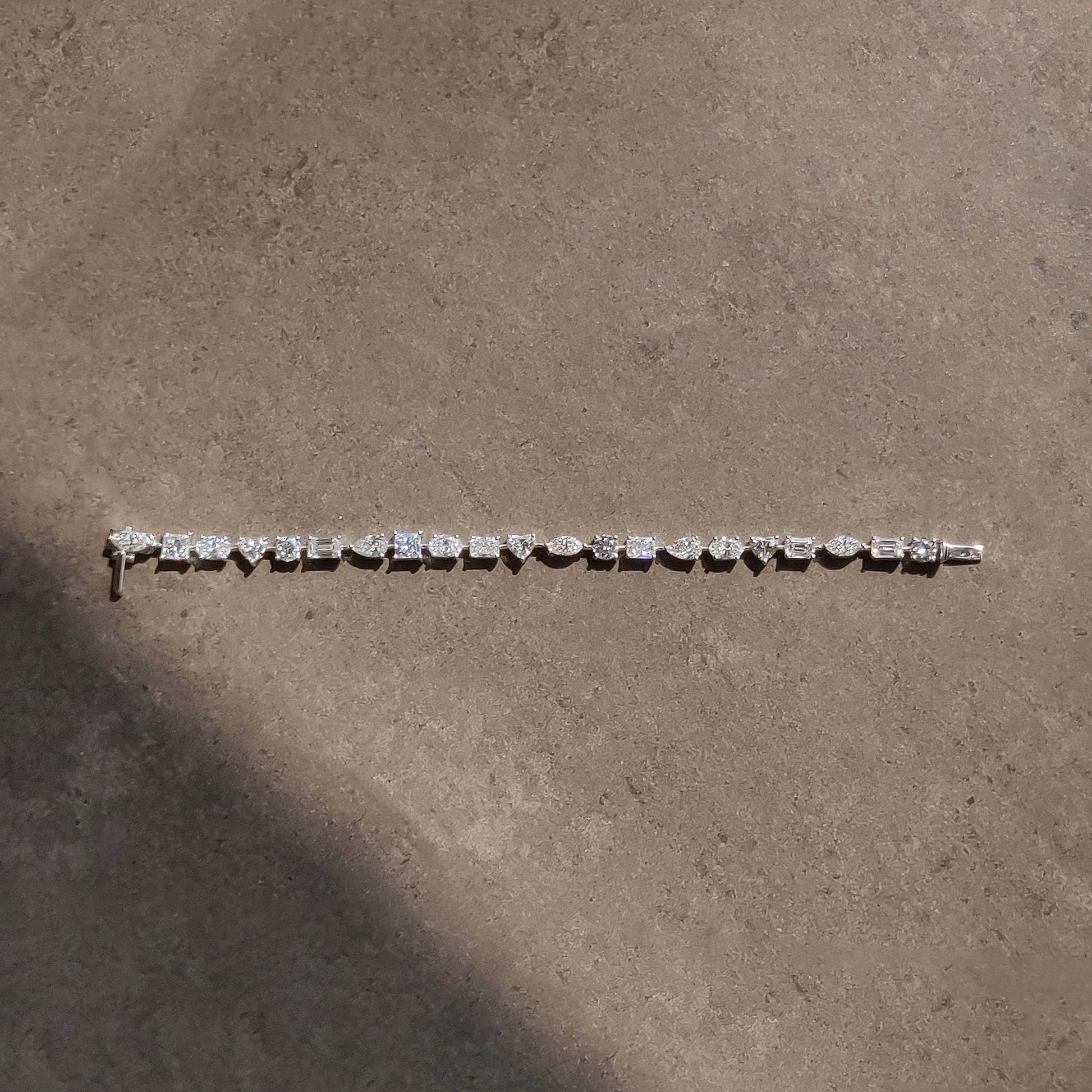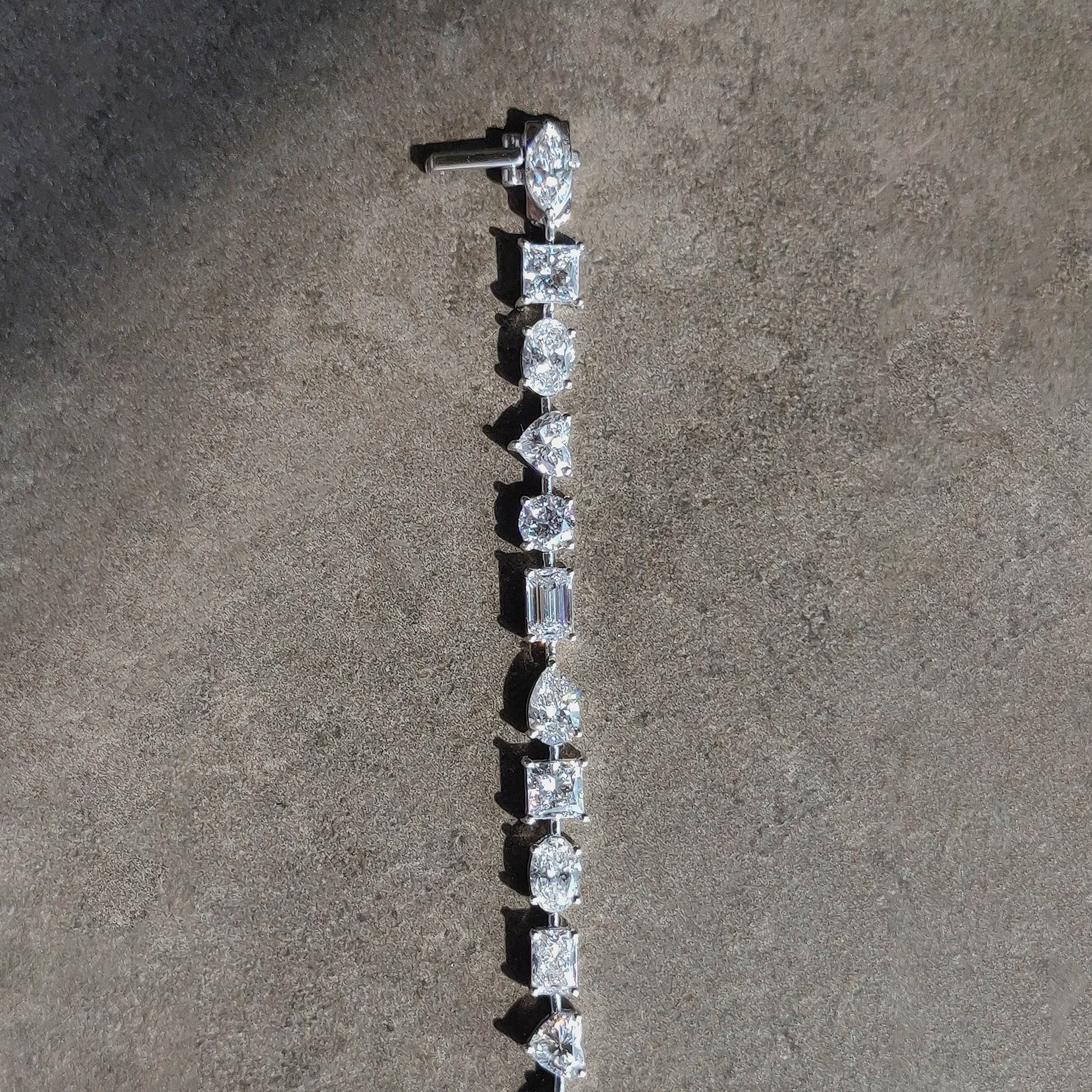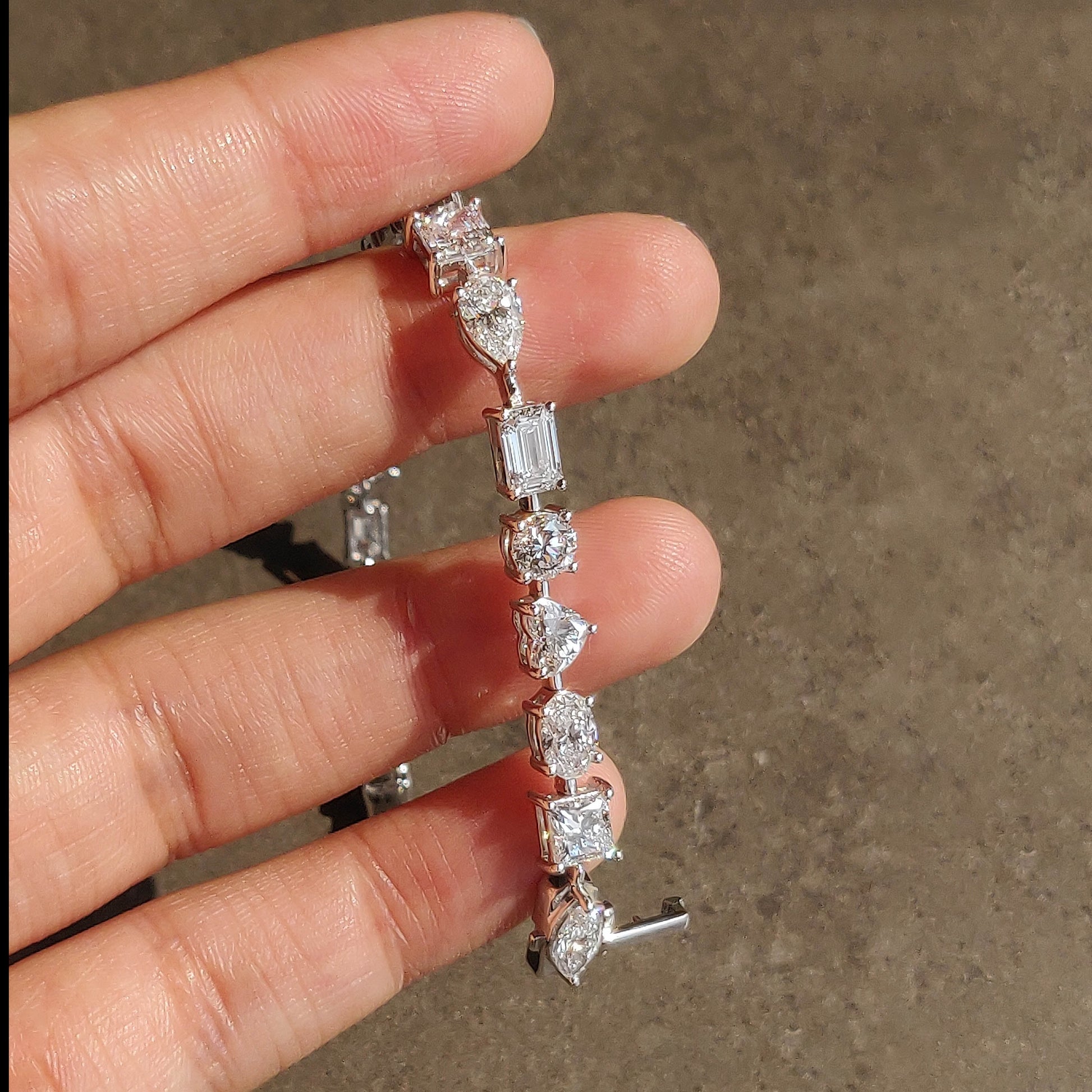 Experience the epitome of elegance with our multi-shape diamond tennis bracelet. Featuring approximately 0.45 pointer diamonds each, this bracelet showcases the unique beauty of each individual cut. Crafted with the utmost precision, it celebrates the purity and fire of our exquisite 'Nyamah' diamonds. With sleek and elegant silhouettes, this timeless design embodies luxurious sophistication. Adorn your wrist with a piece that exudes timeless charm, destined to be cherished for a lifetime.