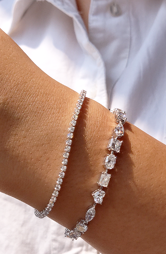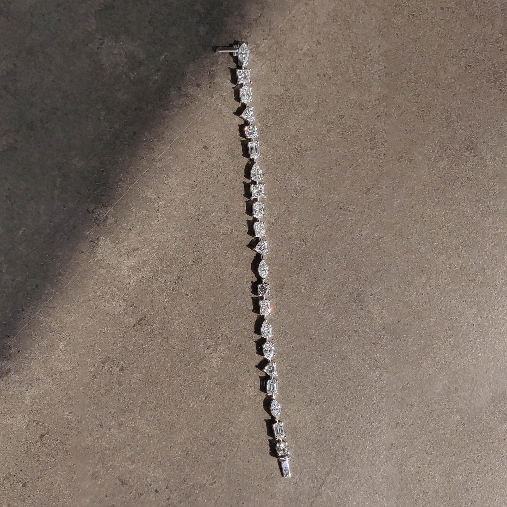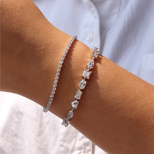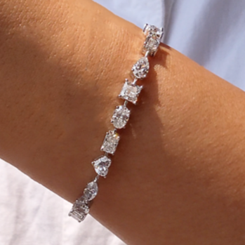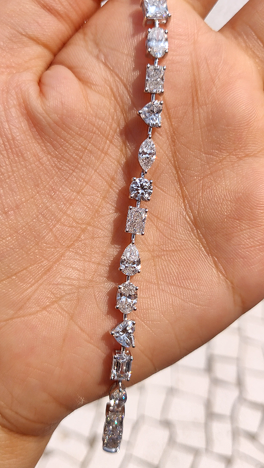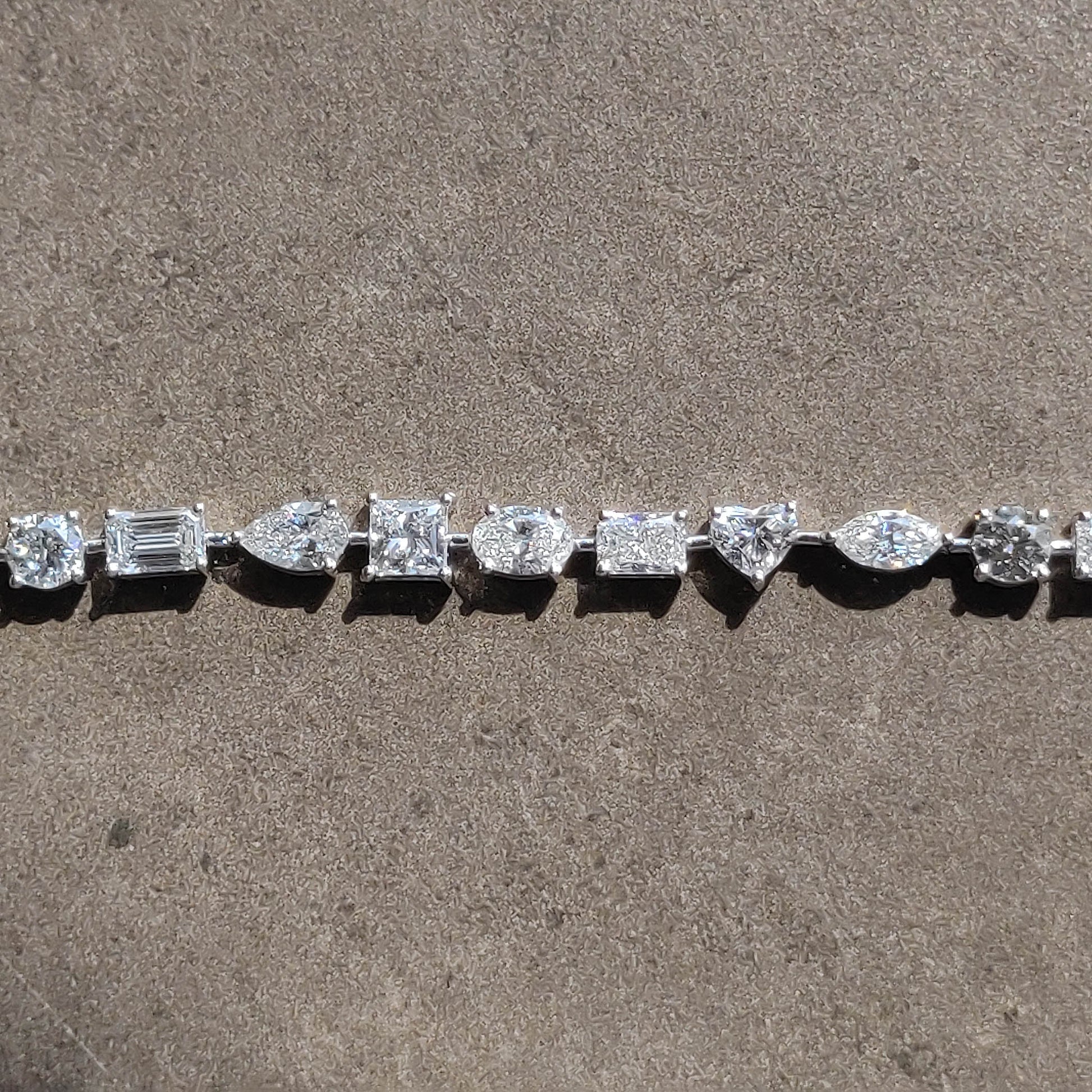 Experience the epitome of elegance with our multi-shape diamond tennis bracelet. Featuring approximately 0.45 pointer diamonds each, this bracelet showcases the unique beauty of each individual cut. Crafted with the utmost precision, it celebrates the purity and fire of our exquisite 'Nyamah' diamonds. With sleek and elegant silhouettes, this timeless design embodies luxurious sophistication. Adorn your wrist with a piece that exudes timeless charm, destined to be cherished for a lifetime.
