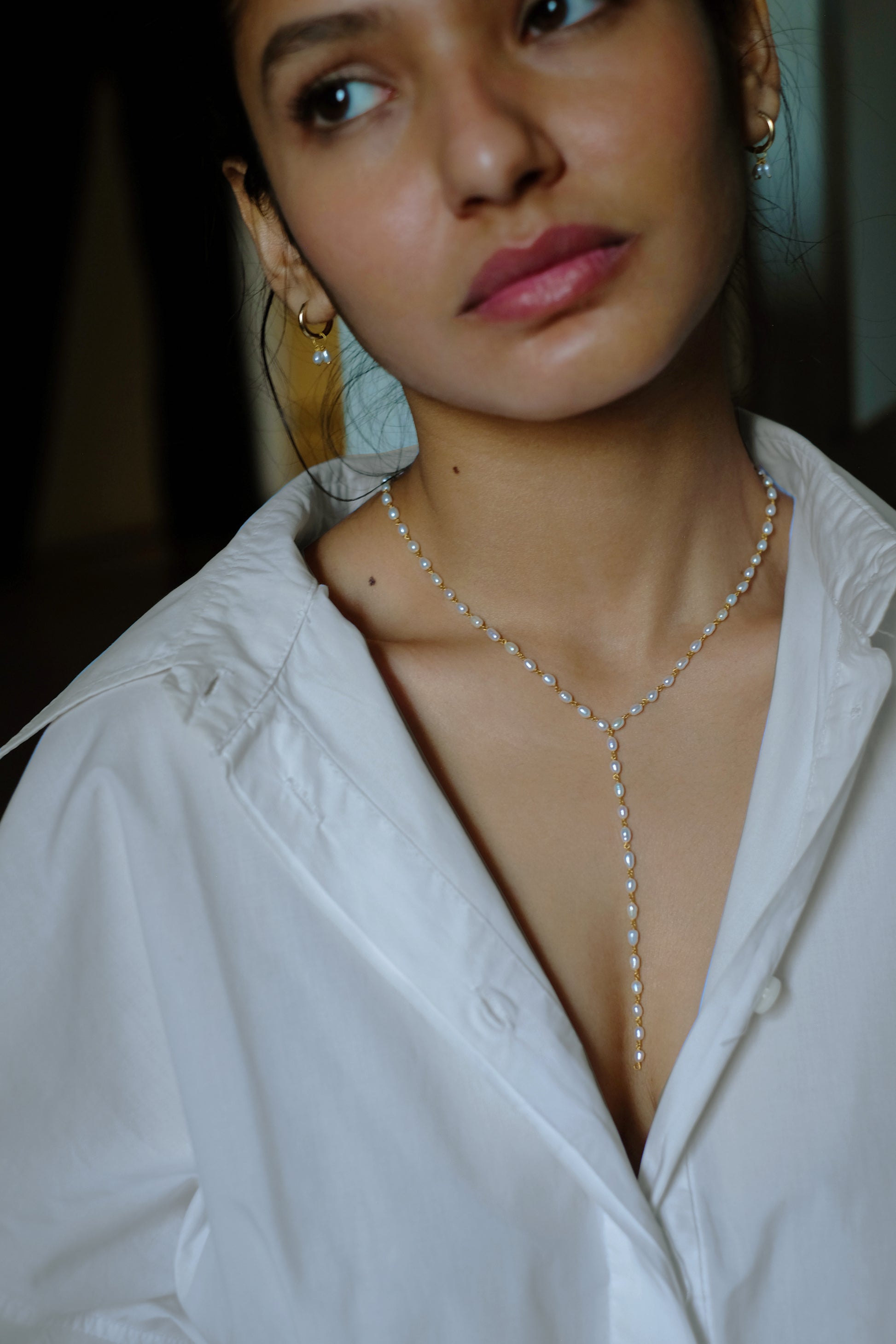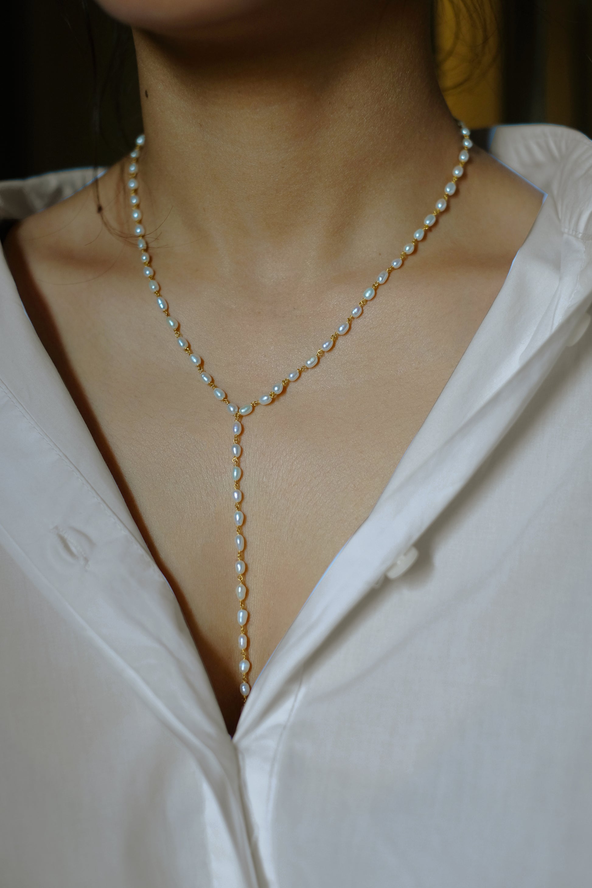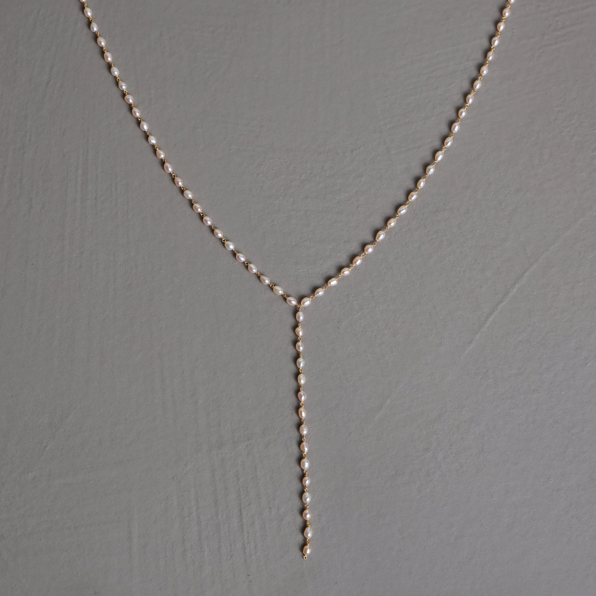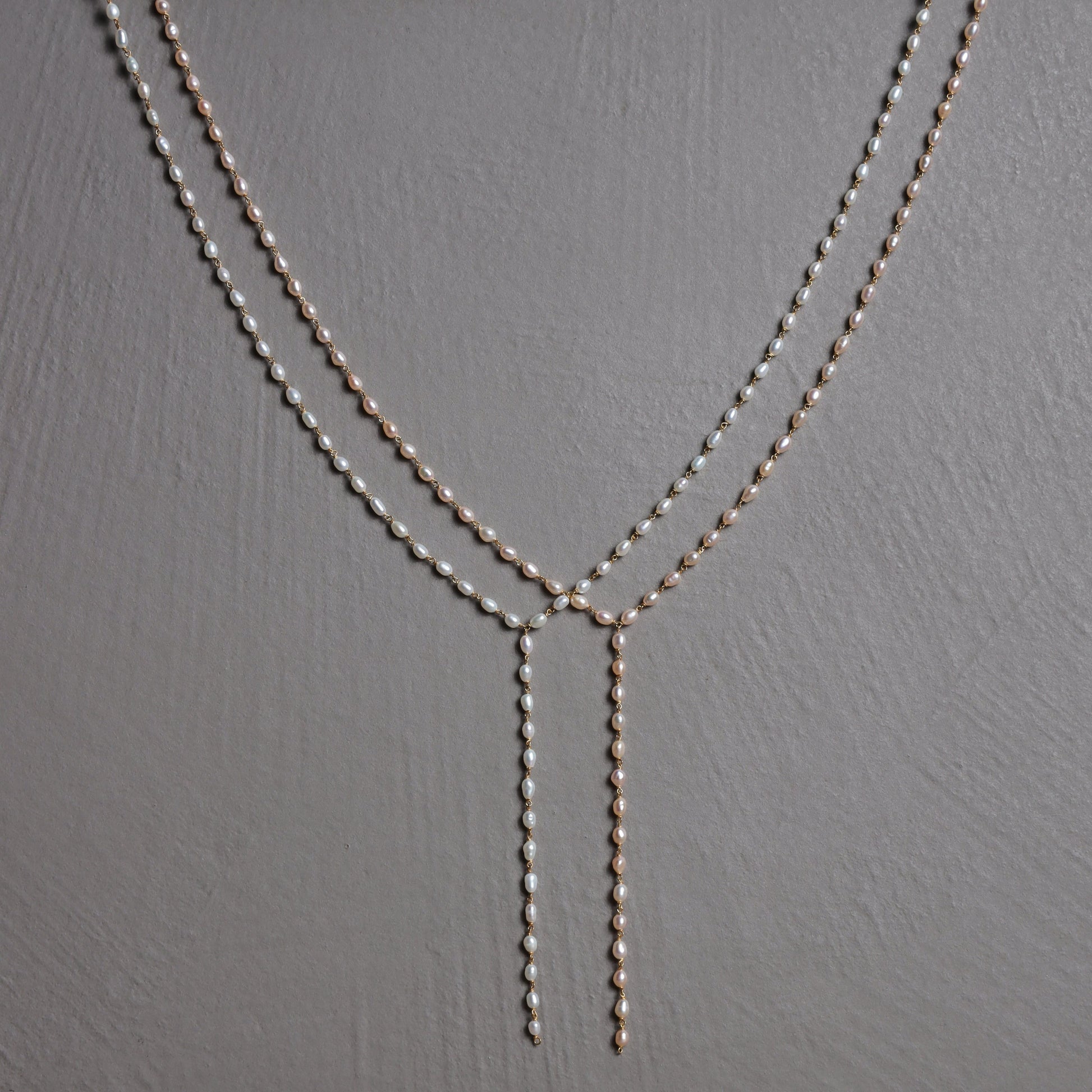 This subtle yet striking pearl lariat necklace features a drop chain of shimmering freshwater pearls for an elegant look. Wraps seductively around your neck to find the perfect resting point, but is securely held in back with the addition of a discreet clasp. Layers beautifully, an extra little glint of gold to peek out from below your favorite dress or autumn sweater. Available 18kt Solid Gold.