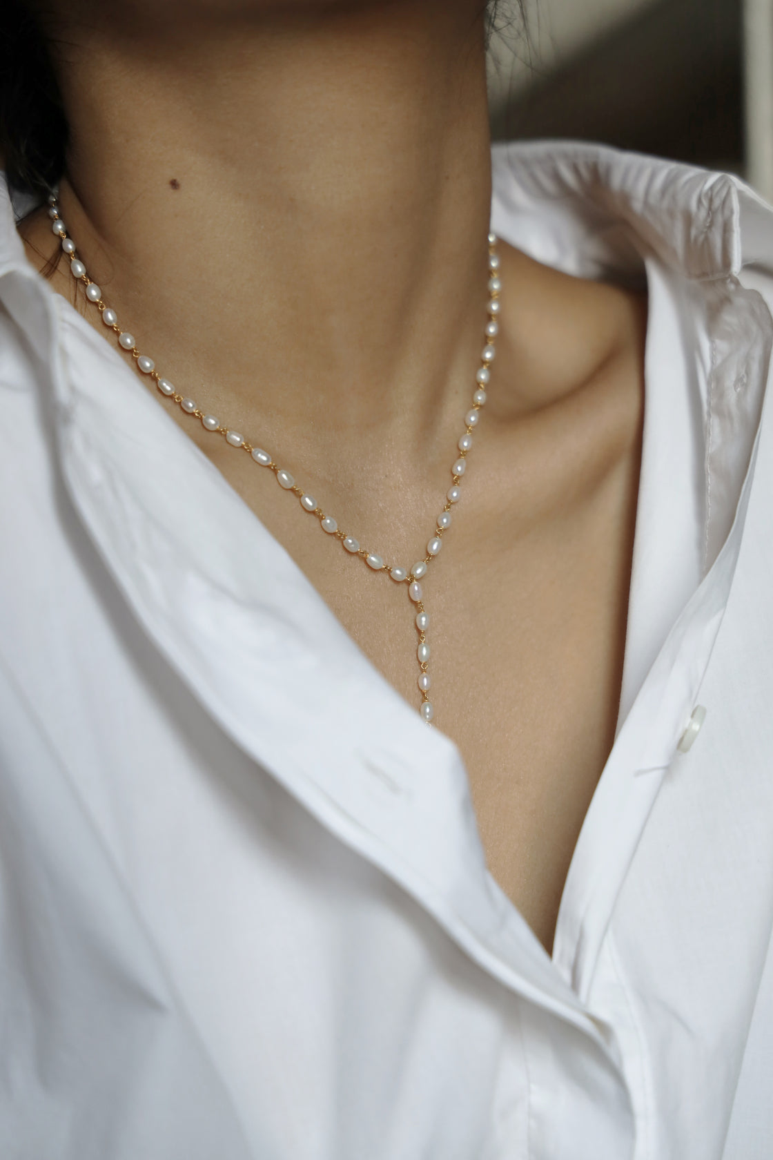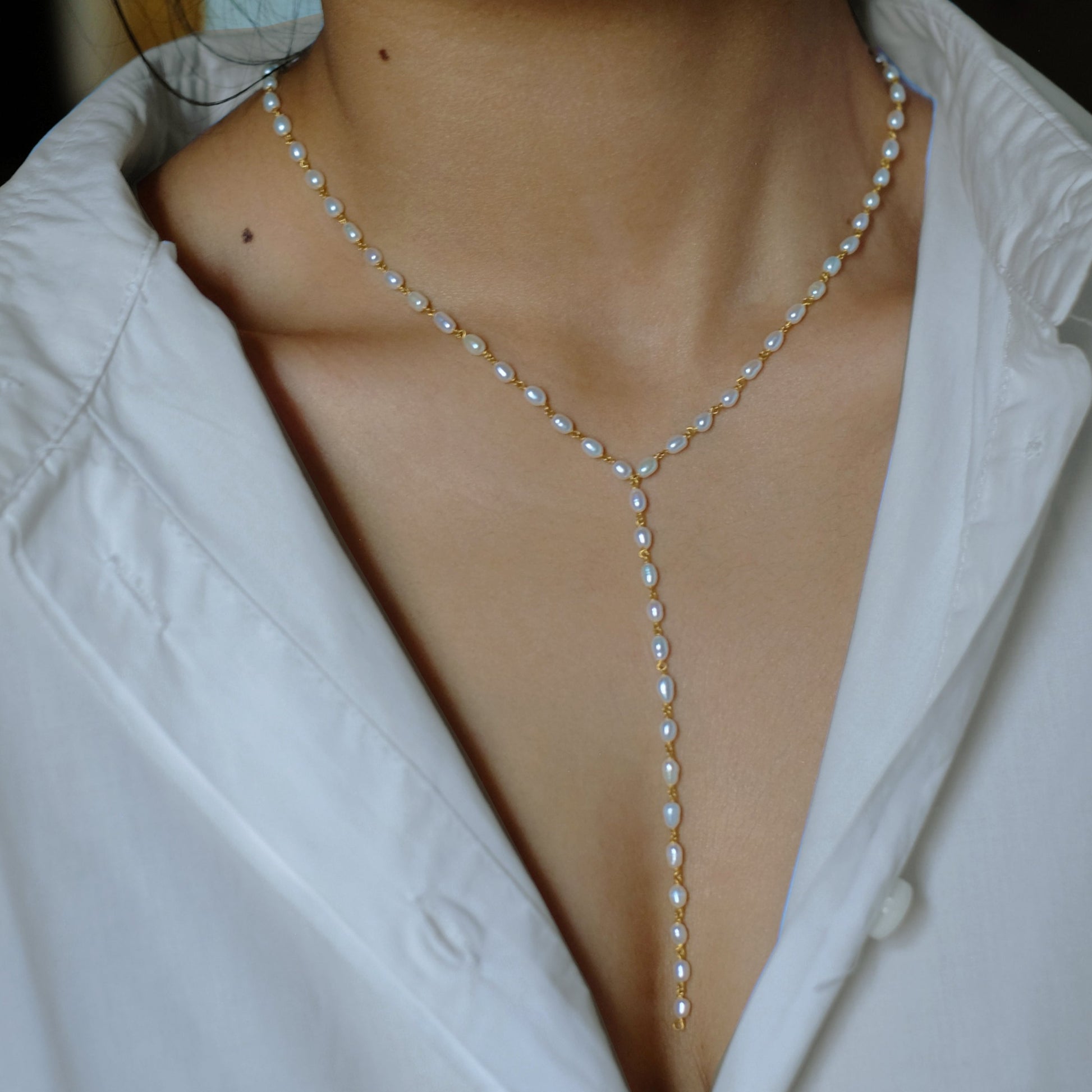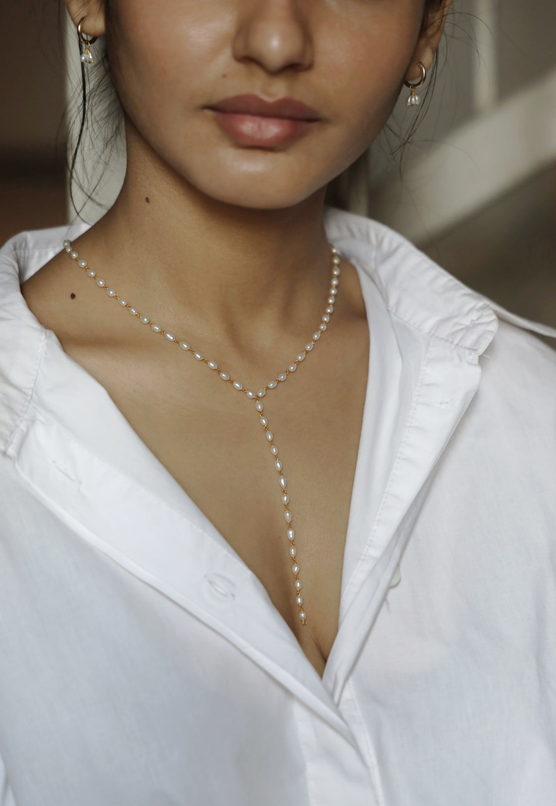 This subtle yet striking pearl lariat necklace features a drop chain of shimmering freshwater pearls for an elegant look. Wraps seductively around your neck to find the perfect resting point, but is securely held in back with the addition of a discreet clasp. Layers beautifully, an extra little glint of gold to peek out from below your favorite dress or autumn sweater. Available 18kt Solid Gold.