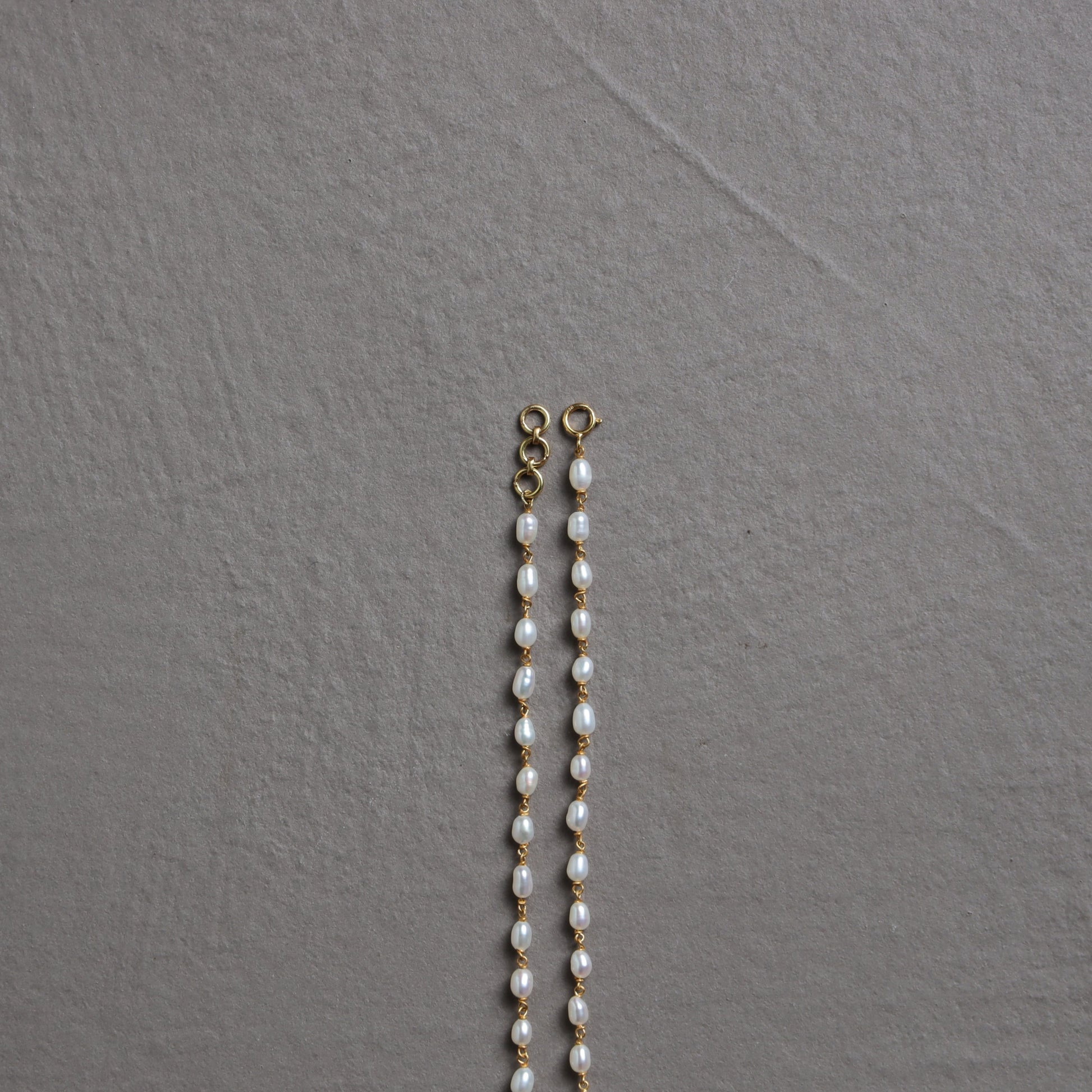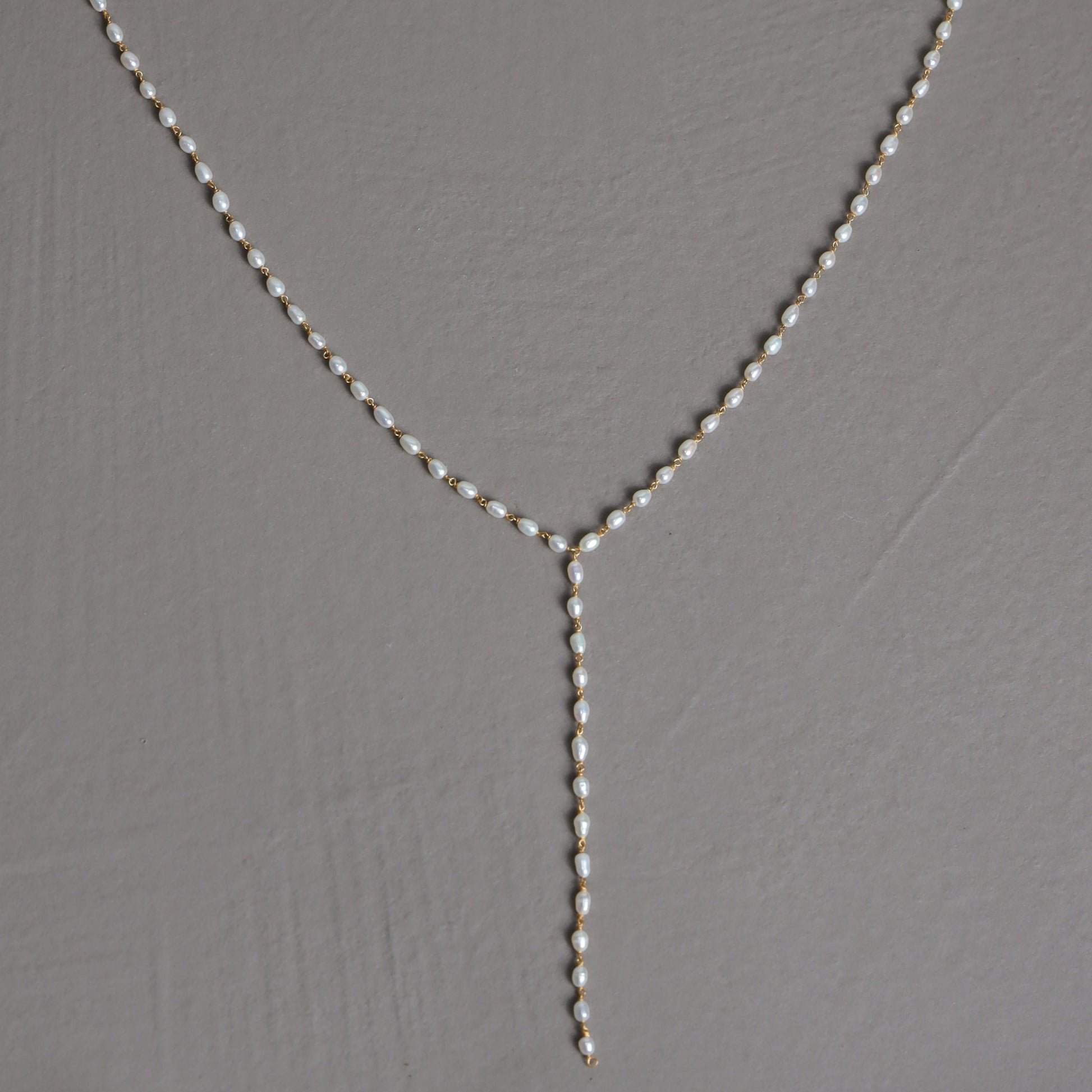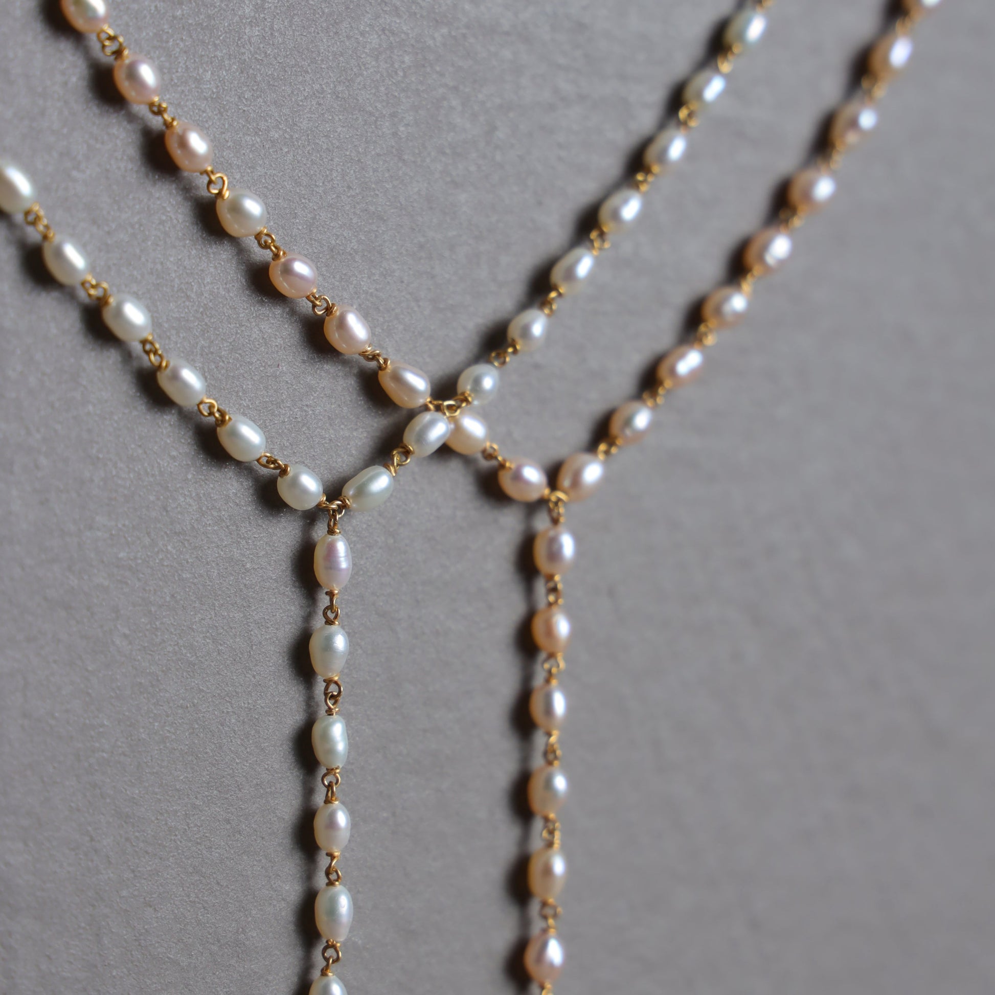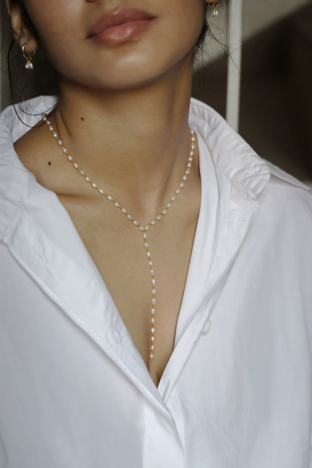 This subtle yet striking pearl lariat necklace features a drop chain of shimmering freshwater pearls for an elegant look. Wraps seductively around your neck to find the perfect resting point, but is securely held in back with the addition of a discreet clasp. Layers beautifully, an extra little glint of gold to peek out from below your favorite dress or autumn sweater. Available 18kt Solid Gold.