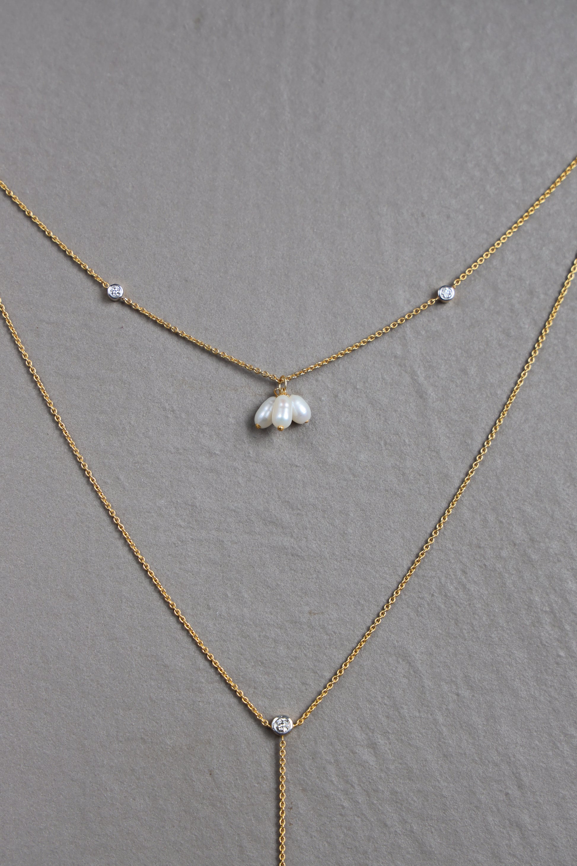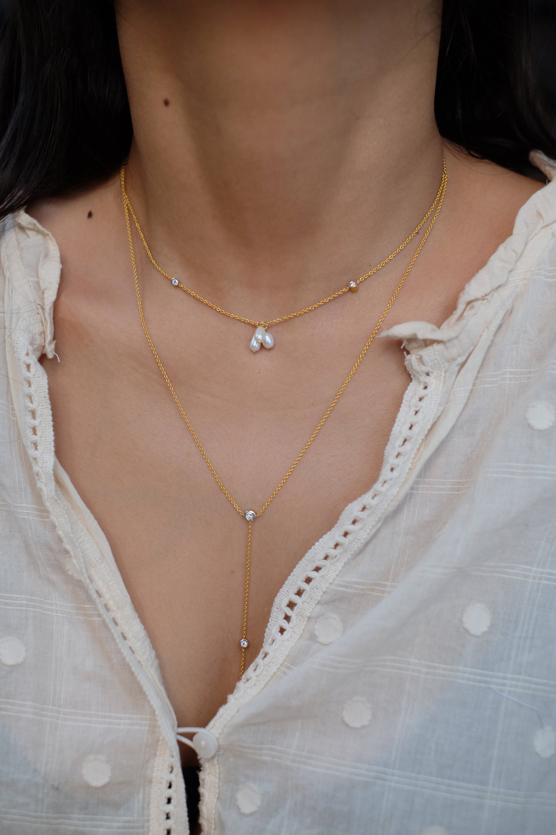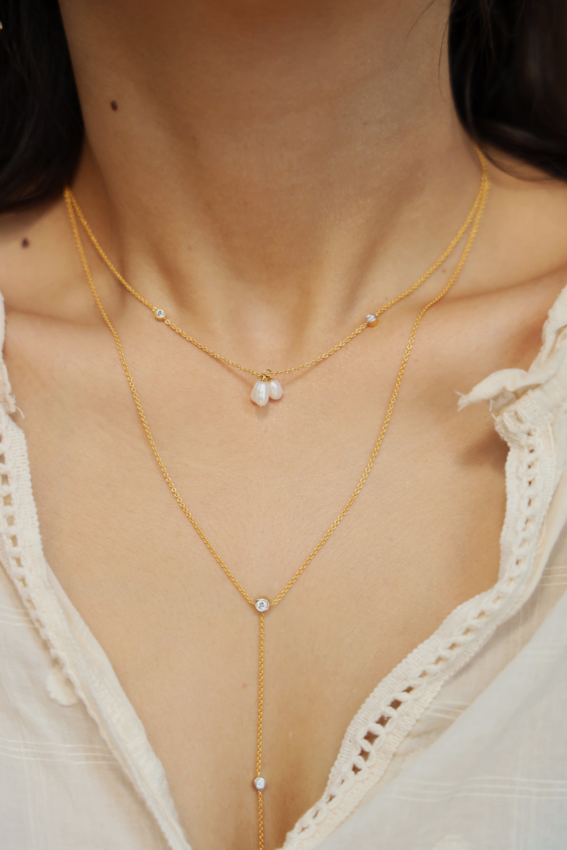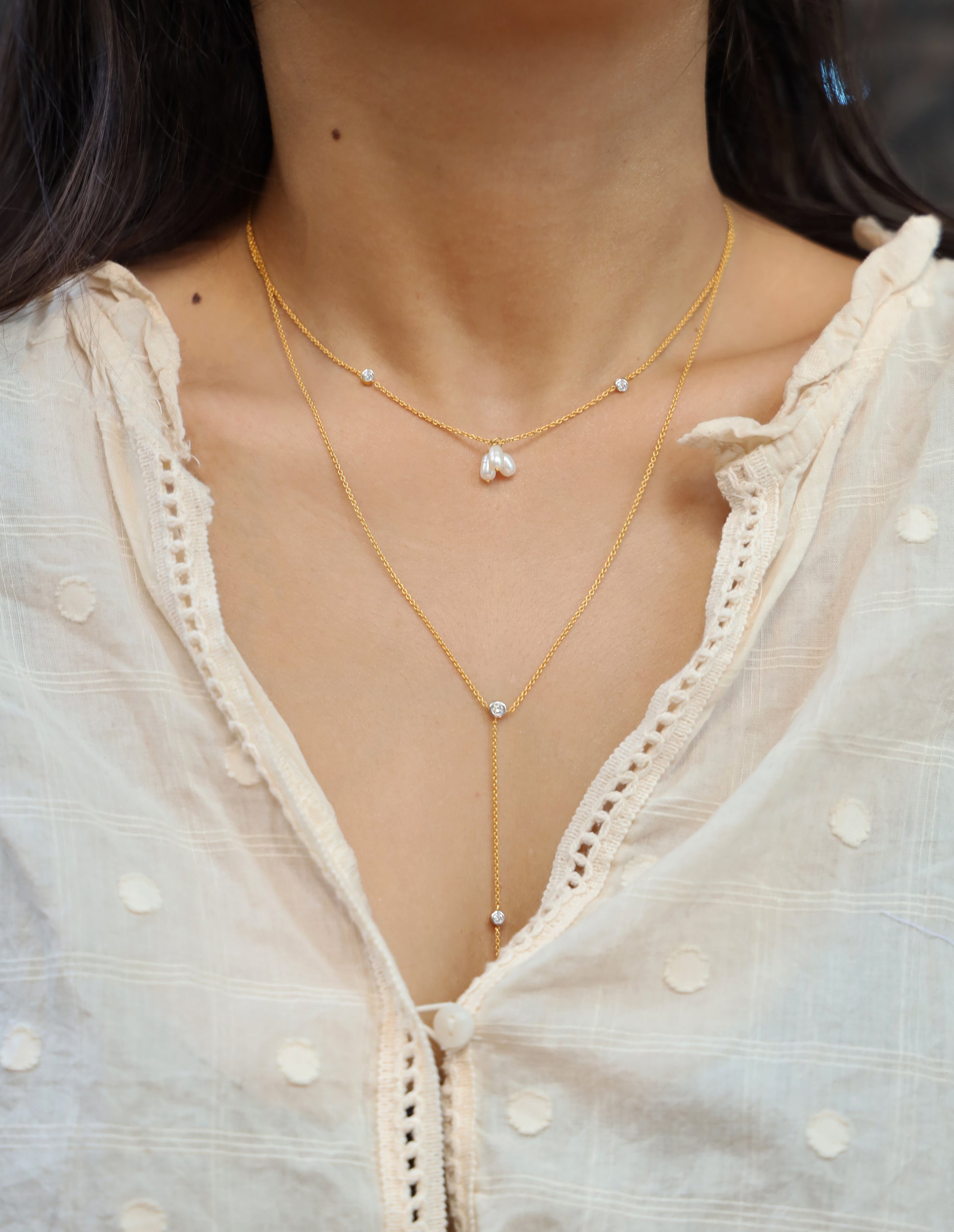 This subtle yet striking gold, diamond and pearl lariat necklace features a drop chain of shimmering diamonds for an elegant look. Available in 18k Solid Gold.