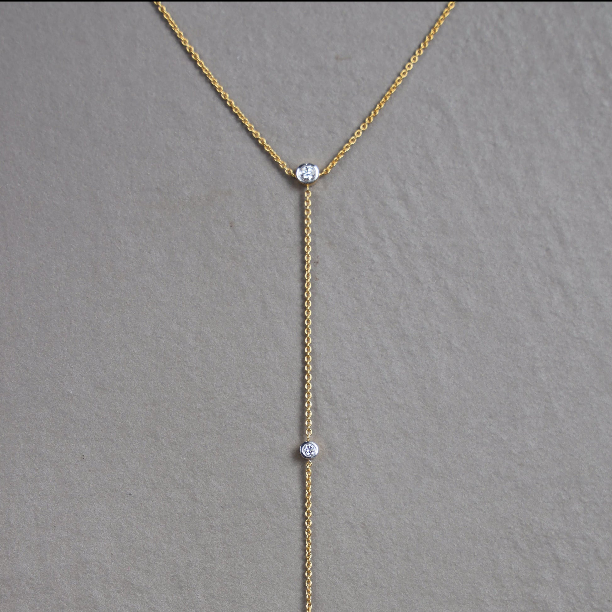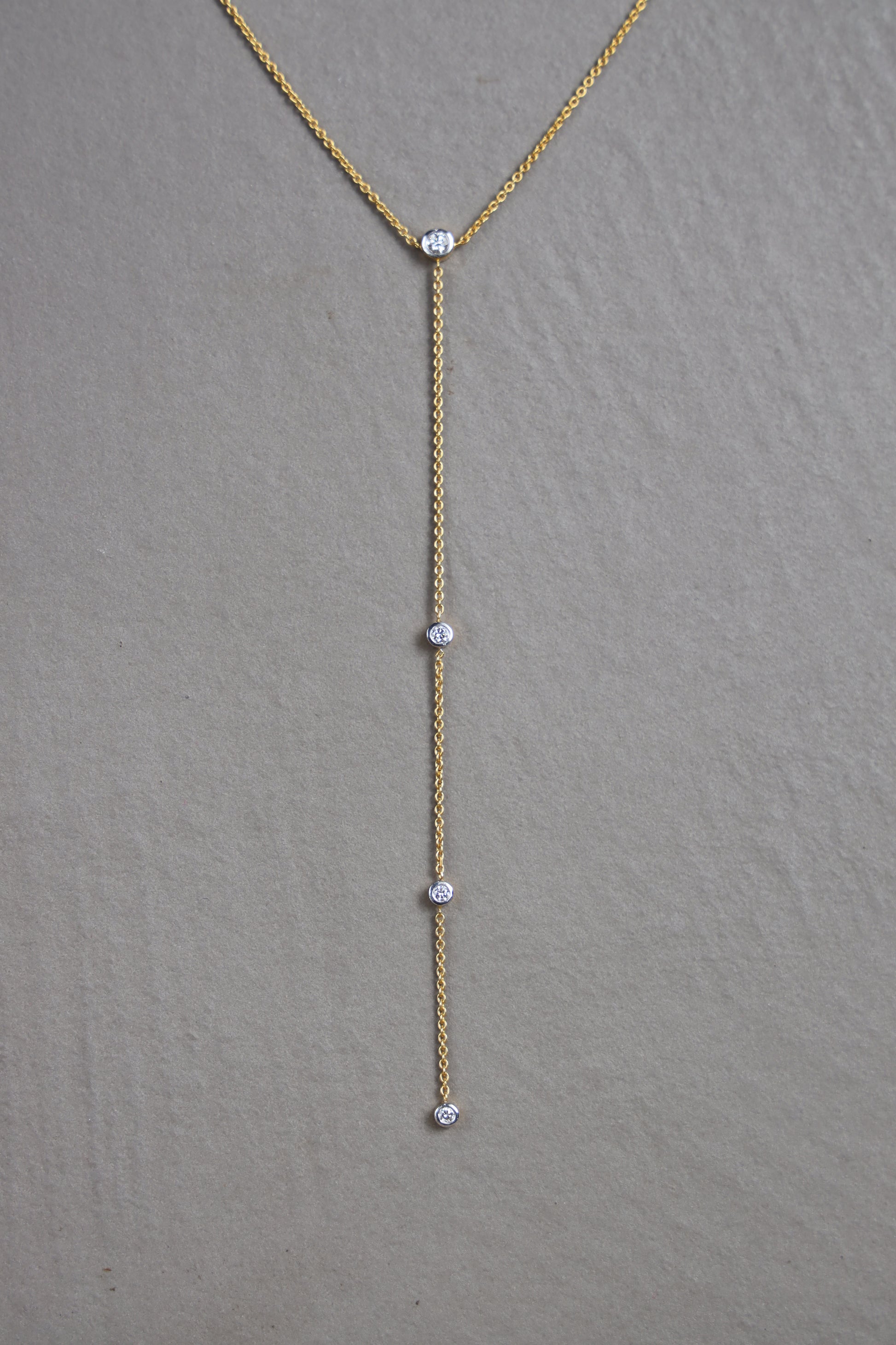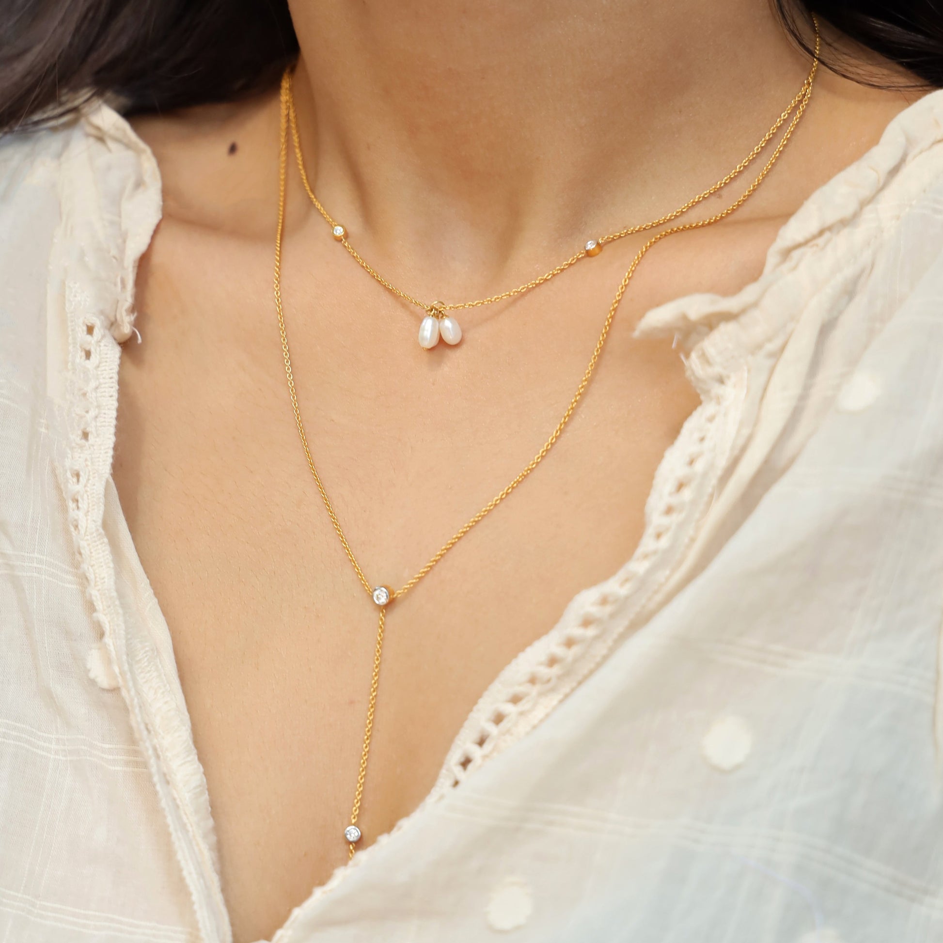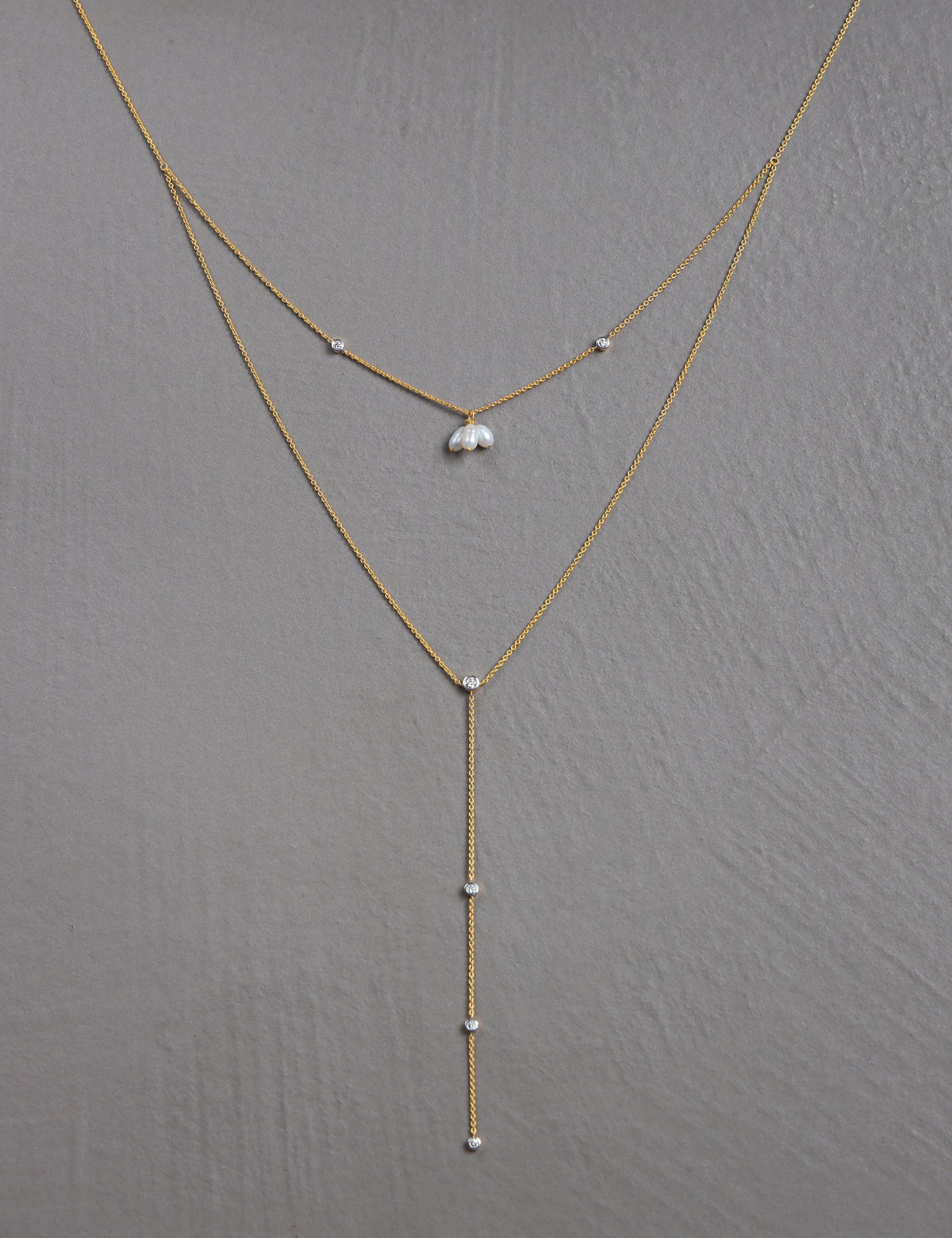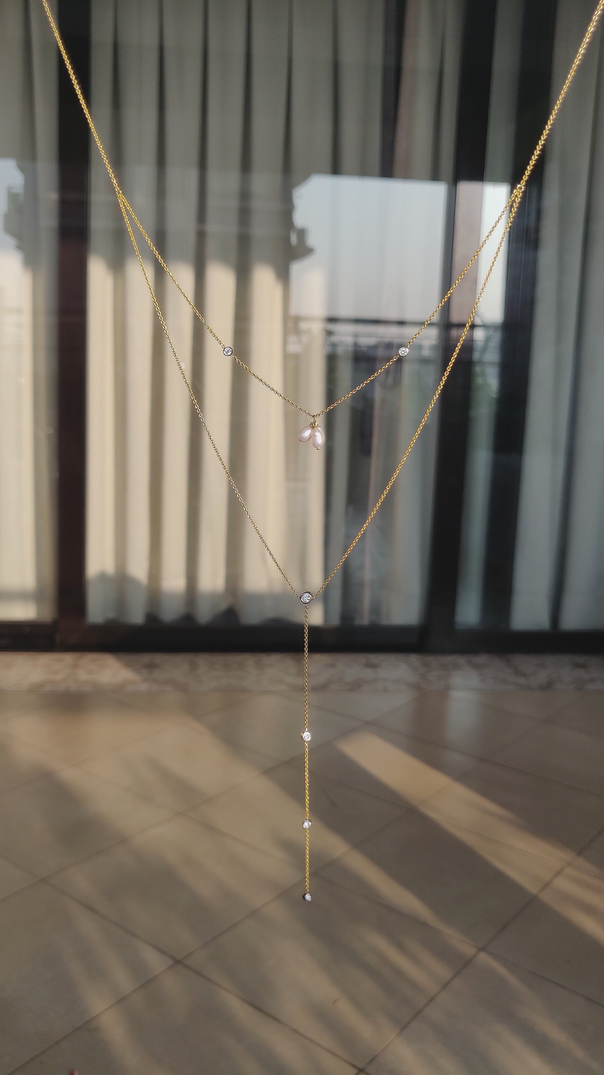 This subtle yet striking gold, diamond and pearl lariat necklace features a drop chain of shimmering diamonds for an elegant look. Available in 18k Solid Gold.