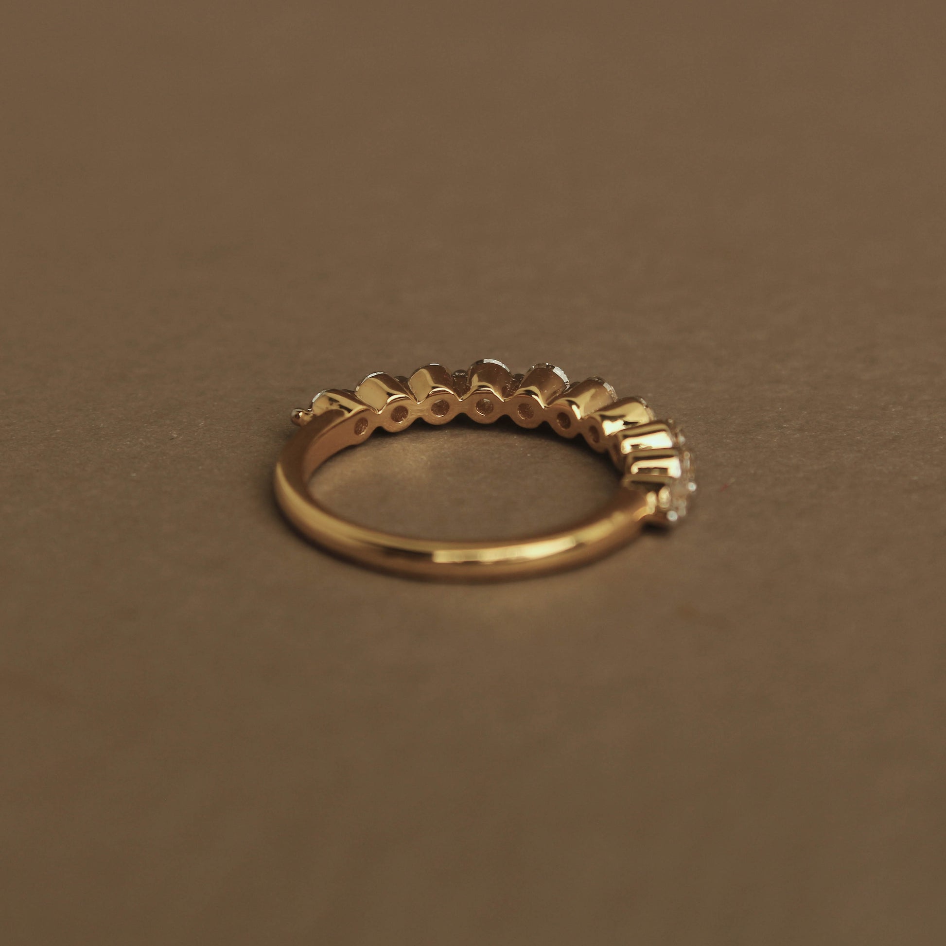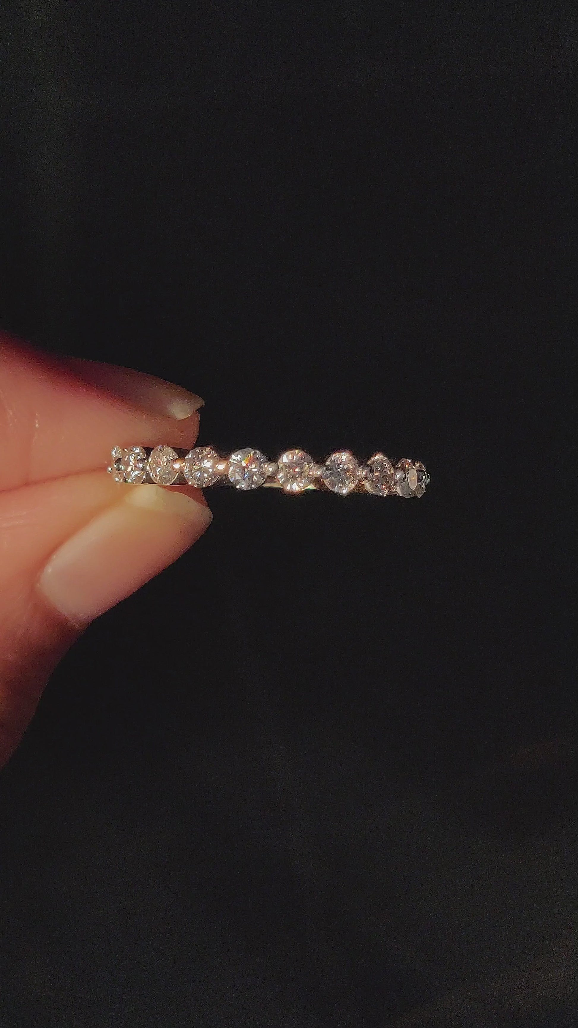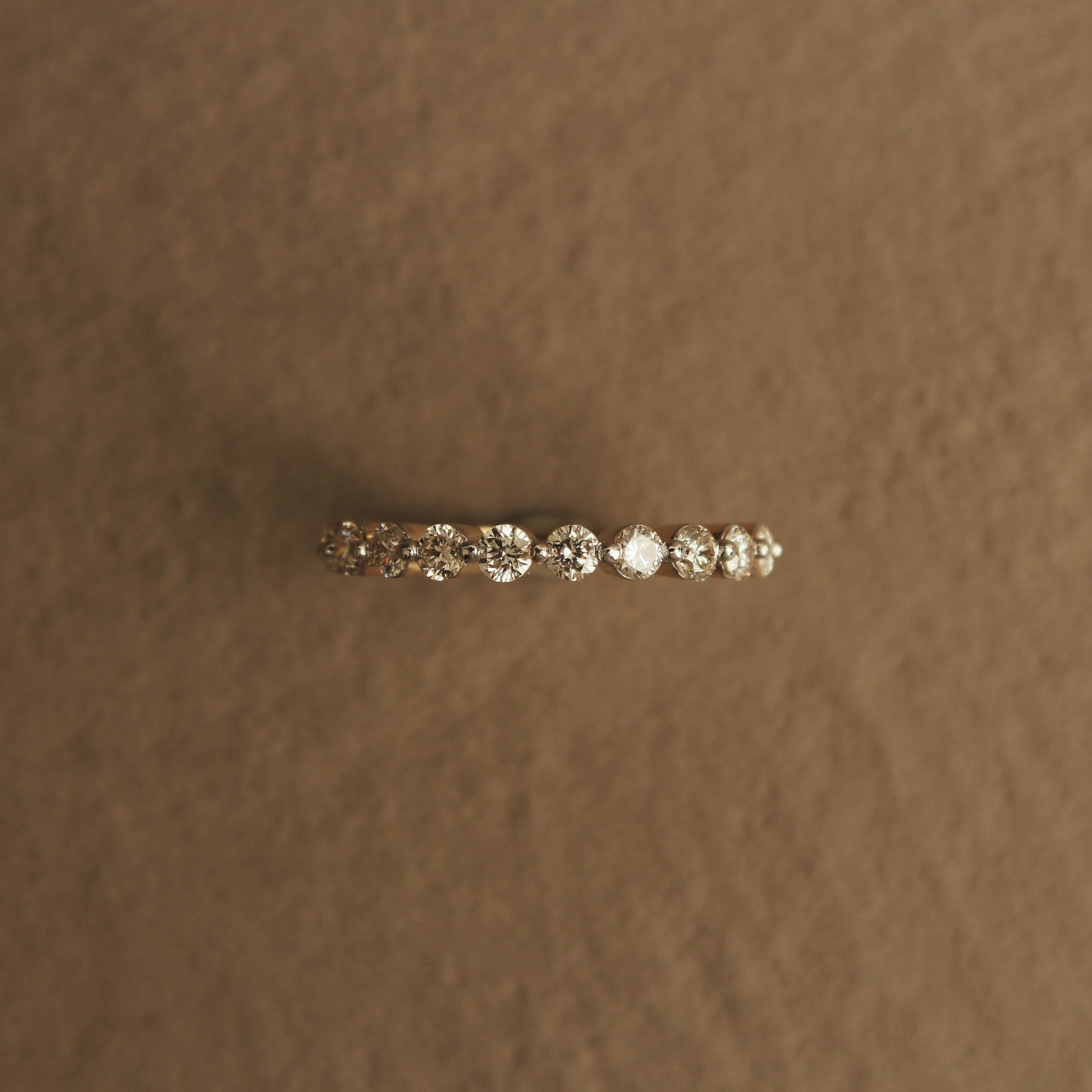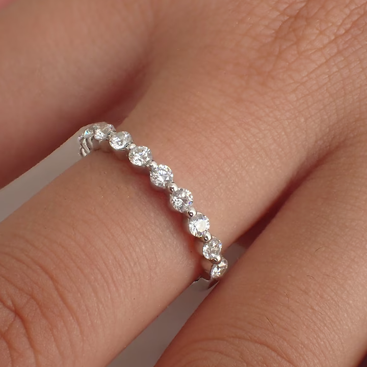 A fine series of excellent round cut diamonds mesmerize you with flawless sparkle arranged elegantly in a basket prong setting. Wear our Round Diamond Half-Eternity band solo, stack with others or add a stylish and graceful edge to your wedding band. Full eternity options can be custom-made.