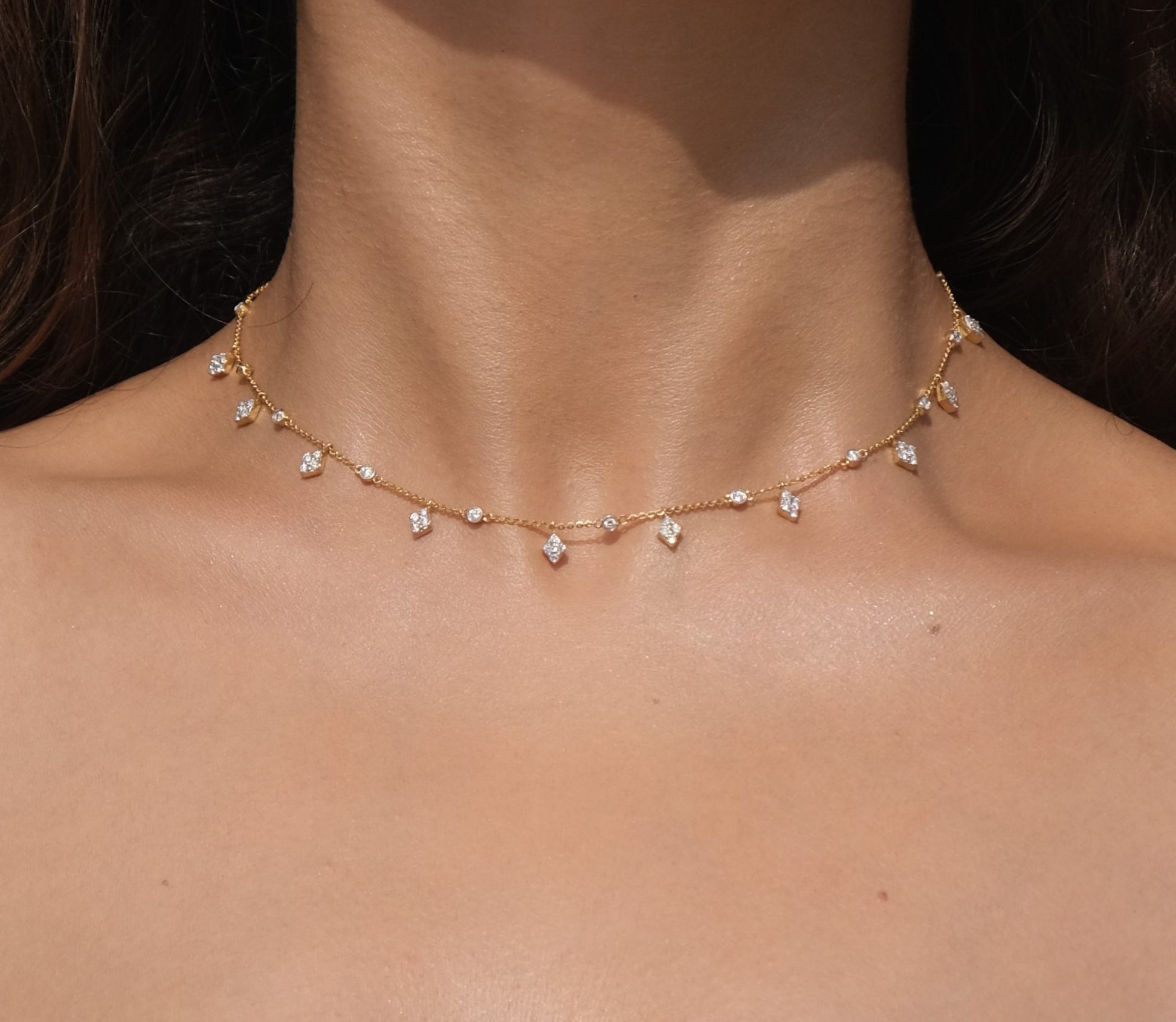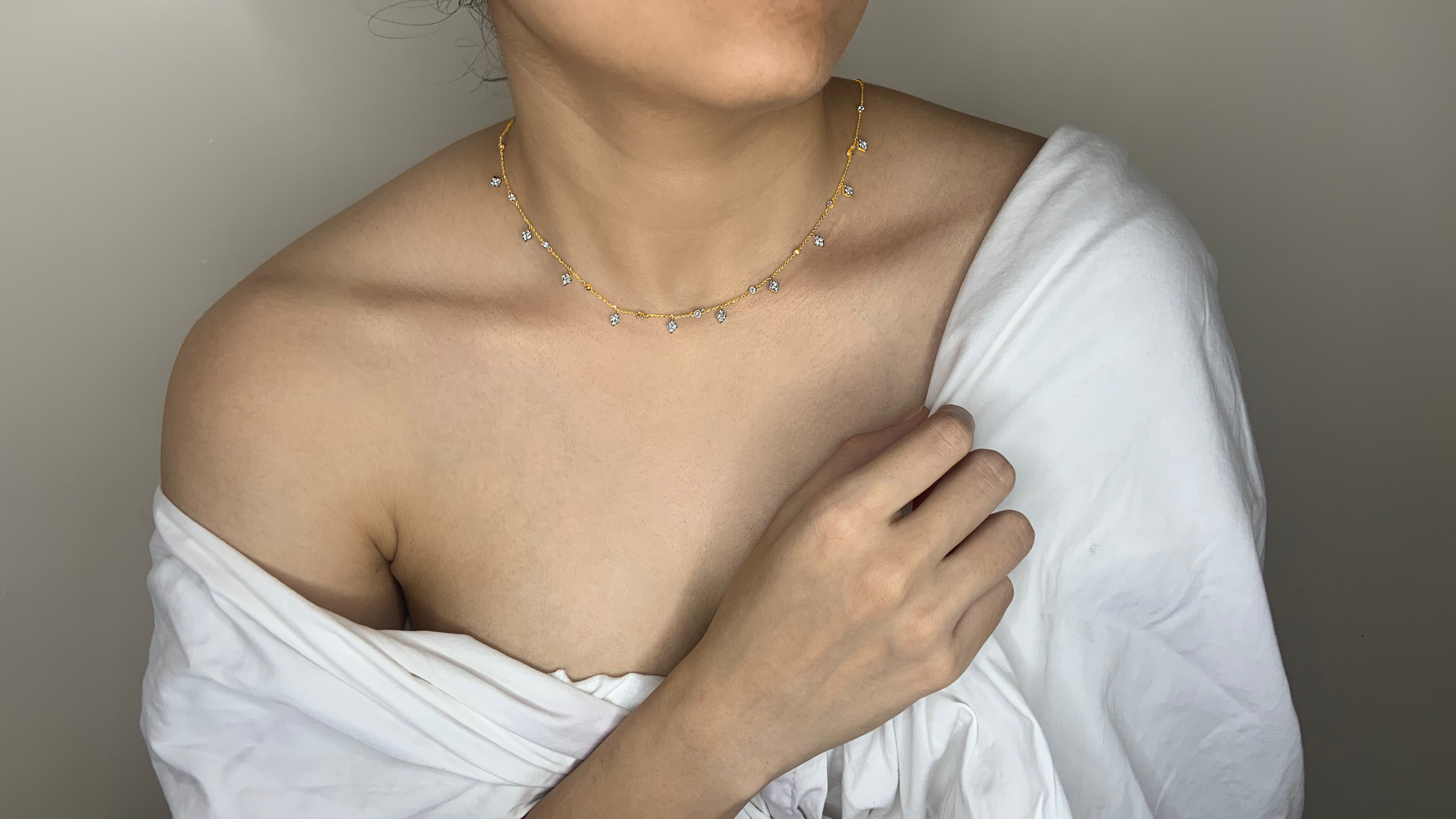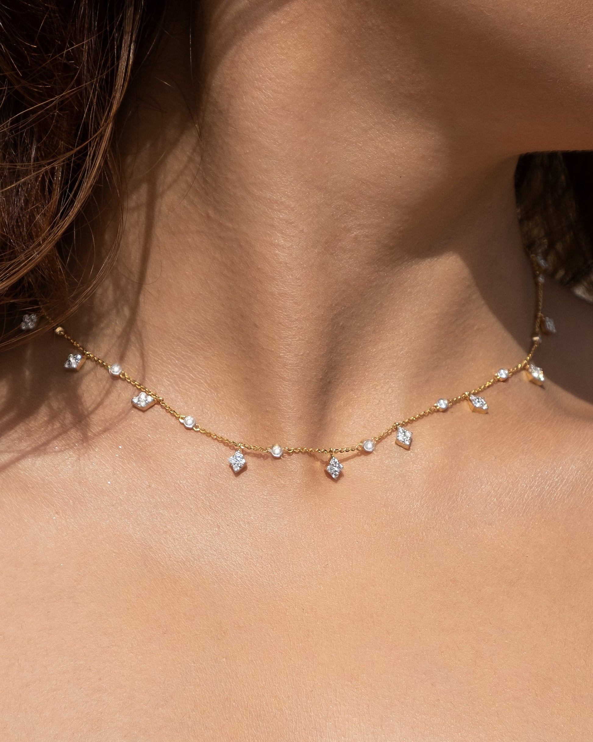 How to make humble days shine? A nod to our Scattered Diamond Necklace, with freshly suspended round brilliant diamonds. The Necklace will catch the low winter light, the high winter sun, and radiate cheer, all at once. Makes for a beautiful statement piece and casts a flinty glow. Available in 18k Solid Gold.