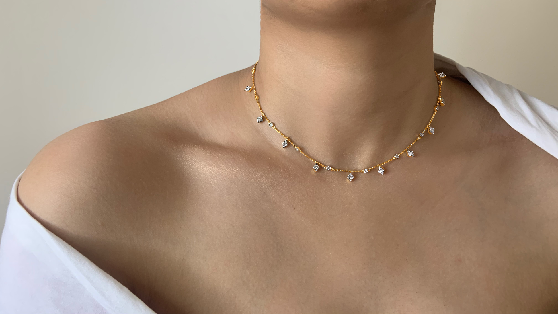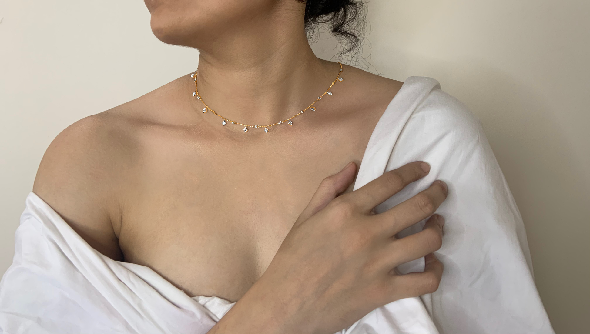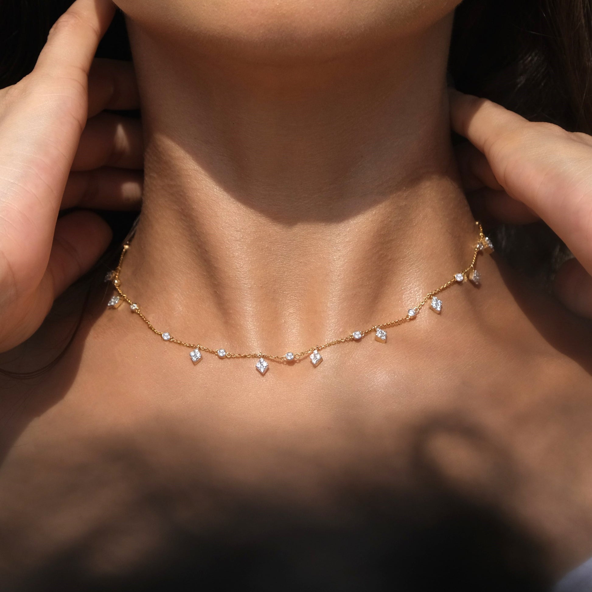 How to make humble days shine? A nod to our Scattered Diamond Necklace, with freshly suspended round brilliant diamonds. The Necklace will catch the low winter light, the high winter sun, and radiate cheer, all at once. Makes for a beautiful statement piece and casts a flinty glow. Available in 18k Solid Gold.